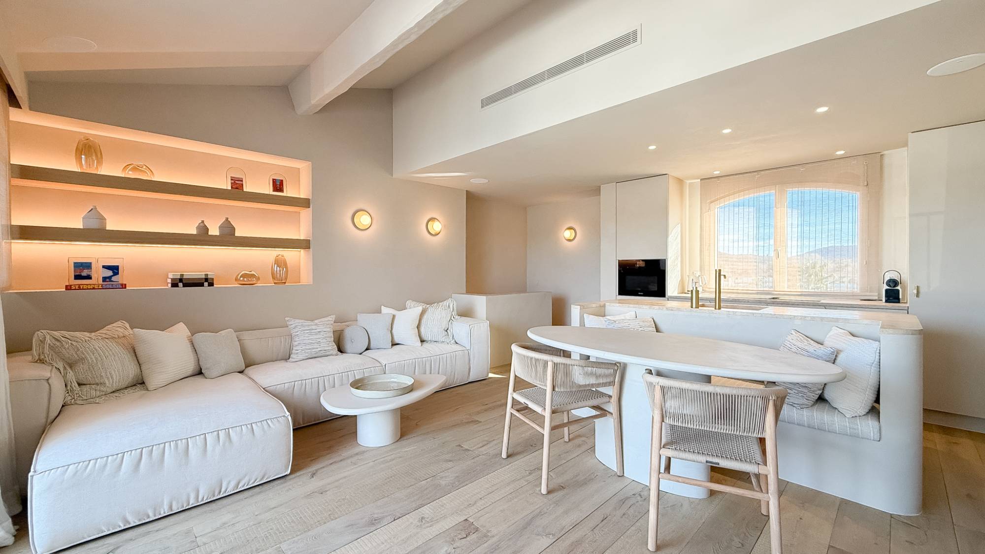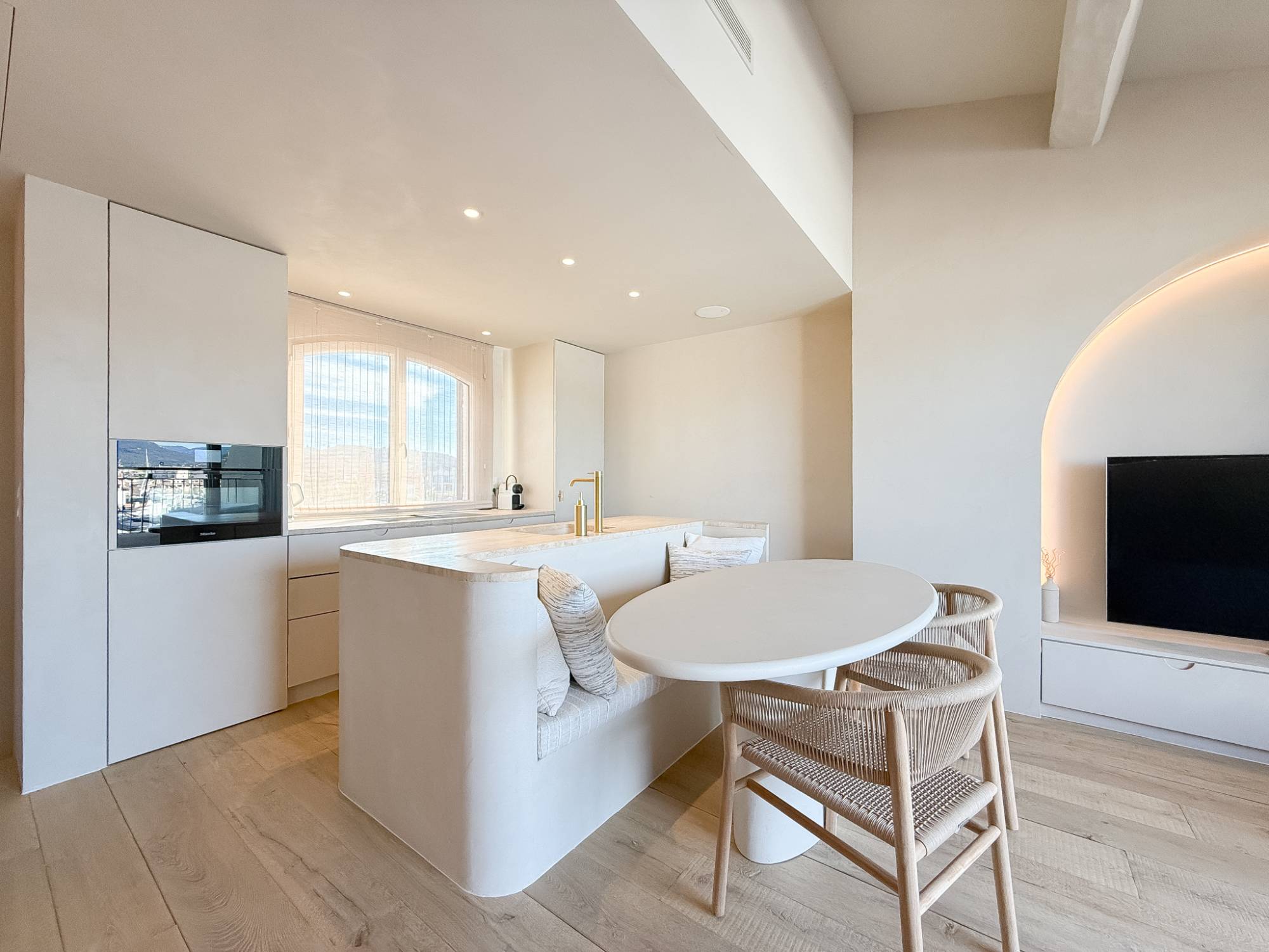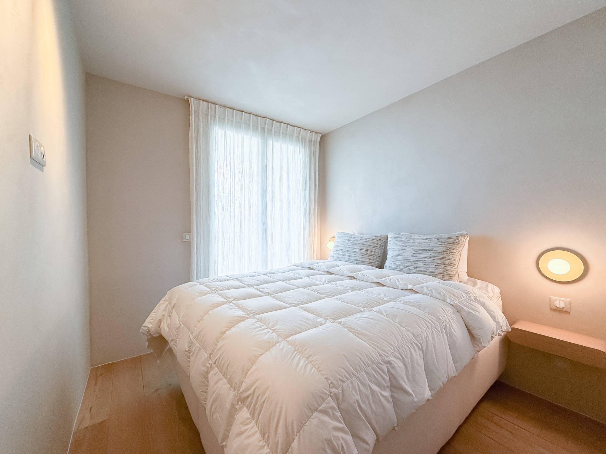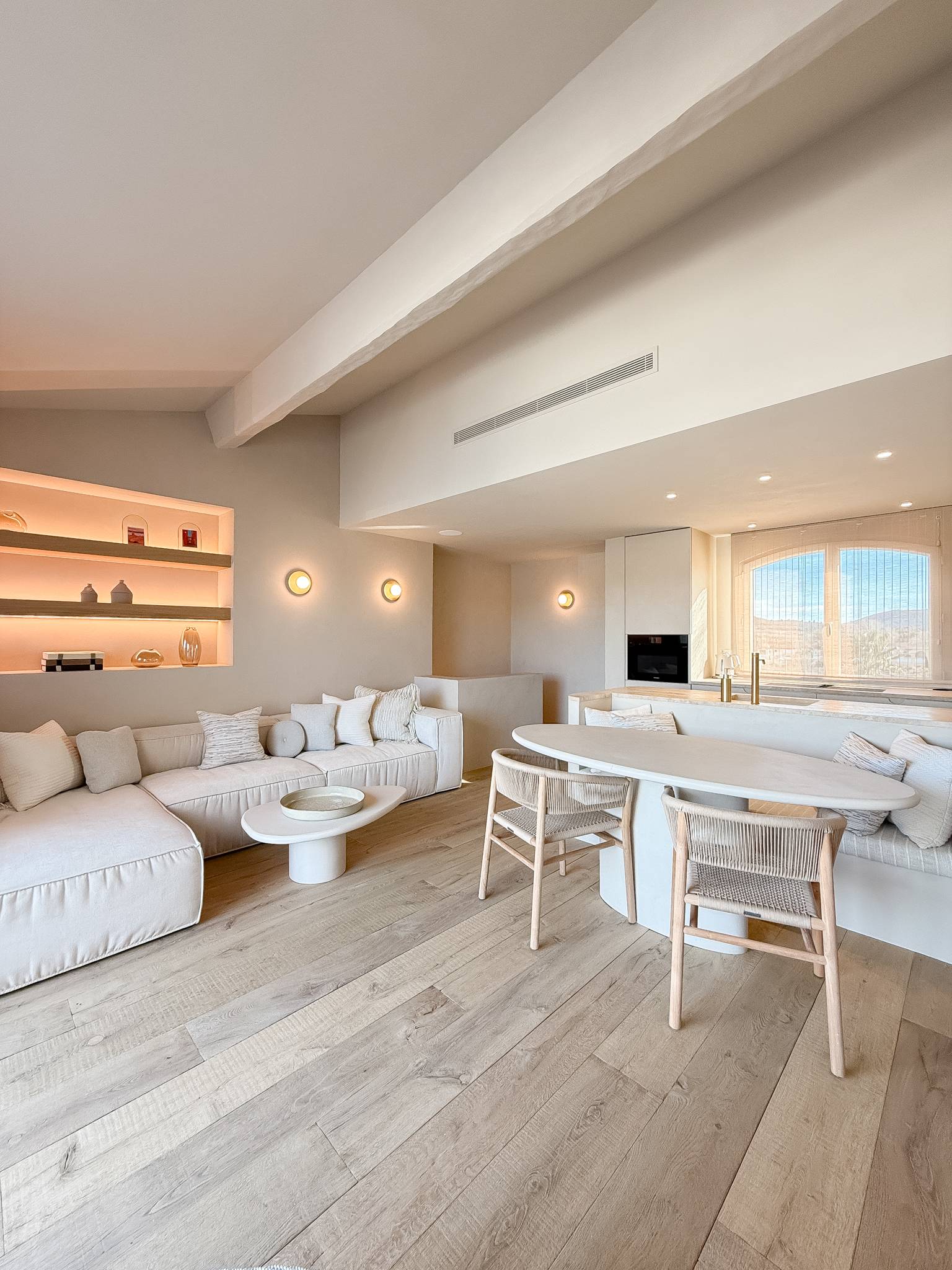 De grote ramen en open ruimtes zorgen voor een overvloed aan natuurlijk licht, waardoor binnen- en buitenruimtes moeiteloos in elkaar overlopen. Het panoramische uitzicht op de glinsterende zee en de luxe jachten vormt het stralende middelpunt van de woning. Het interieur straalt verfijning uit met een neutraal kleurenpalet, strakke lijnen en een vloer van authentieke Franse eik die een tijdloze charme toevoegt.