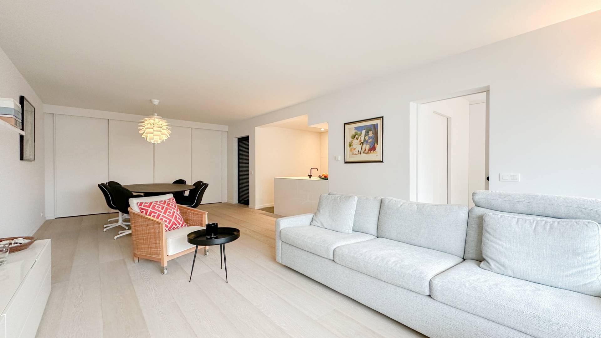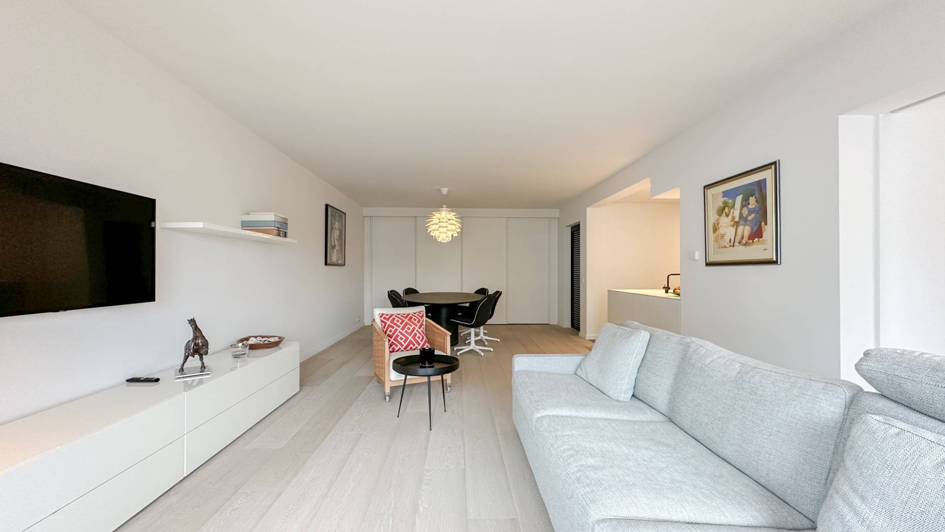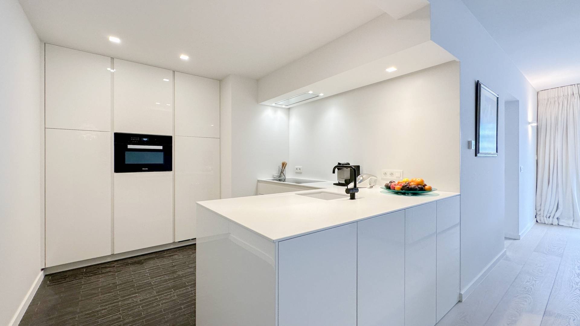 Samenstelling: Inkomhal met vestiaire en gastentoilet. Zonnige woonkamer die uitgeeft op een zonnig terras, met zicht over het Albertplein en de zee. Aansluitend bevindt zich de eetkamer. Volledig geïnstalleerde keuken, ingericht met Miele huishoudapparatuur.