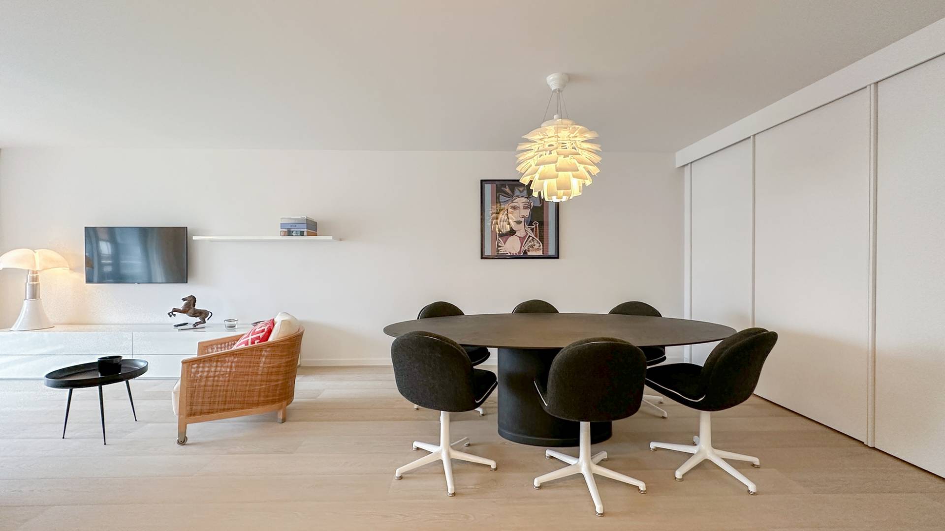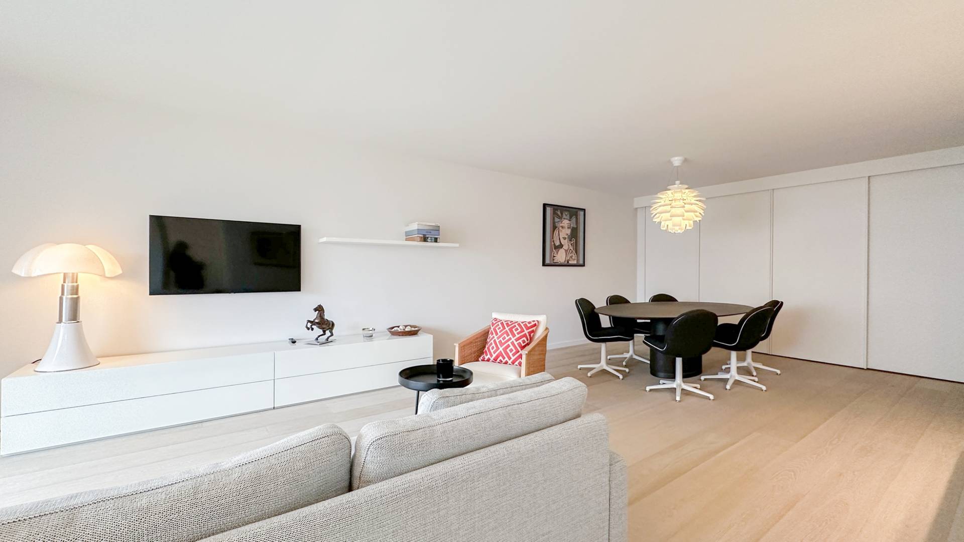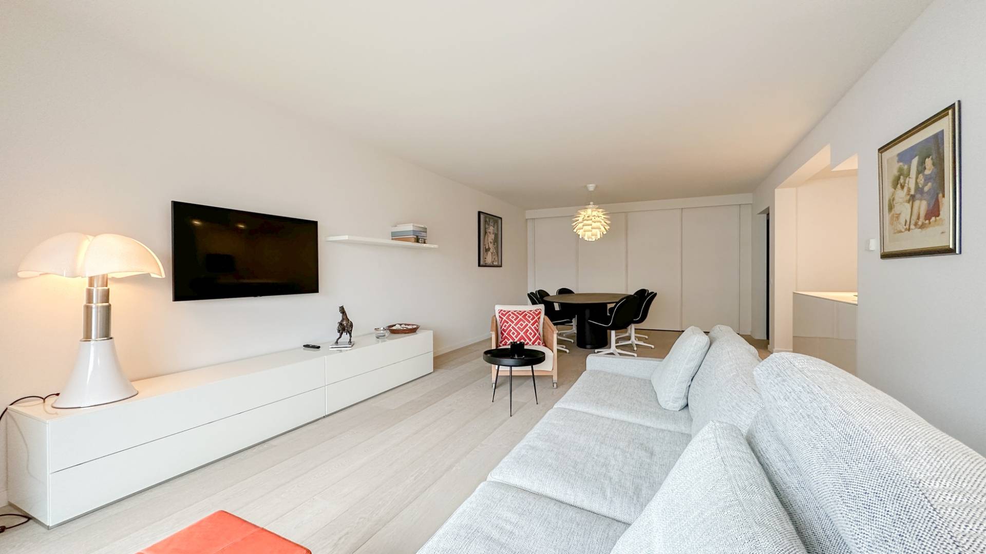 Samenstelling: Inkomhal met vestiaire en gastentoilet. Zonnige woonkamer die uitgeeft op een zonnig terras, met zicht over het Albertplein en de zee. Aansluitend bevindt zich de eetkamer. Volledig geïnstalleerde keuken, ingericht met Miele huishoudapparatuur.