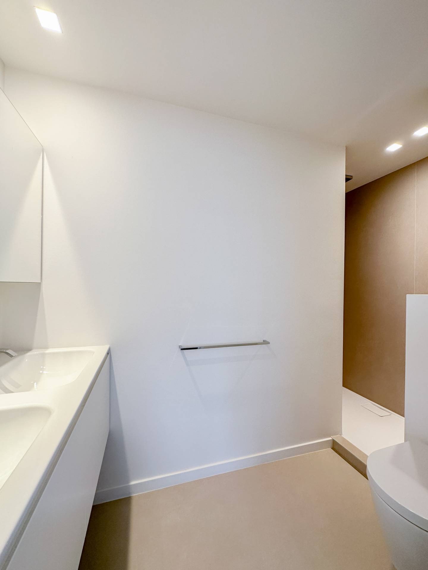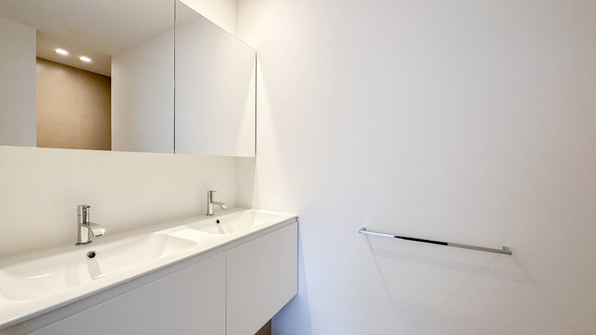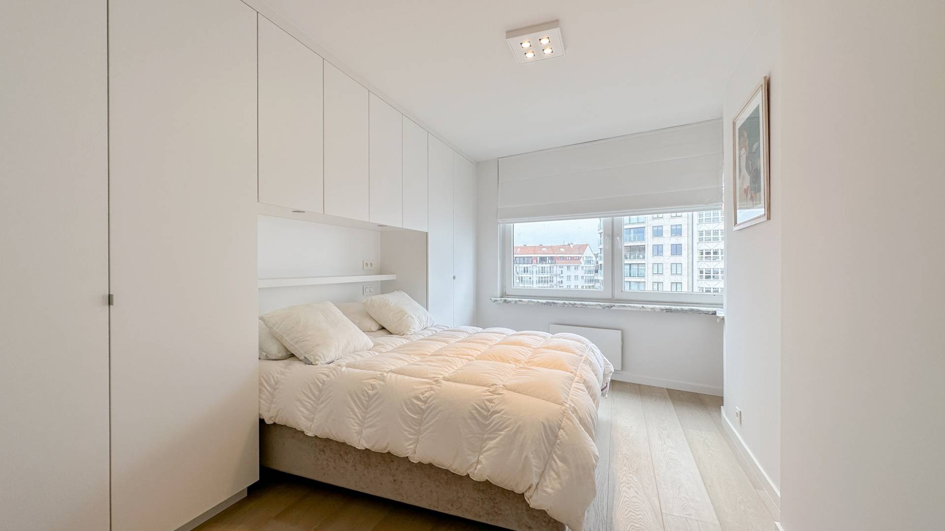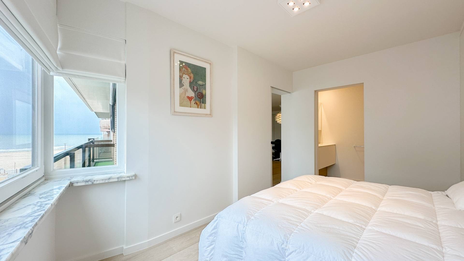 Er is 1 ruime, lichtrijke slaapkamer, die tevens geniet van het mooie zicht op zee. Tal van ingemaakte kasten. 1 Badkamer, voorzien van dubbele lavabo, inloopdouche en toilet.