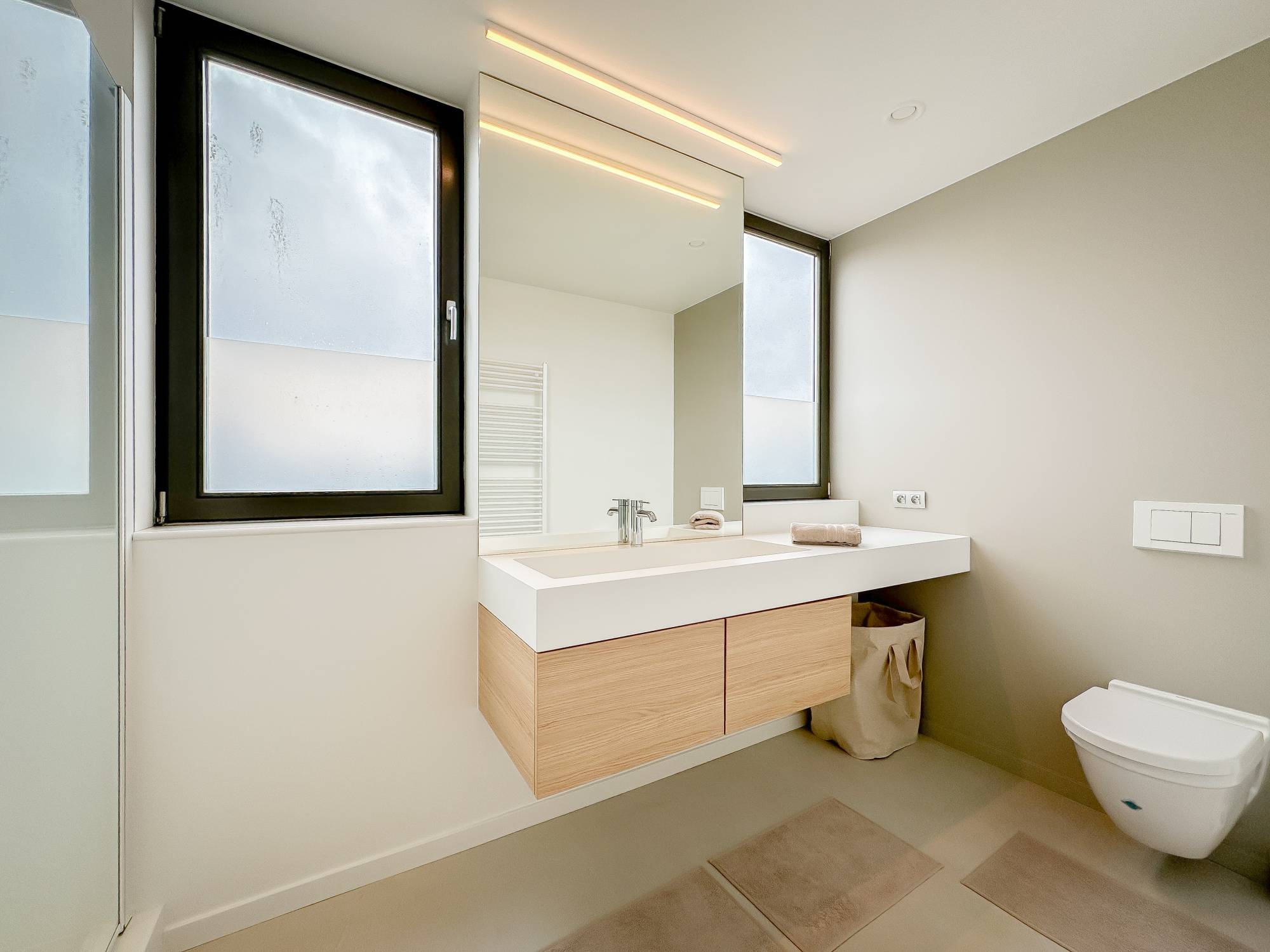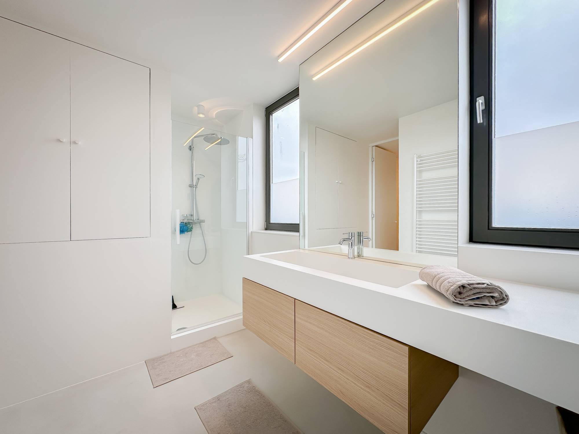 Indeling: De inkomhal leidt naar een gastentoilet. De open keuken, uitgerust met alle comfort en een eethoek, gaat over in de woonkamer die uitkomt op een aangenaam terras. Aan de achterzijde, op dezelfde verdieping, bevindt zich de 1e slaapkamer met dressing en een aangrenzende badkamer met dubbele lavabo en ligbad. Er is ook een berging met aansluiting voor een wasmachine.