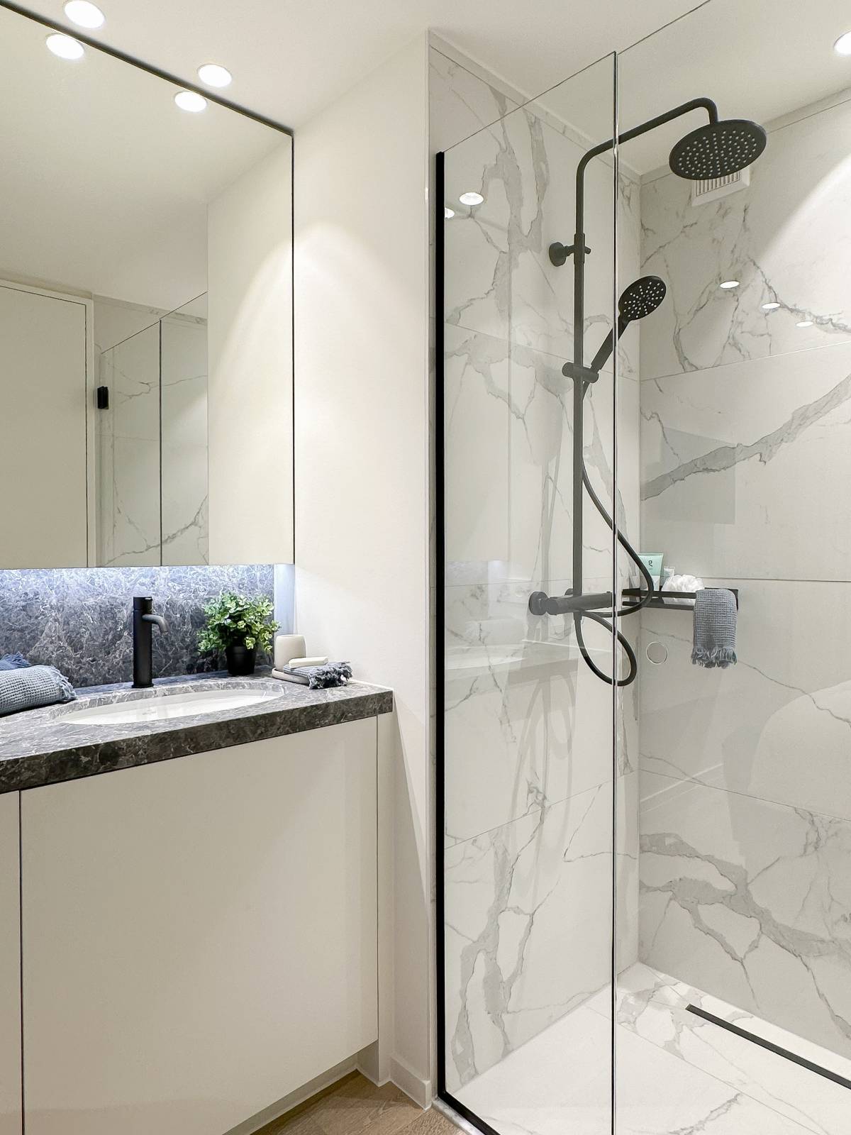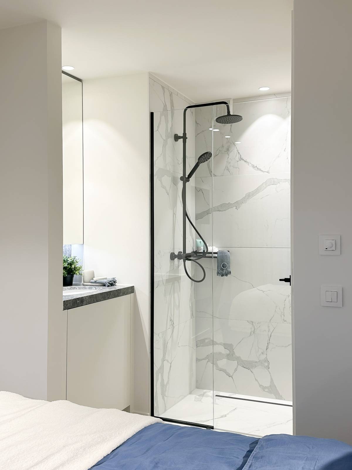 Achteraan bevinden zich twee ruime en volwaardige slaapkamers, elk voorzien van ingemaakte kasten en een eigen en-suite doucheruimte. Beide kamers bieden toegang tot het tweede zonnige terras van 22m², een ideale plek om te ontspannen in alle rust.