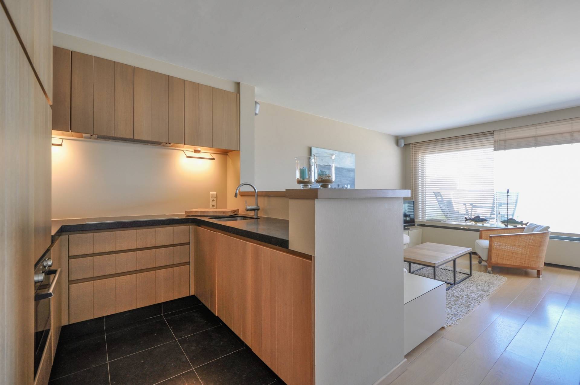 Samenstelling: Aangename woonkamer in parket met aansluitend eethoek, uitgevend op een prachtig en zeer ruim terras, genietend van frontaal zeezicht! Open keuken, voorzien van alle moderne comfort. Gastentoilet. Tal van ingemaakte kasten.