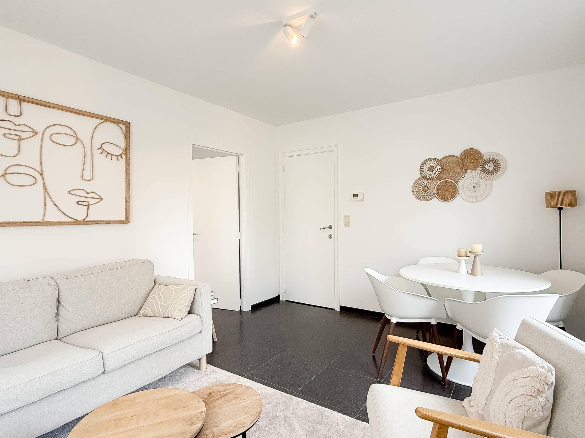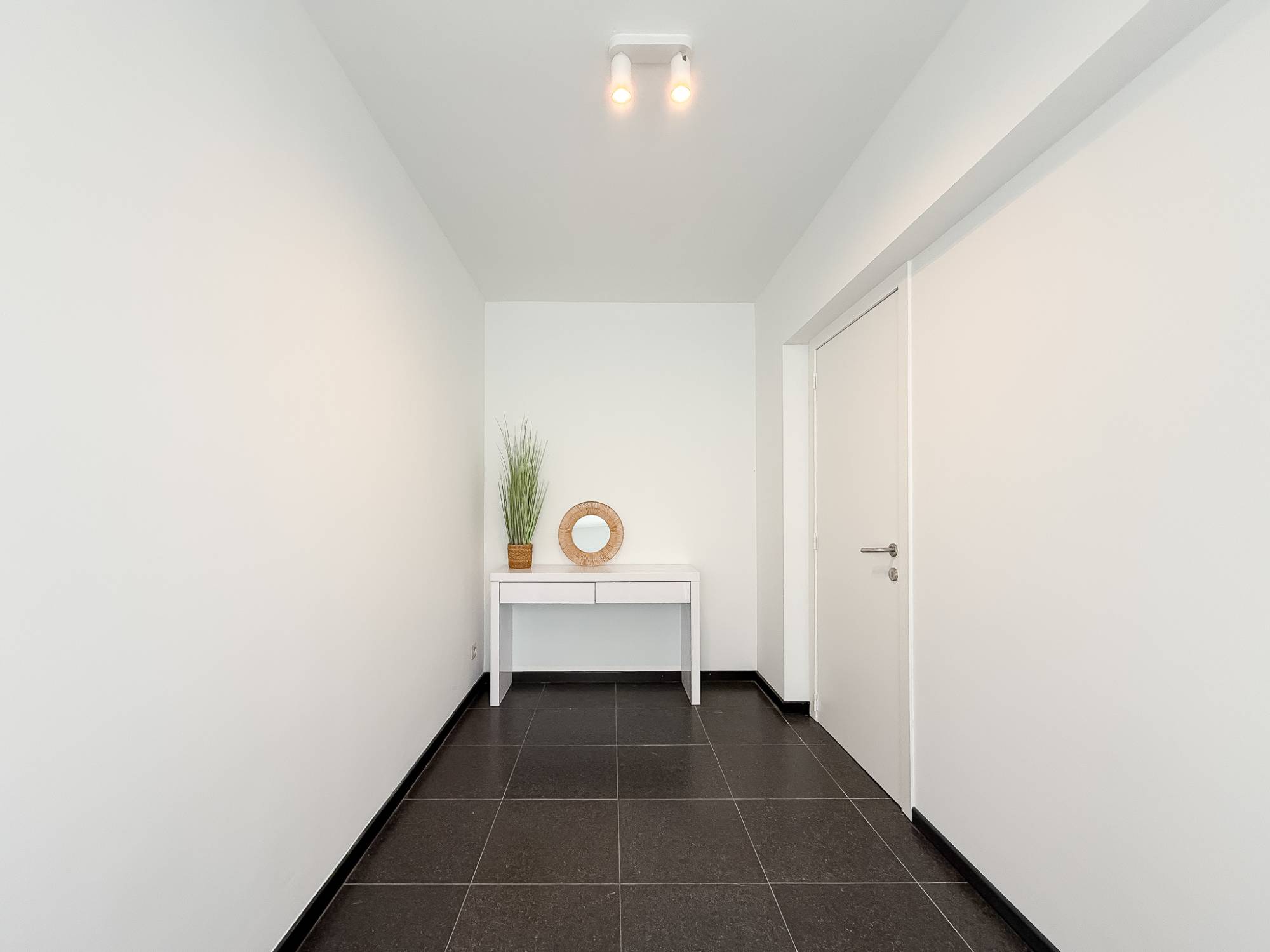 Het appartement biedt een aangename en praktische indeling met een inkomhal en gastentoilet. De volledig uitgeruste keuken sluit naadloos aan op de lichtrijke leefruimte, waar het hoekkarakter zorgt voor extra lichtinval en een open gevoel.