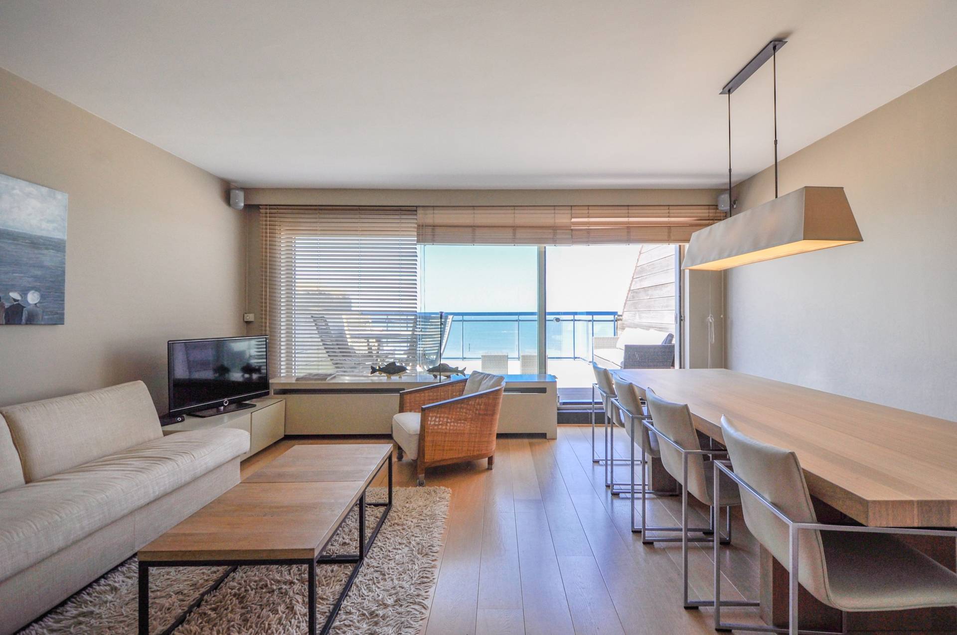 Samenstelling: Aangename woonkamer in parket met aansluitend eethoek, uitgevend op een prachtig en zeer ruim terras, genietend van frontaal zeezicht! Open keuken, voorzien van alle moderne comfort. Gastentoilet. Tal van ingemaakte kasten.