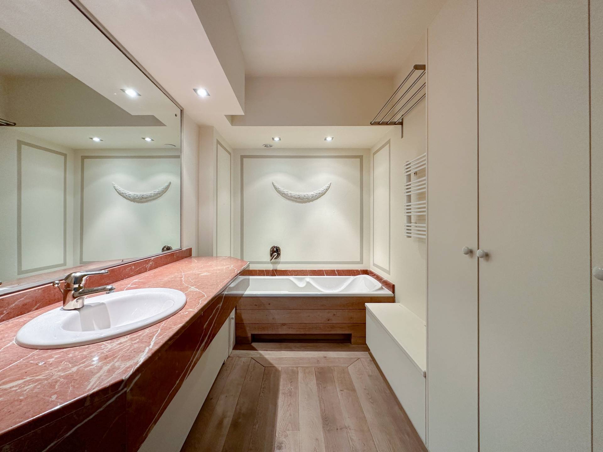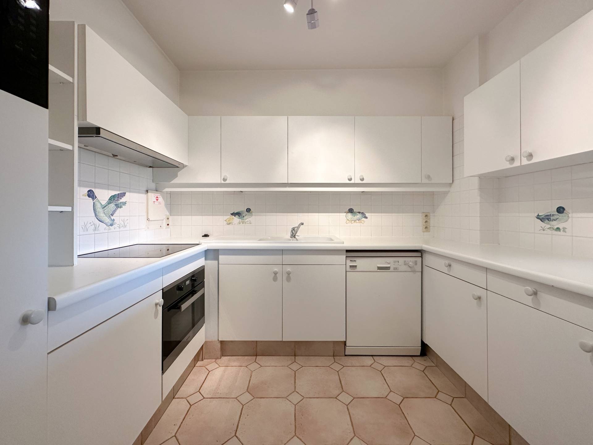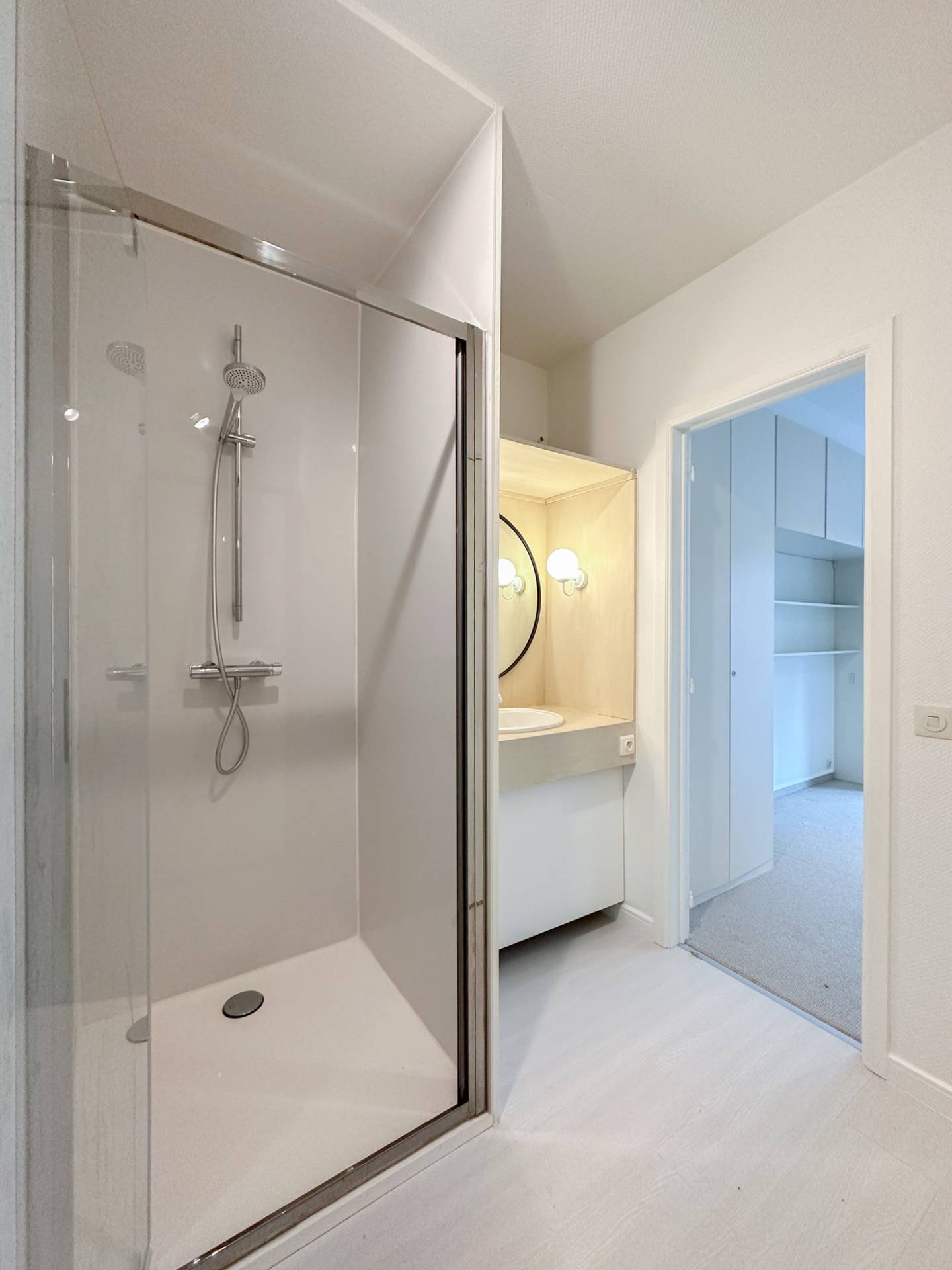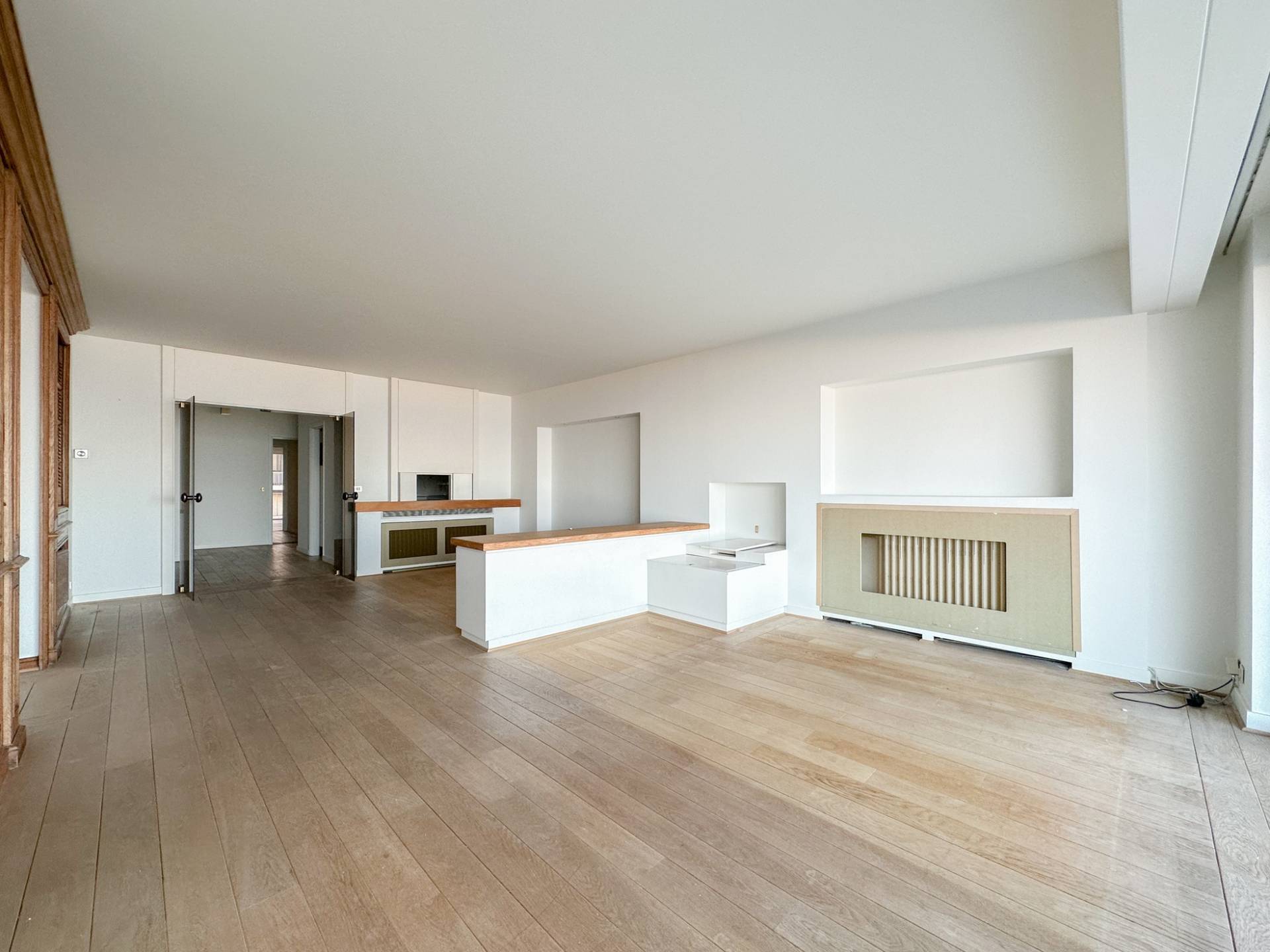 Achteraan bevinden er zich 2 volwaardige slaapkamers. 1 Luxueus ingerichte badkamer. Afzonderlijke ruimte met lavabomeubel en ingemaakte kast. Zonnig terras aan de achterzijde. Conciërge.
