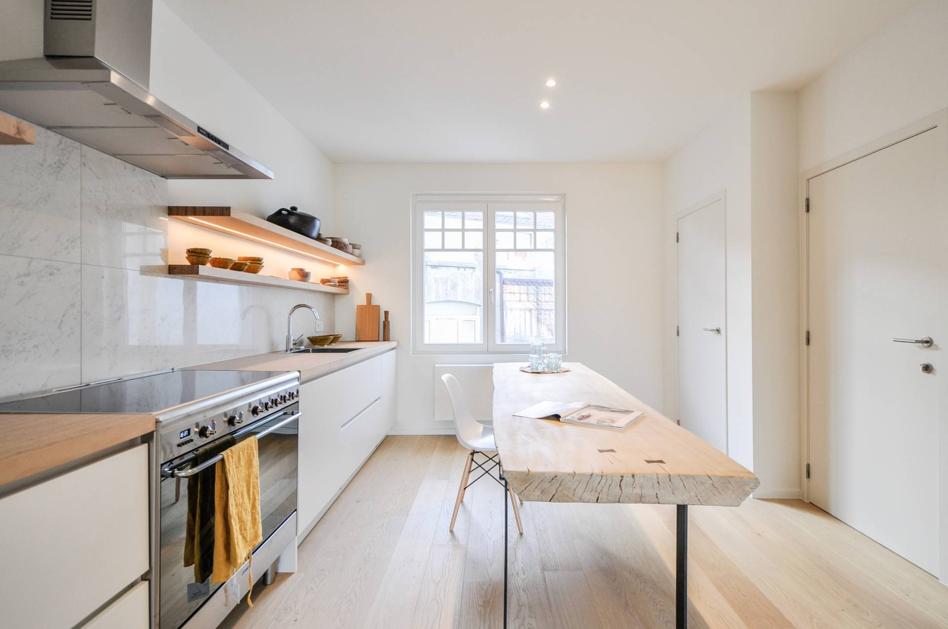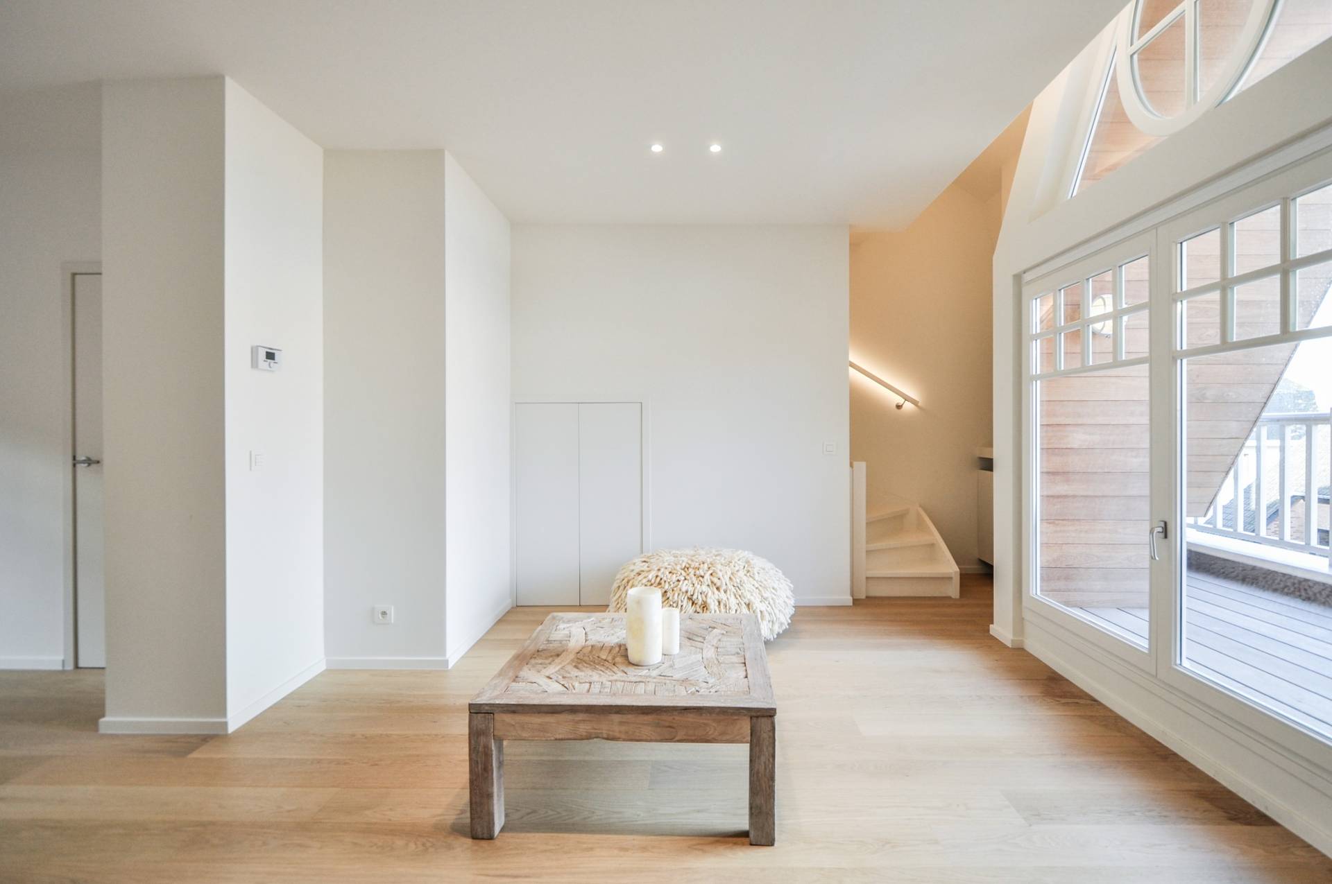 Het appartement bevindt zich in een charmant burgerhuis in typische "cottagestijl", die eveneens volledig gerenoveerd werd. Het appartement wordt niet-gemeubileerd verhuurd.