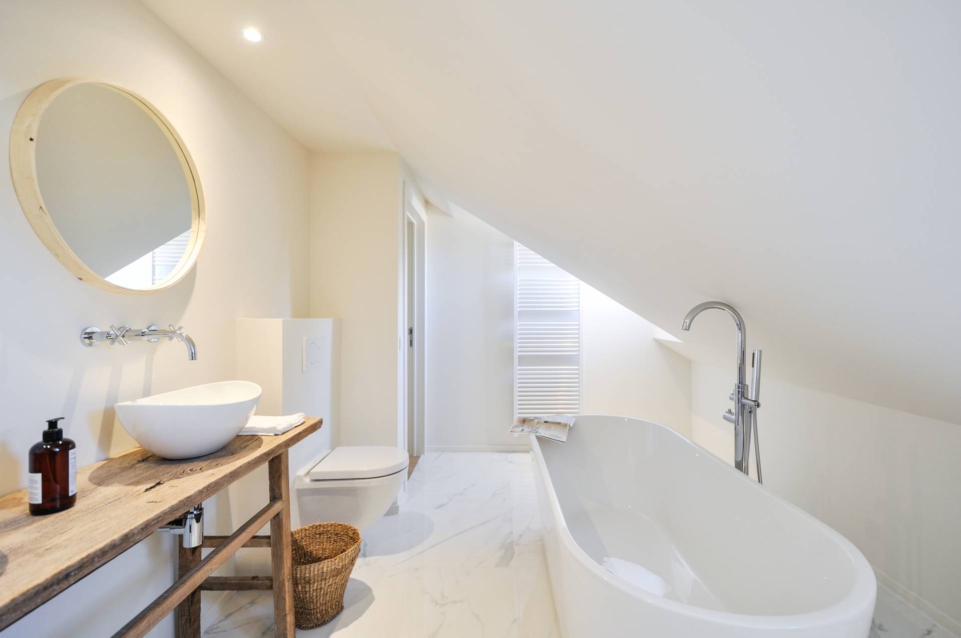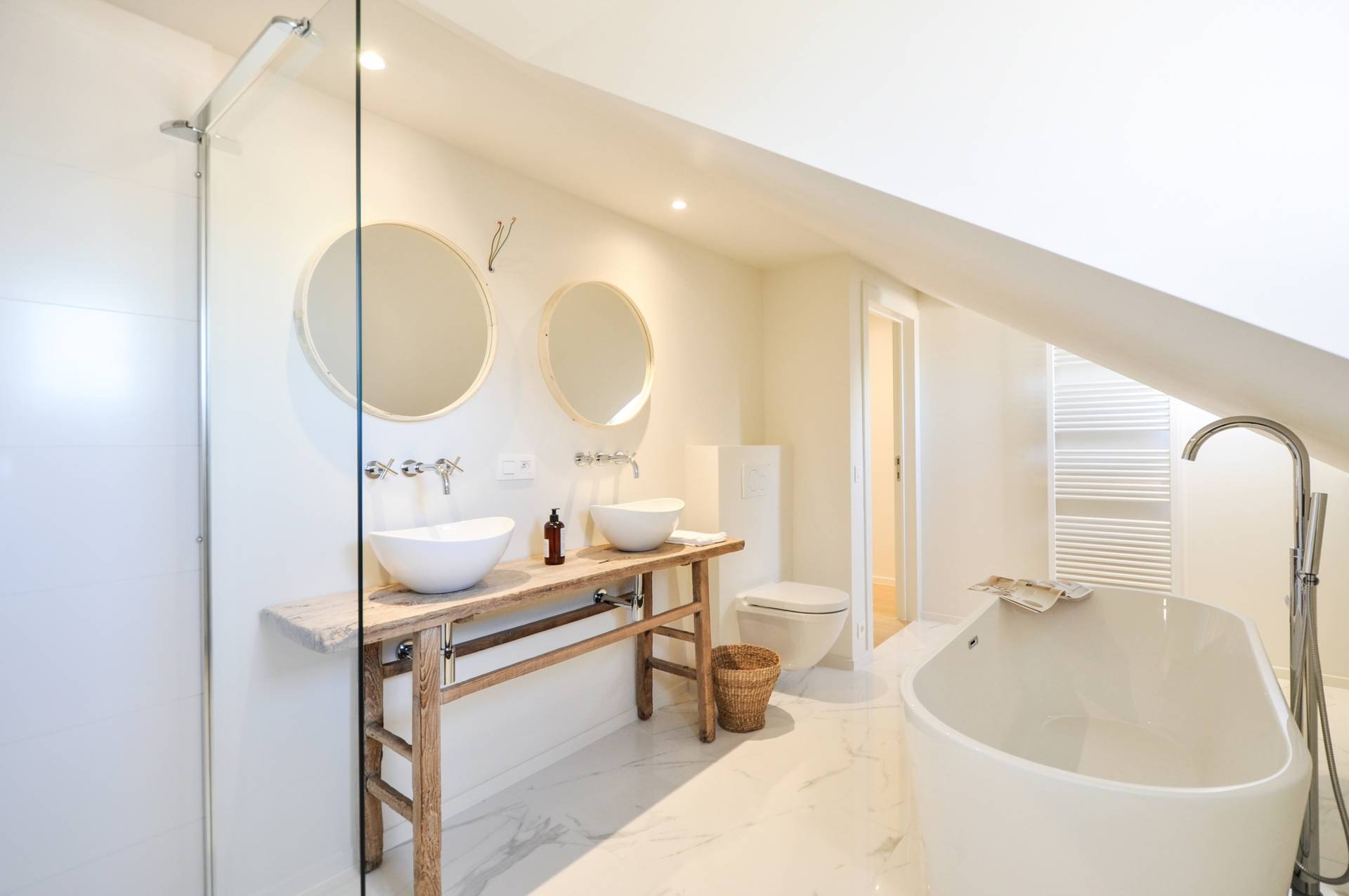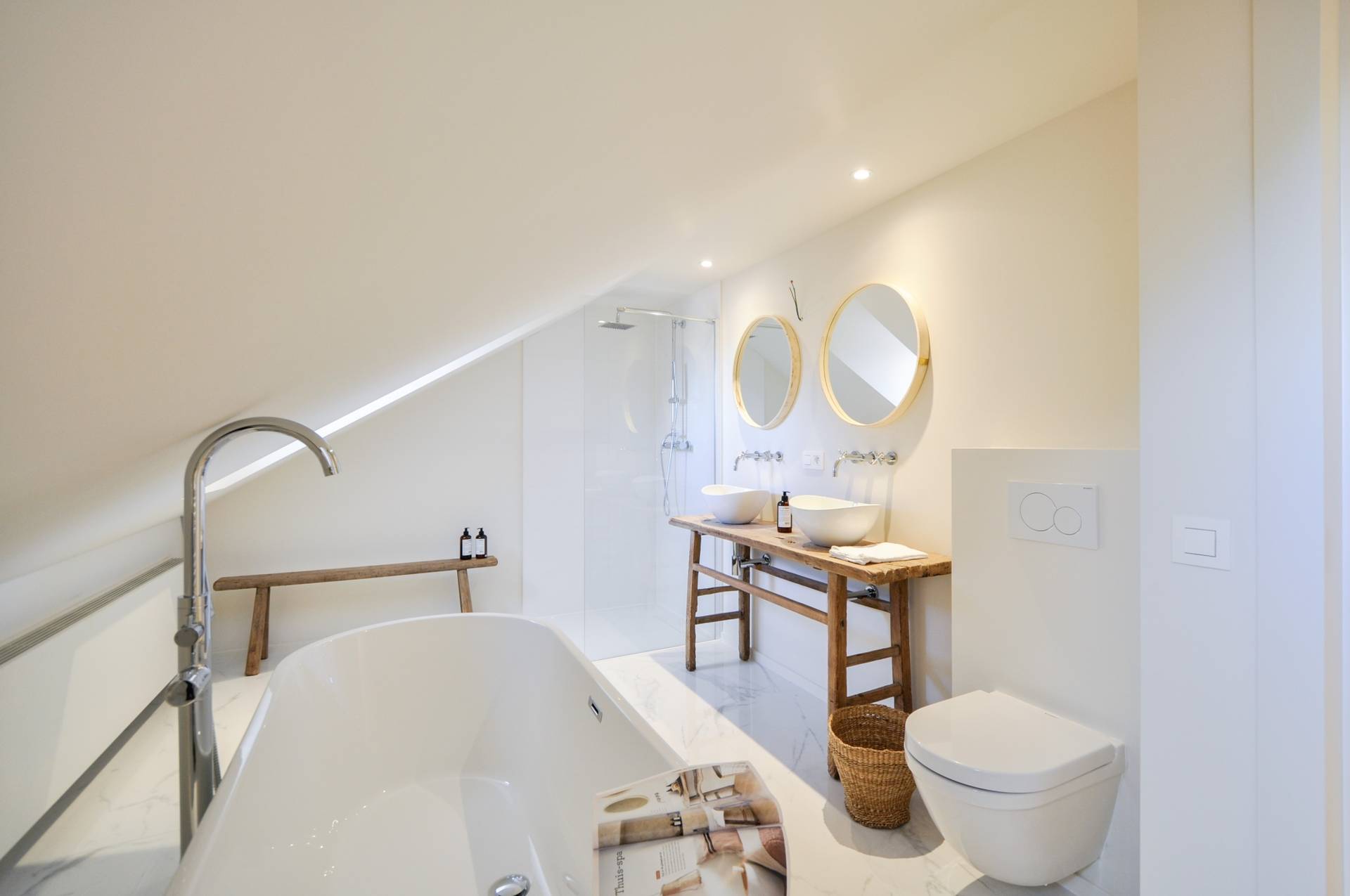 Op de bovenverdieping bevinden er zich nogmaals 2 slaapkamers. 1 Ruime, luxueus en cosy ingerichte badkamer met losstaand bad, douche, dubbele lavabo en toilet.