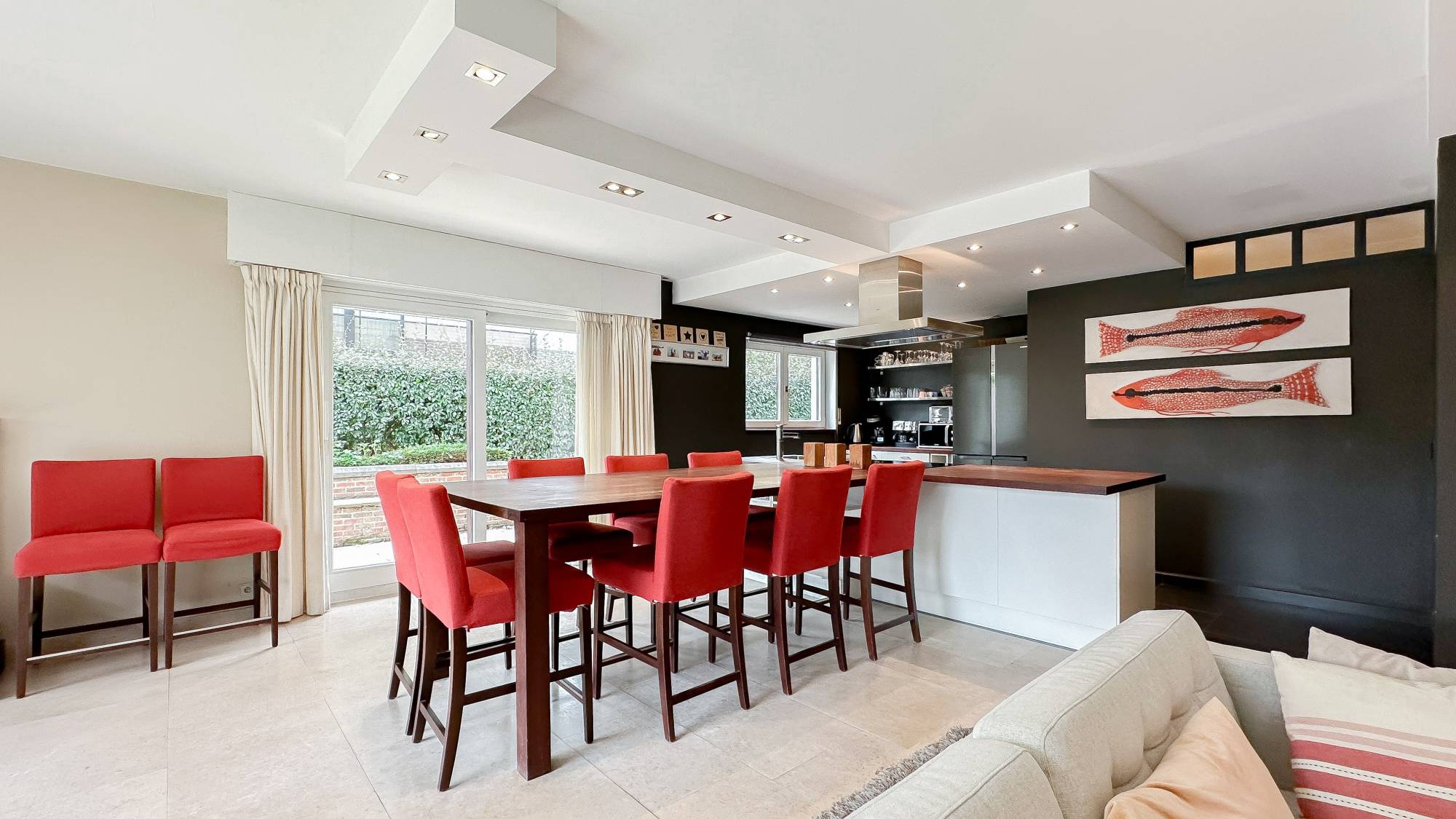 Samenstelling: Inkomhal met gastentoilet en vestiaire. Ruime woonkamer die uitgeeft op een terras, omgeven door groen. Er is een 2e, aangenaam terras aan de zijkant. Praktische, ruime, open keuken, voorzien van alle moderne comfort. Cosy eethoek.