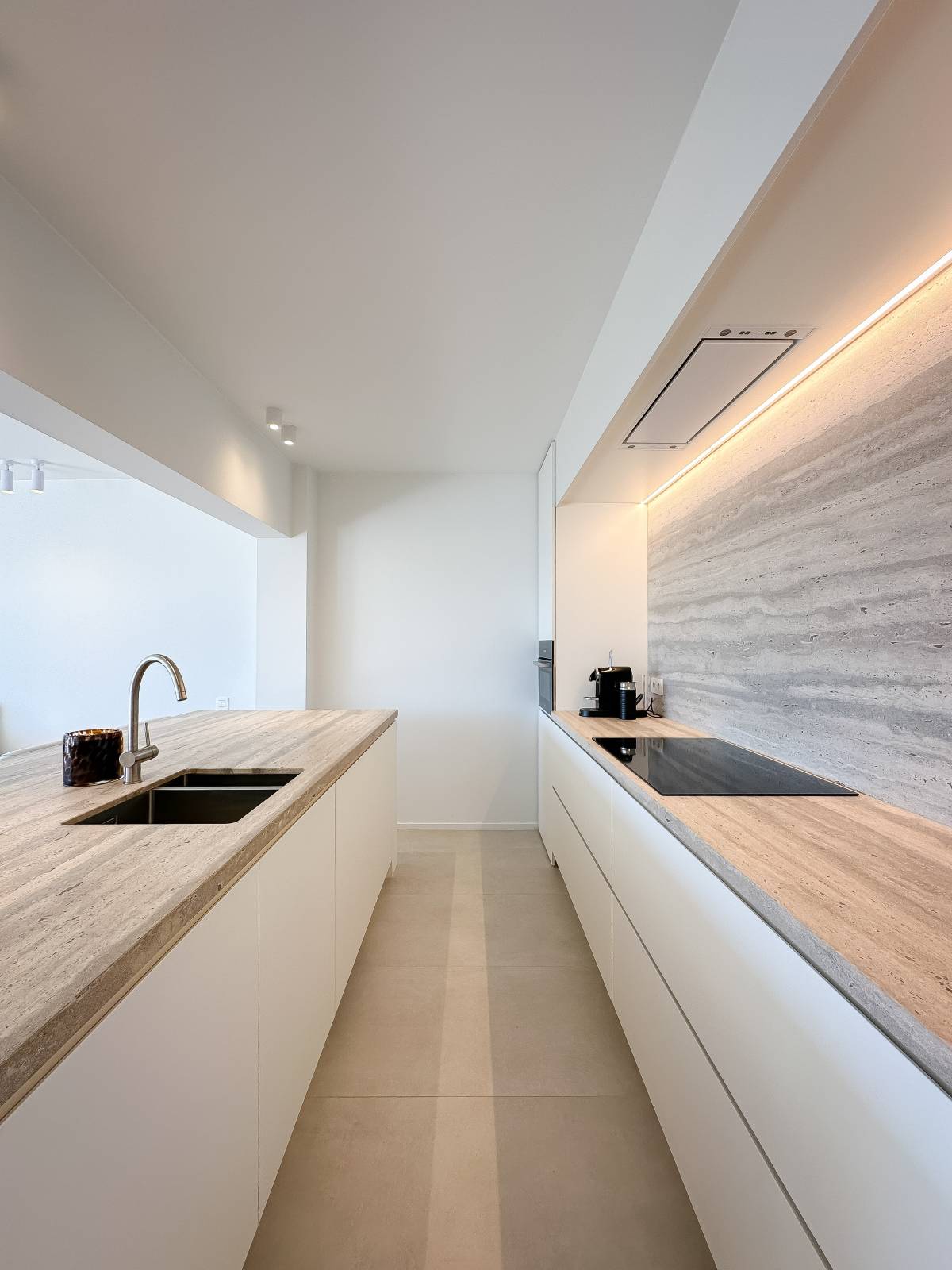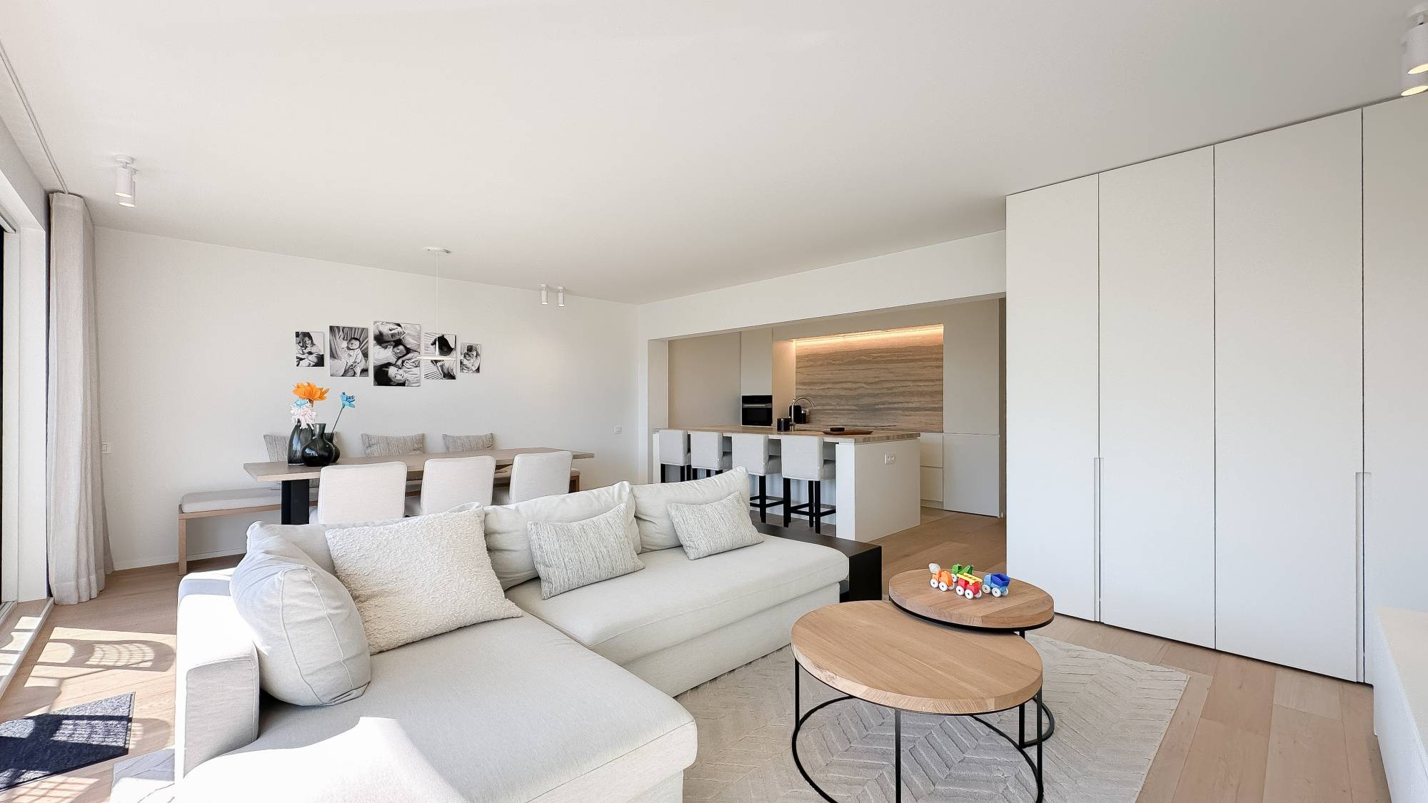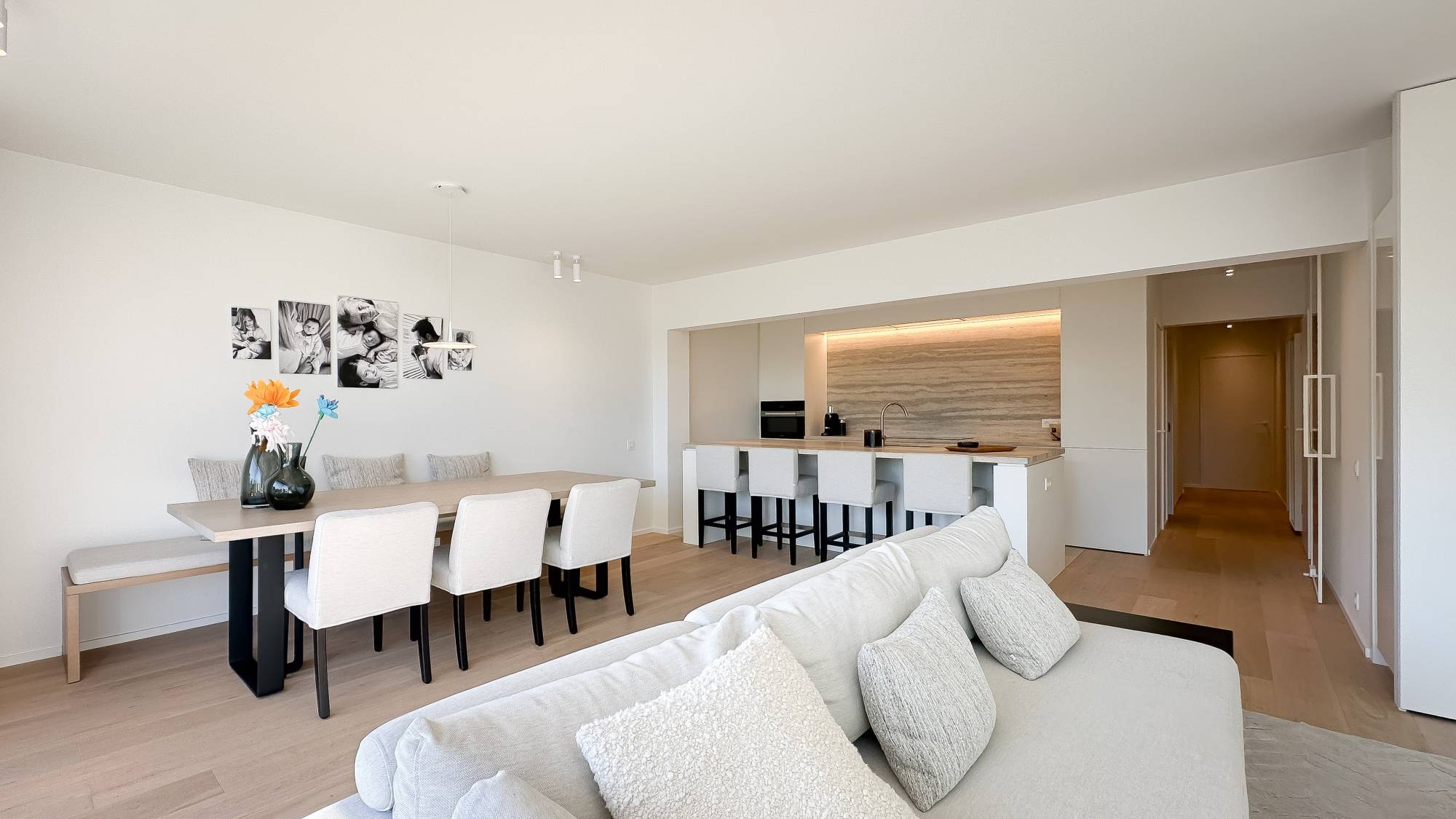 Indeling: Inkomhal met vestiaire en apart toilet. De lichte woon- en eetkamer met open keuken geven uit op een terras dat zich over de volledige gevelbreedte uitstrekt, met een prachtig open uitzicht over de villa's.