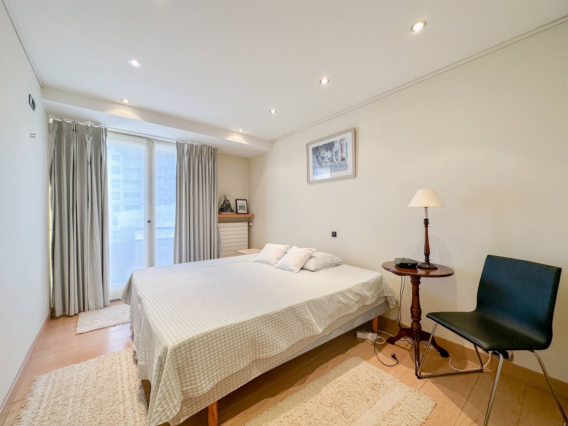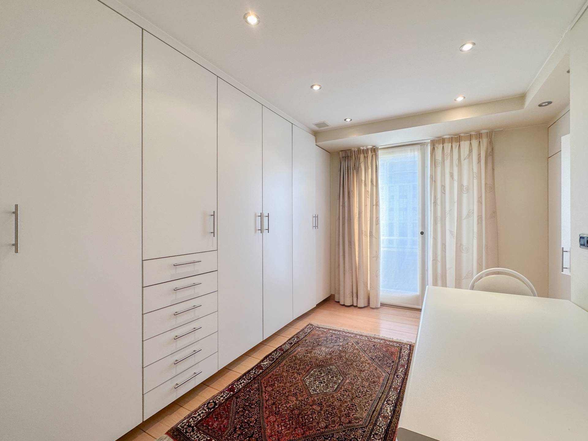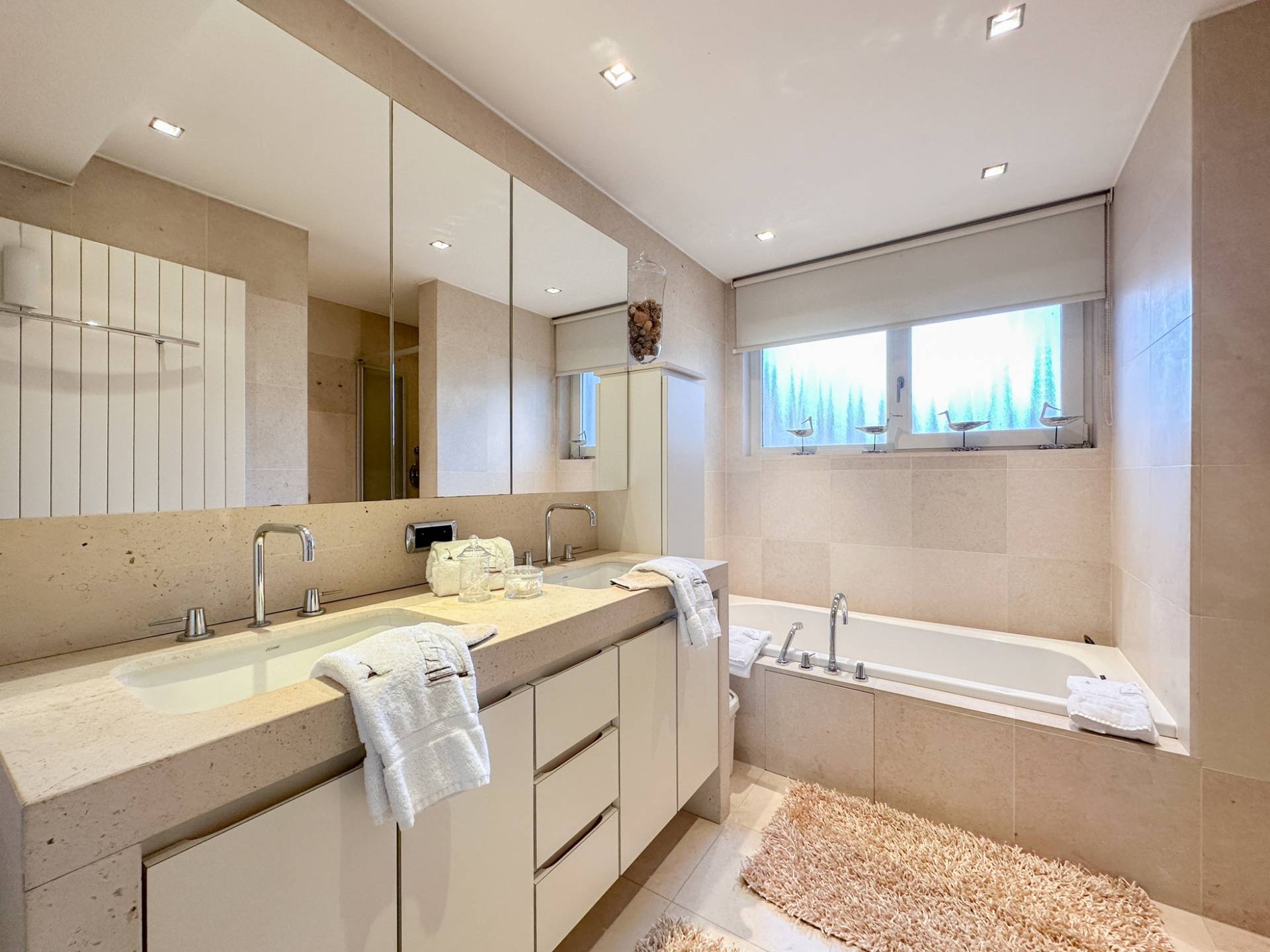 Achteraan bevinden er zich 3 volwaardige slaapkamers. De master bedroom heeft een luxueus ingerichte badkamer met ligbad, douche, toilet en dubbele lavabo. Grote dressing. De 2e slaapkamer beschikt over een eigen douchekamer. De 3e kamer is momenteel ingericht als bergruimte/dressing, waar zich ook de wasmachine/droogkast bevindt en een extra ingemaakte frigo.