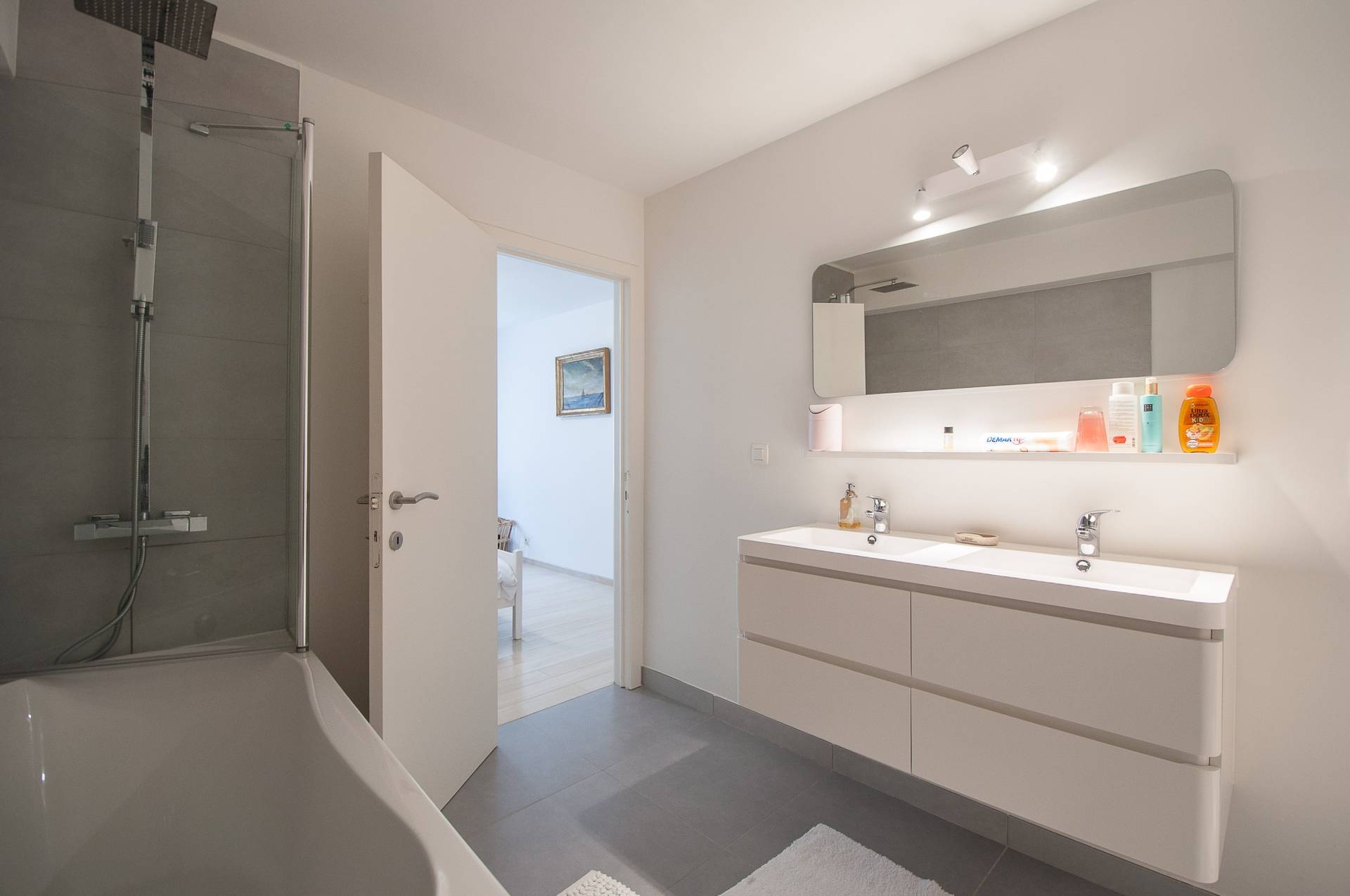 Samenstelling: Inkomhal met gastentoilet en vestiaire. Woonkamer en eetkamer bevinden zich naast mekaar en geven uit op een Zuidgericht terras, over de volledige gevelbreedte! Prachtig open zicht! Half open keuken, voorzien van alle moderne comfort.