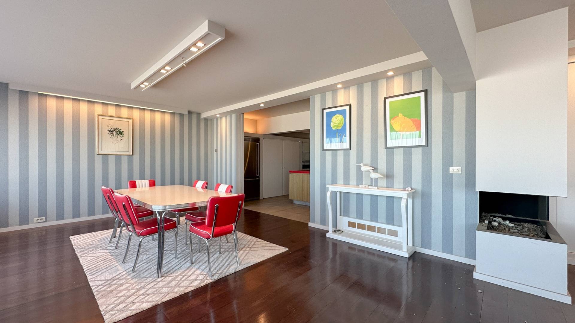 Samenstelling: Inkomhall met gastentoilet en vestiaire. Aangename woonkamer die de hoek vormt, prachtig zeezicht, met aansluitend eetkamer die eveneens zich op zee biedt. Open haard. Ruime keuken, voorzien van alle moderne comfort. Ruimte voor wasmachine en droogkast.