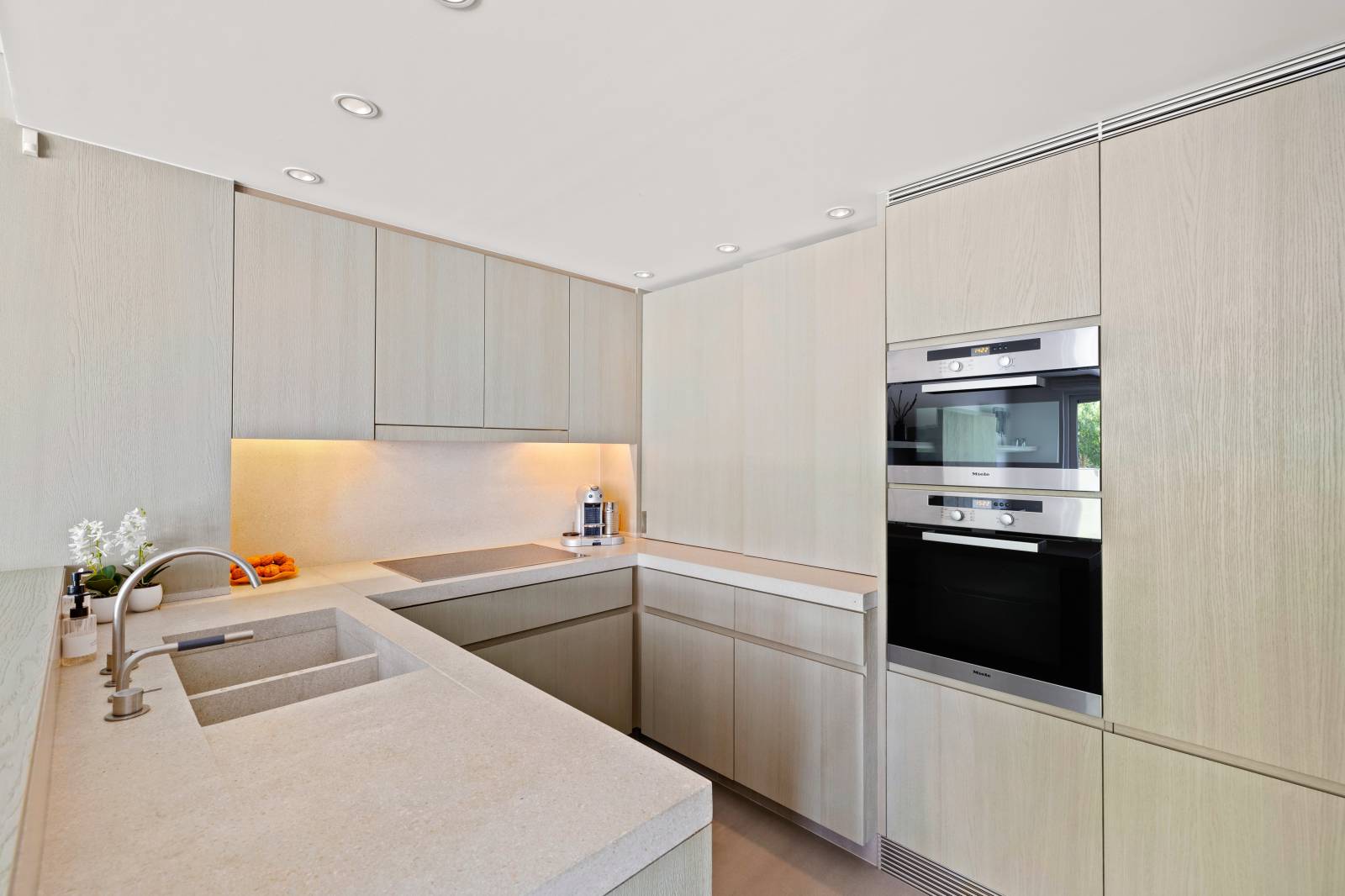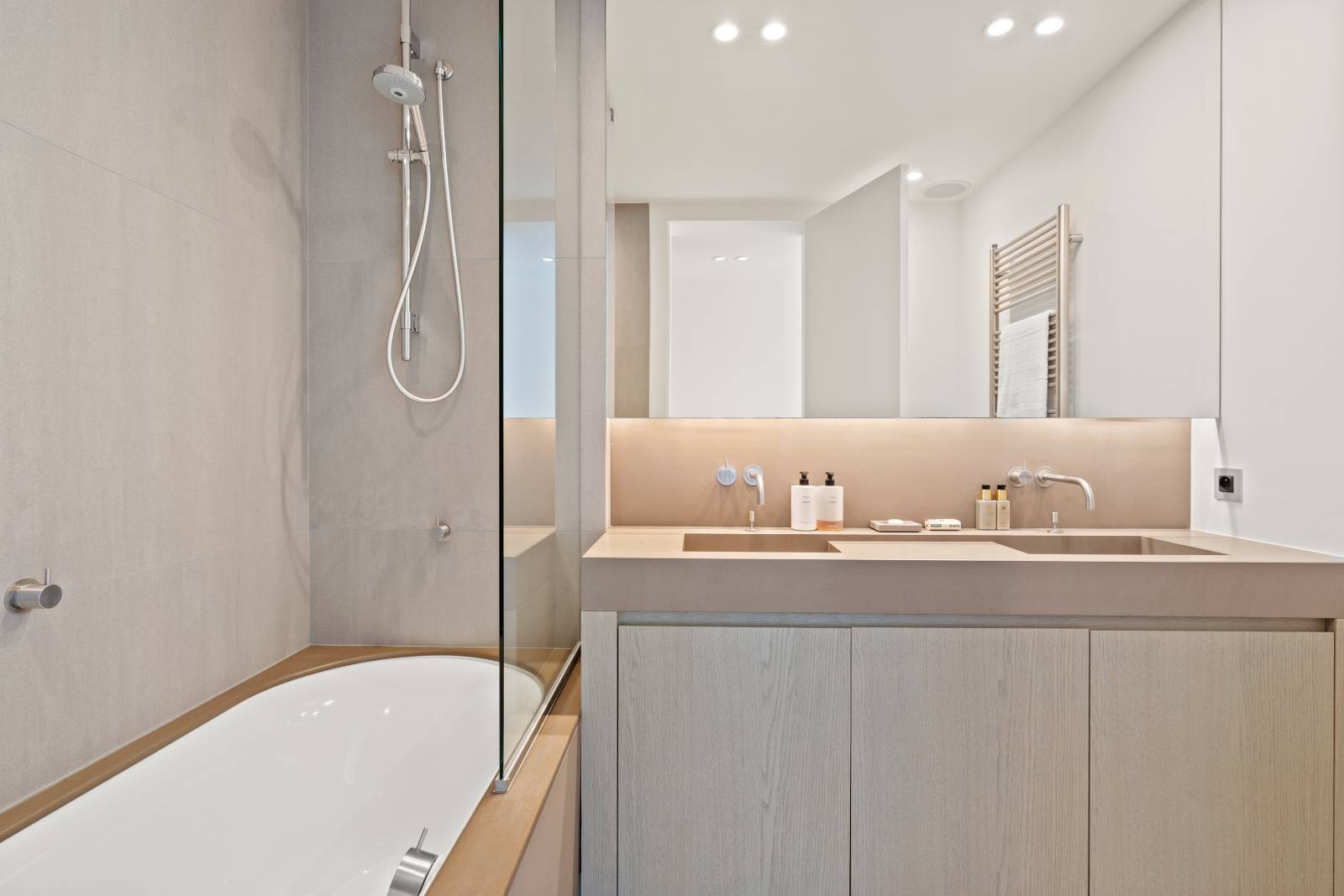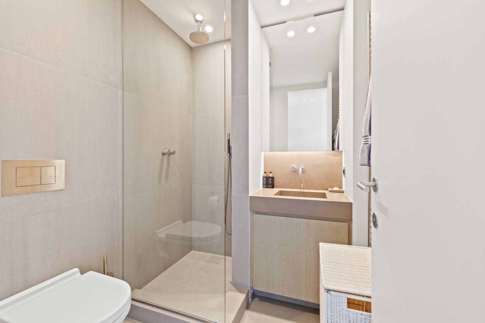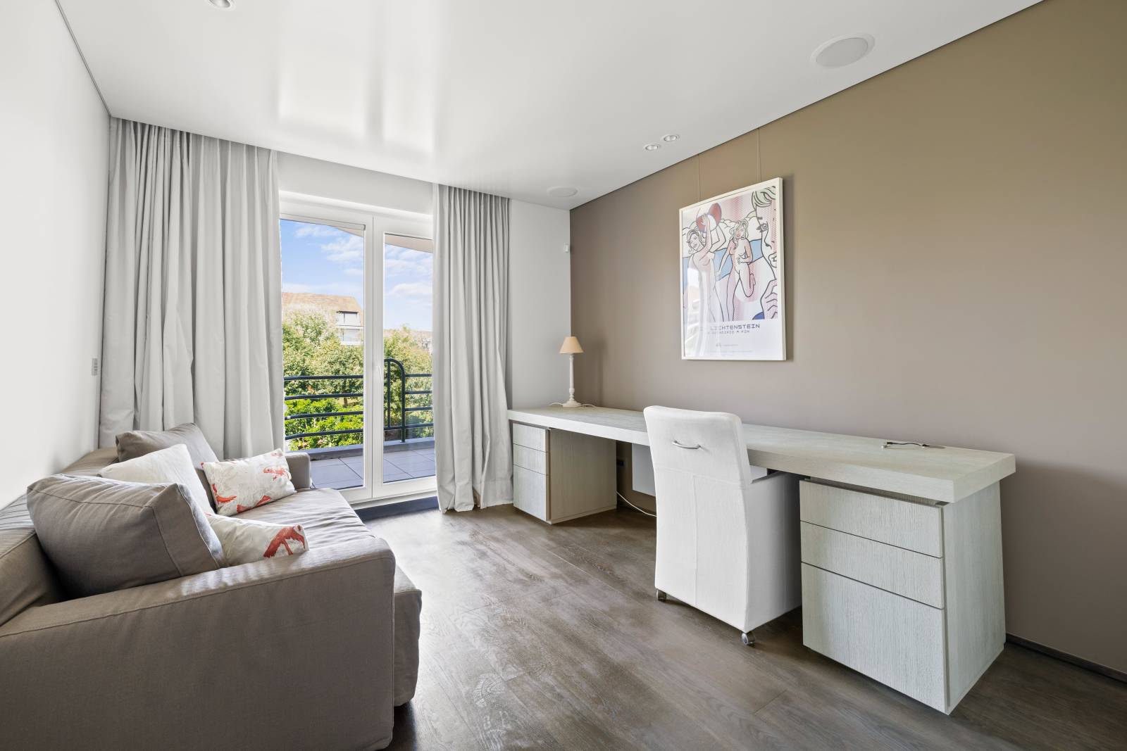 Samenstelling: Inkom met vestiaire en gastentoilet. Open keuken, voorzien van alle comfort, ruime woonkamer met toegang tot het Zuid gerichte terras, genietend van een mooi uitzicht op het groen en volledige privacy. Master bedroom met aparte badkamer met dubbele lavabo, ligbad en toilet. De 2e slaapkamer beschikt over een aansluitende douchekamer. De 3de slaapkamer is ingericht als bureau met zetelbed, deze slaapkamer geniet van toegang tot 2e terrasje.