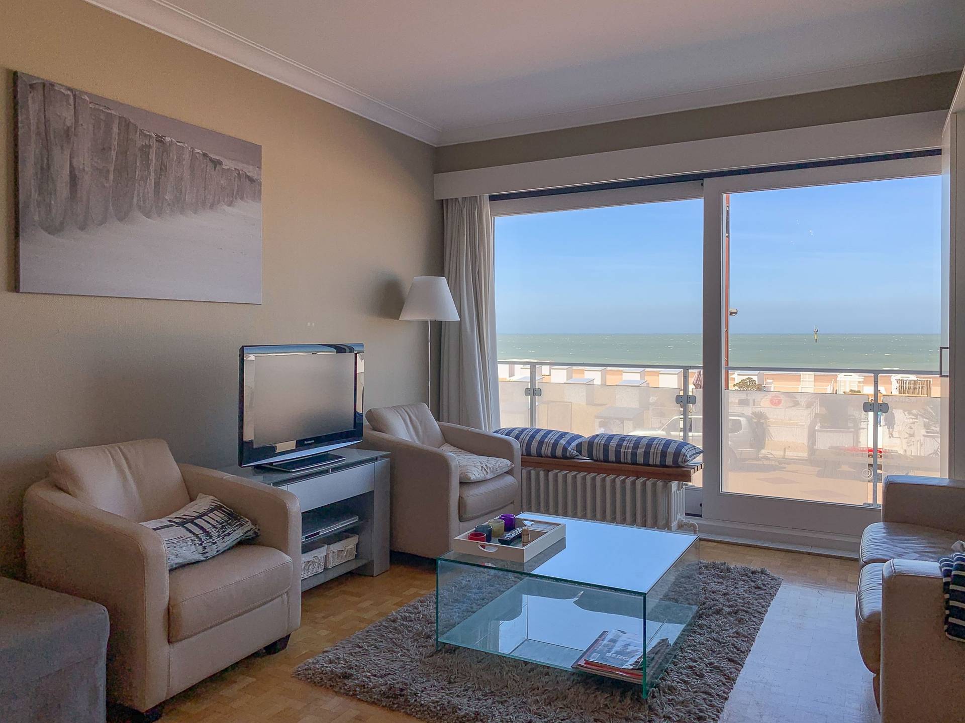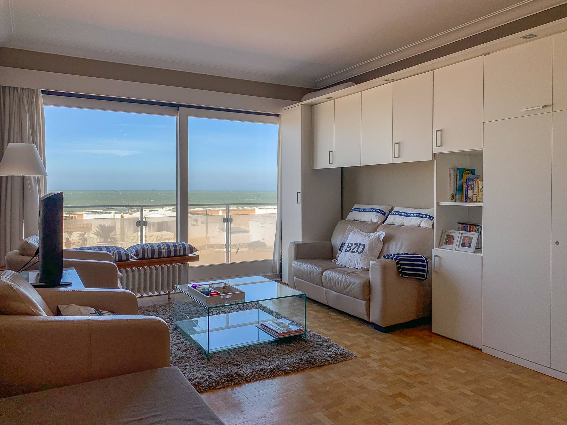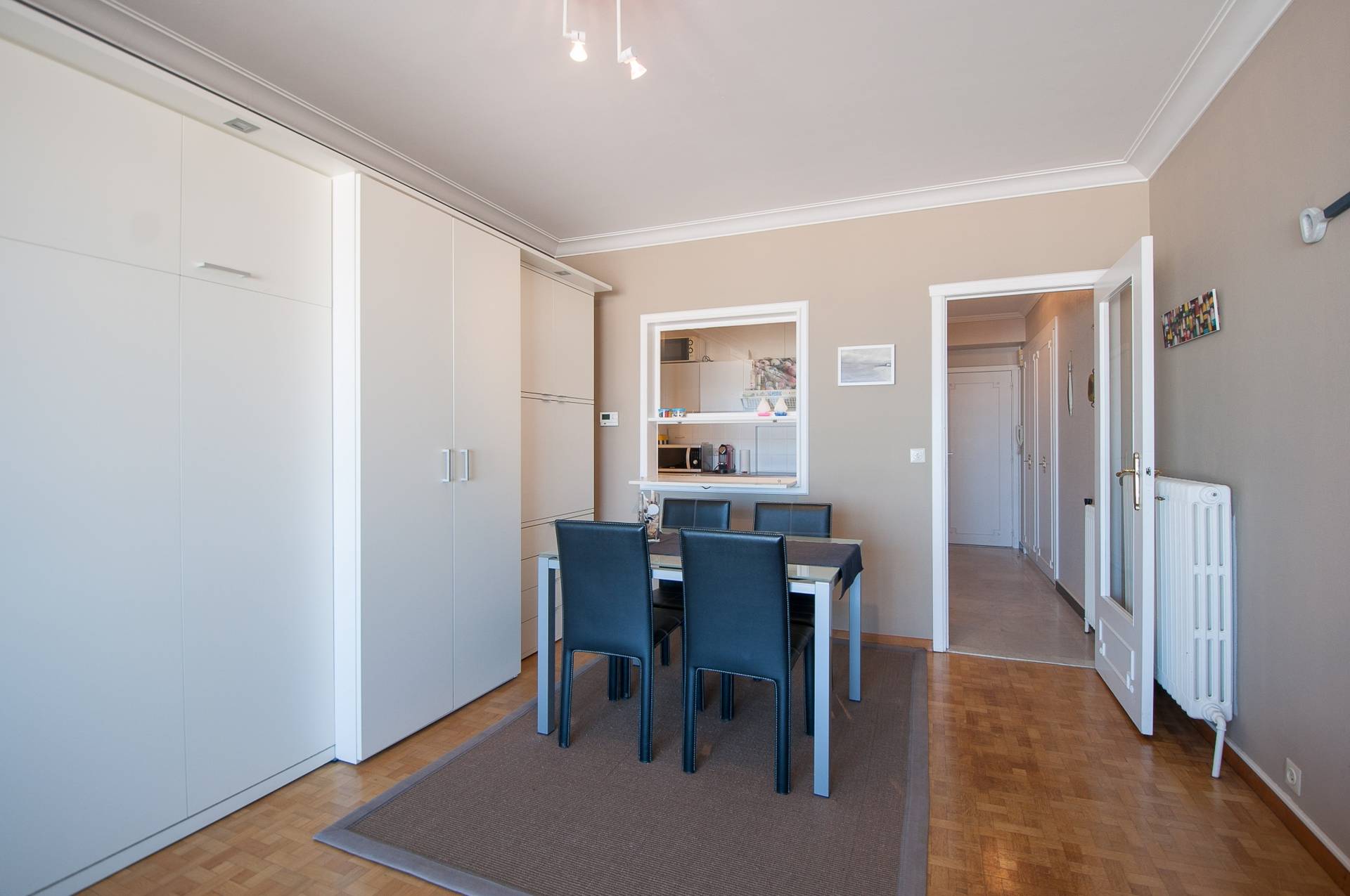 Samenstelling: Inkomhall met vestiaire. Woonkamer die uitgeeft op een terras met mooi frontaal zeezicht. Volledige wand met ingemaakte kasten. Eethoek. Half open keuken. Afzonderlijke badkamer, bestaande uit douche, lavabo en toilet.