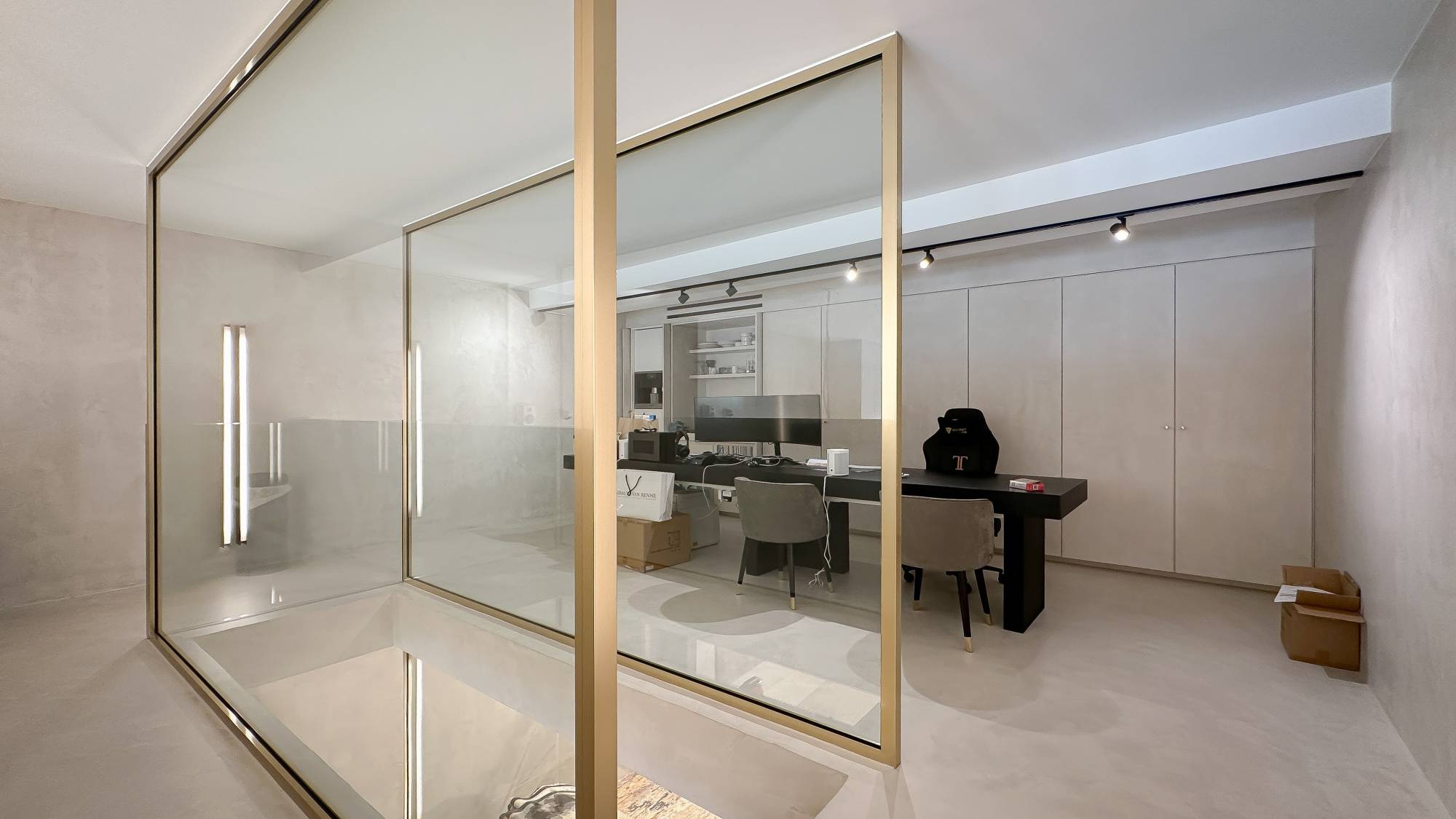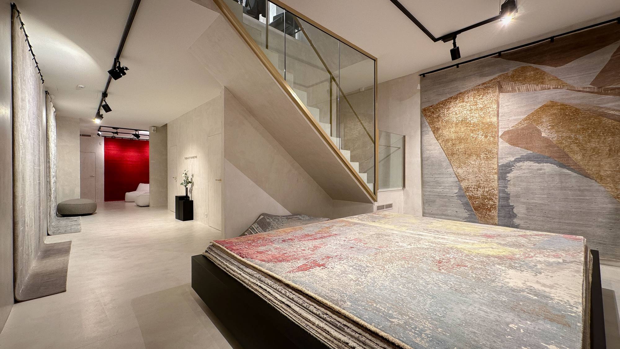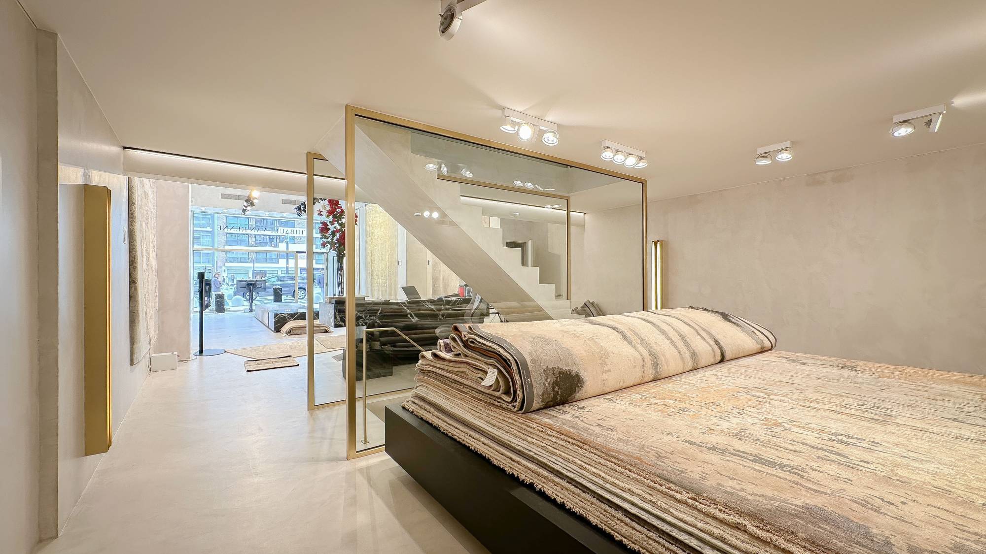 Ruime gelijkvloerse verdieping met een trap die leidt naar de mezzanine, waar momenteel een kantoorruimte en een luxueus ingerichte kitchenette zijn gevestigd. De benedenverdieping, even groot als de gelijkvloerse verdieping, is eveneens bereikbaar via de trap in de winkel.