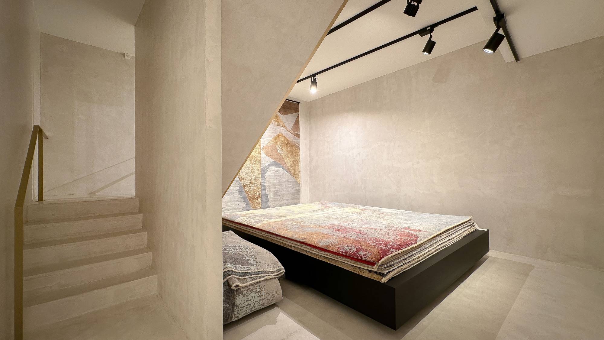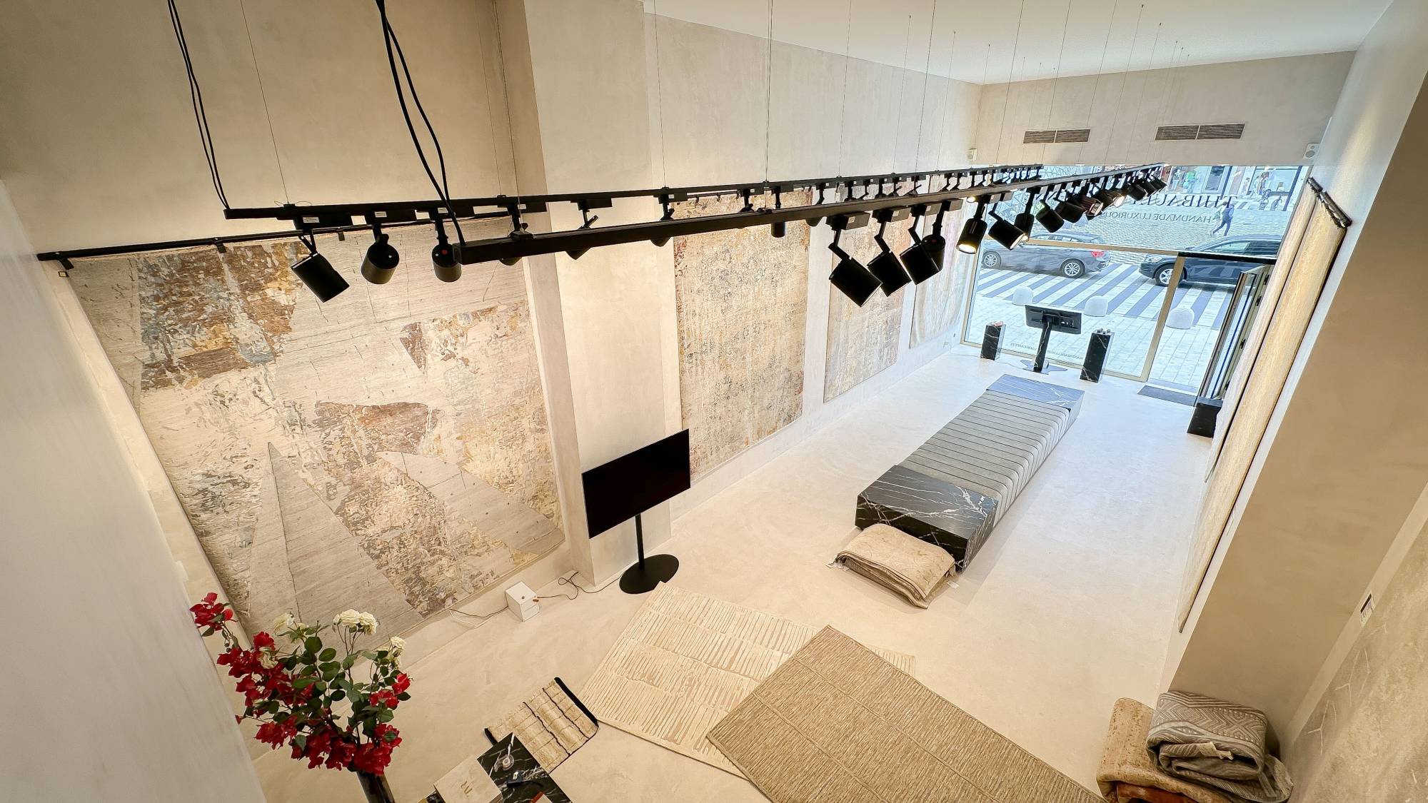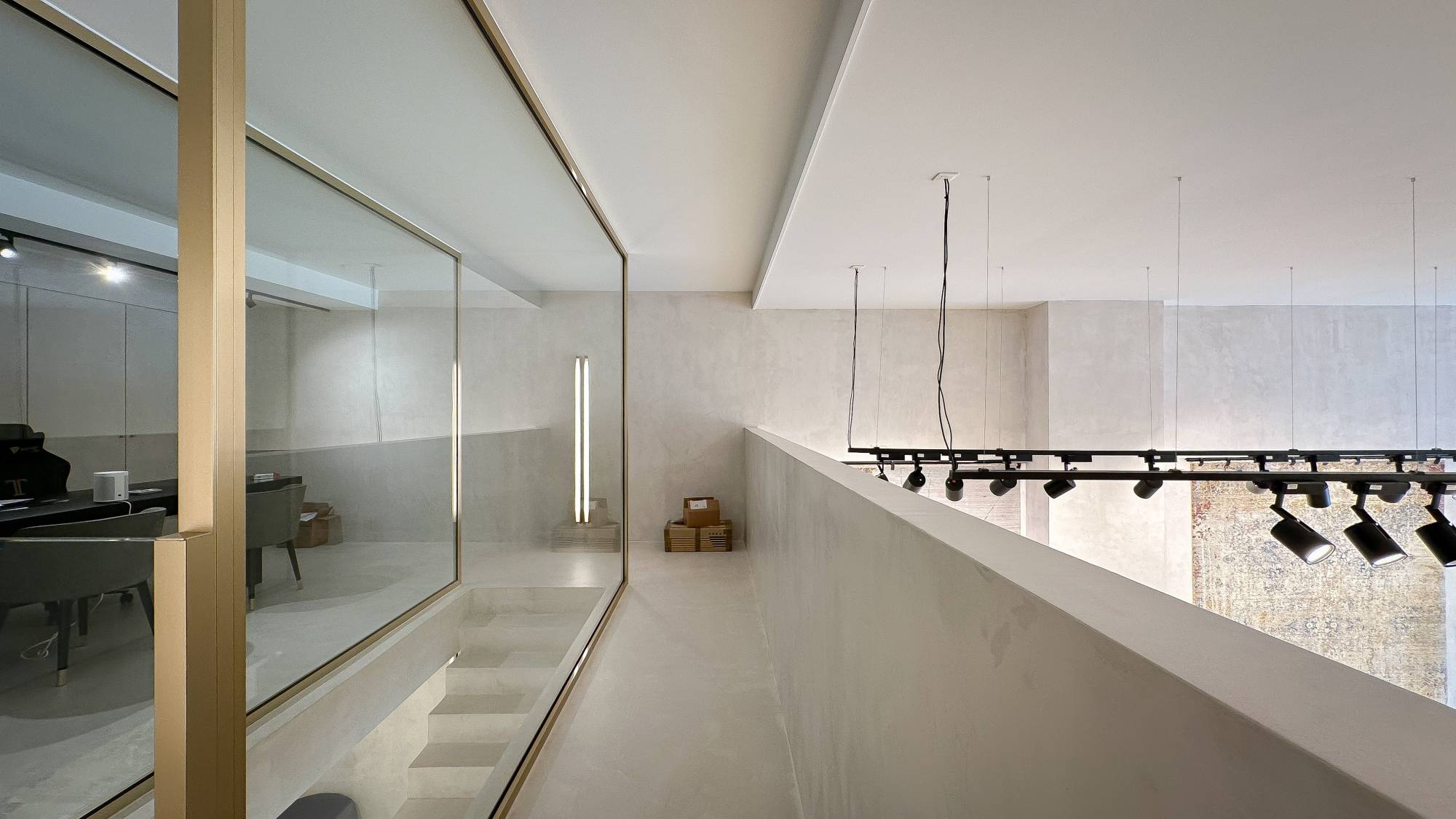 Ruime gelijkvloerse verdieping met een trap die leidt naar de mezzanine, waar momenteel een kantoorruimte en een luxueus ingerichte kitchenette zijn gevestigd. De benedenverdieping, even groot als de gelijkvloerse verdieping, is eveneens bereikbaar via de trap in de winkel.