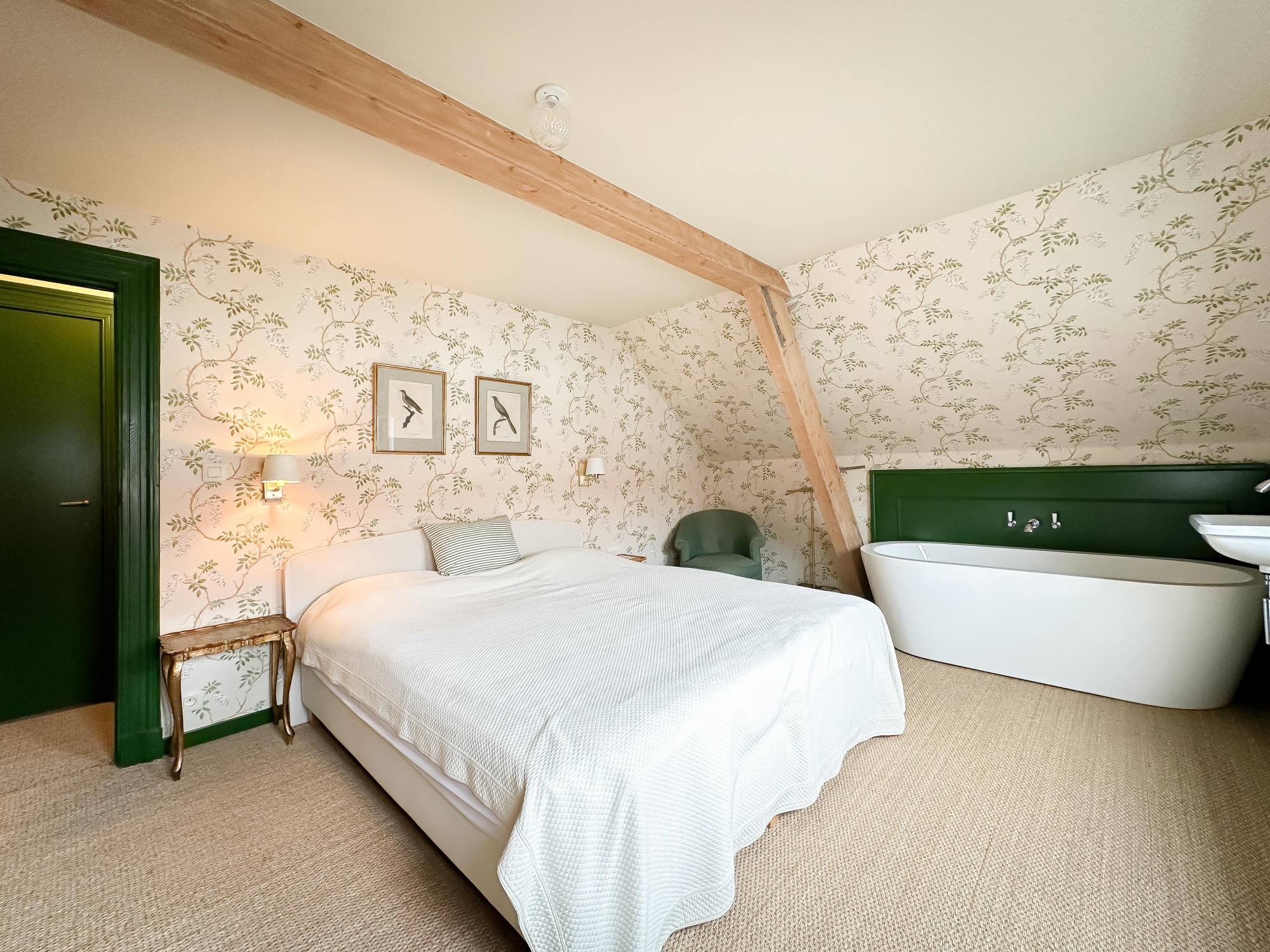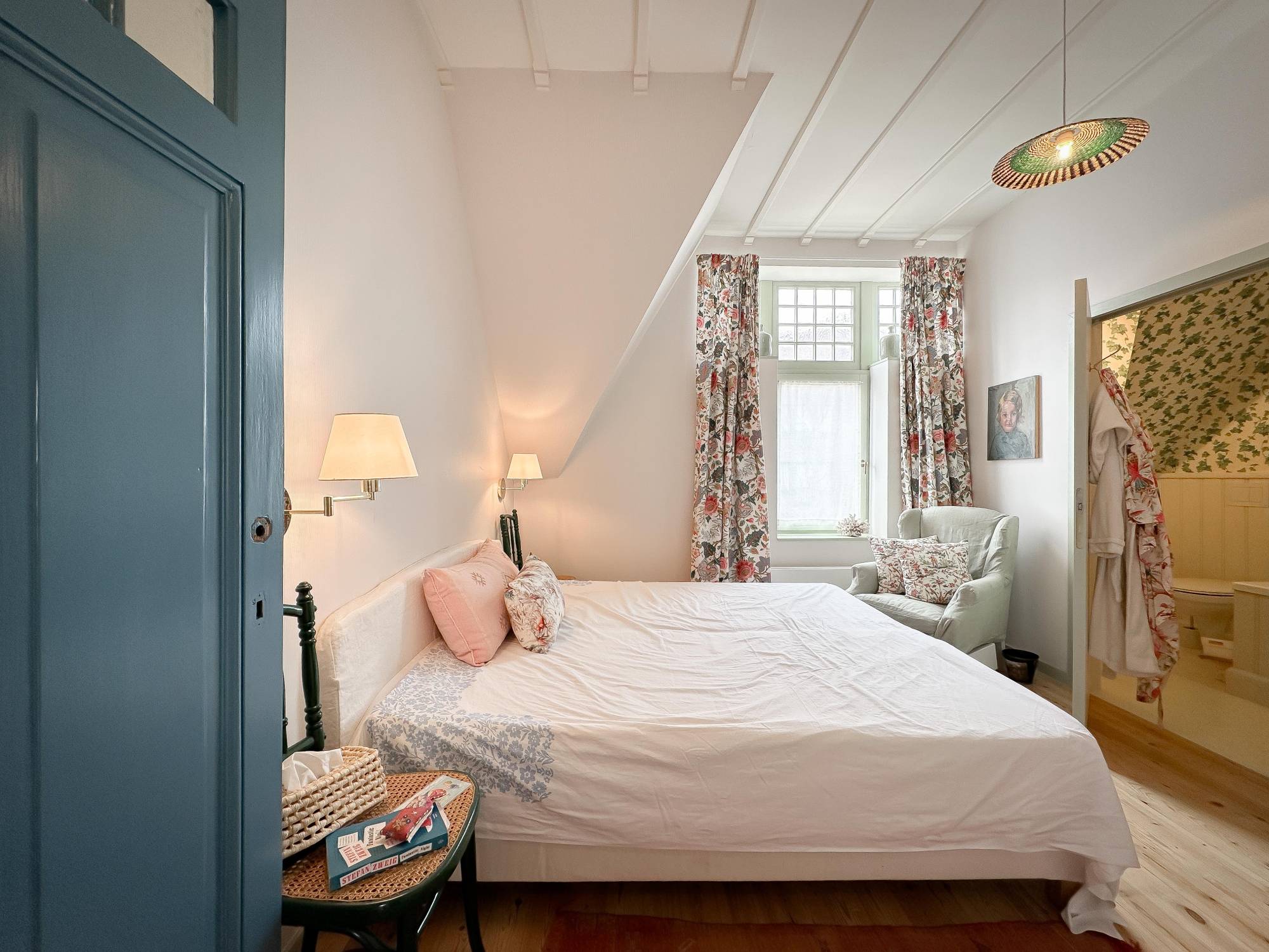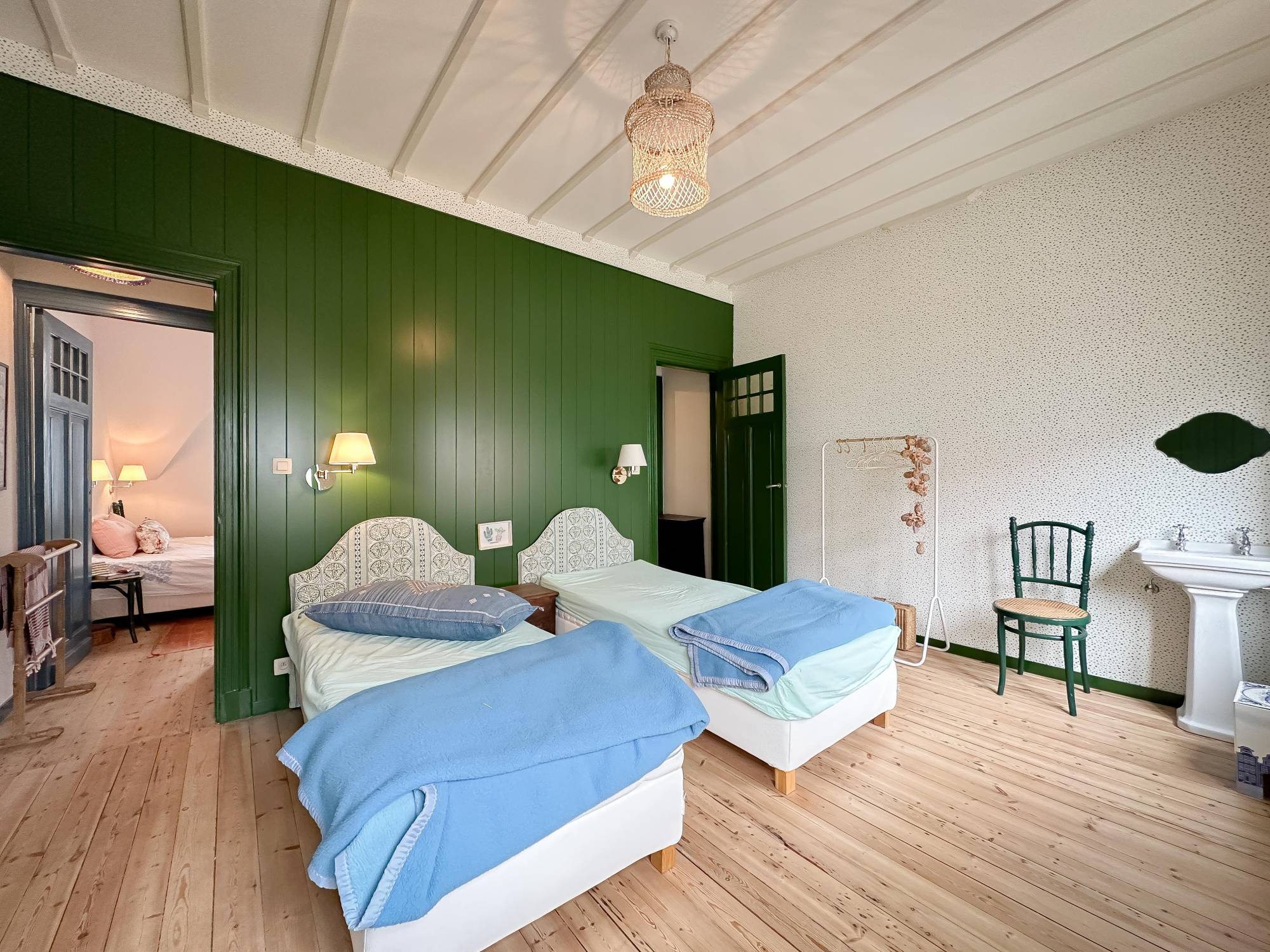 Op de eerste verdieping bevinden zich twee ruime, rustgevende slaapkamers, die een gemeenschappelijke badkamer delen. Op de bovenverdieping bevindt zich de derde slaapkamer, een master bedroom met een open badkamer en een apart toilet.