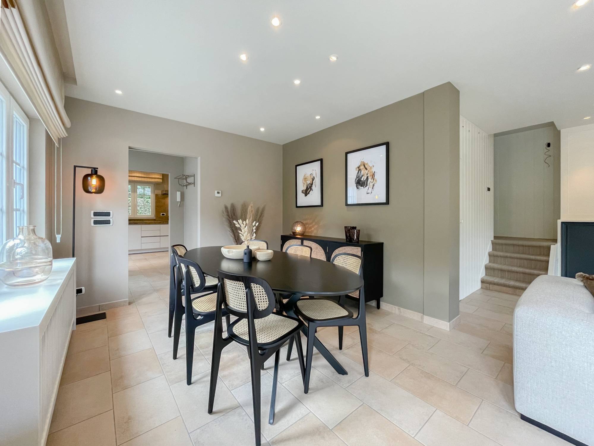 Samenstelling: Inkomhal met gastentoilet. Aangename zithoek met open haard, met aansluitend een lichtrijke eetkamer. Beide ruimtes geven uit op het terras en de perfect georiënteerde tuin. Afzonderlijke keuken met gezellige ontbijthoek, voorzien van alle hedendaagse comfort. Berging. Vanuit de woonkamer vertrekt de trap richting 1e verdieping.