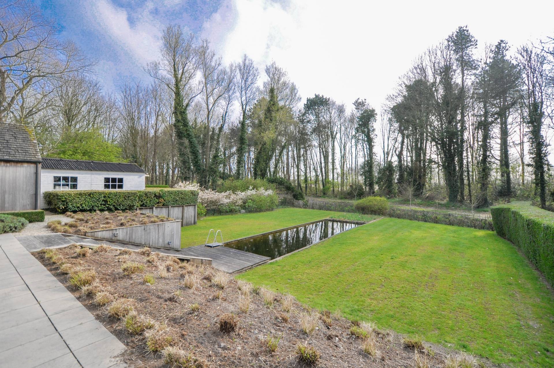 Samenstelling: Inkom met vestiaire en toilet. Aangename en gezellige living (vloer : polybeton) met zicht op een zonnig terras en prachtig aangelegde tuin met zwemvijver. Grote gashaard uitgevend op de luchtige keuken voorzien van alle toestellen met eethoek. Bureau. 3 Slaapkamers met bijhorende bad- of douchekamer. Wasplaats voor wasmachine en droogkast.