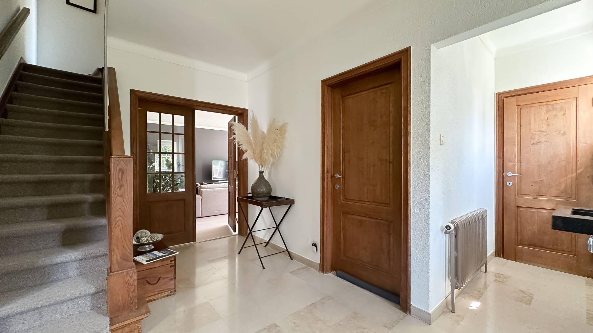 Samenstelling: Royale inkomhal met gastentoilet en vestiaireruimte. Zeer aangename woonruimte, bestaande uit gezellige zithoek met open haard, lichtrijke eetplaats, en bureel. Zonovergoten terras, perfect georiënteerd, uitgevend op de mooie tuin.