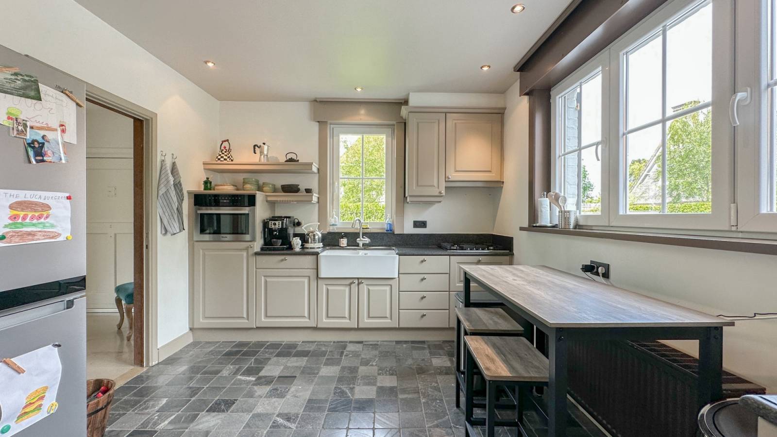 Afzonderlijke keuken met ontbijthoekje.