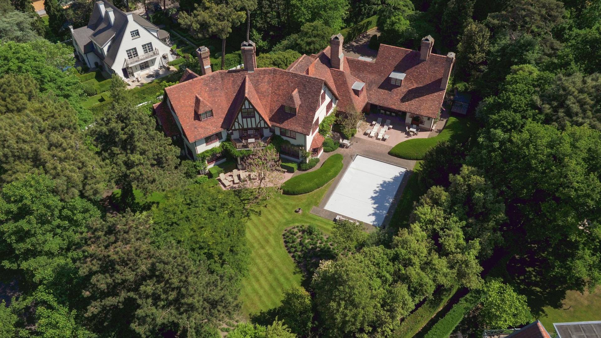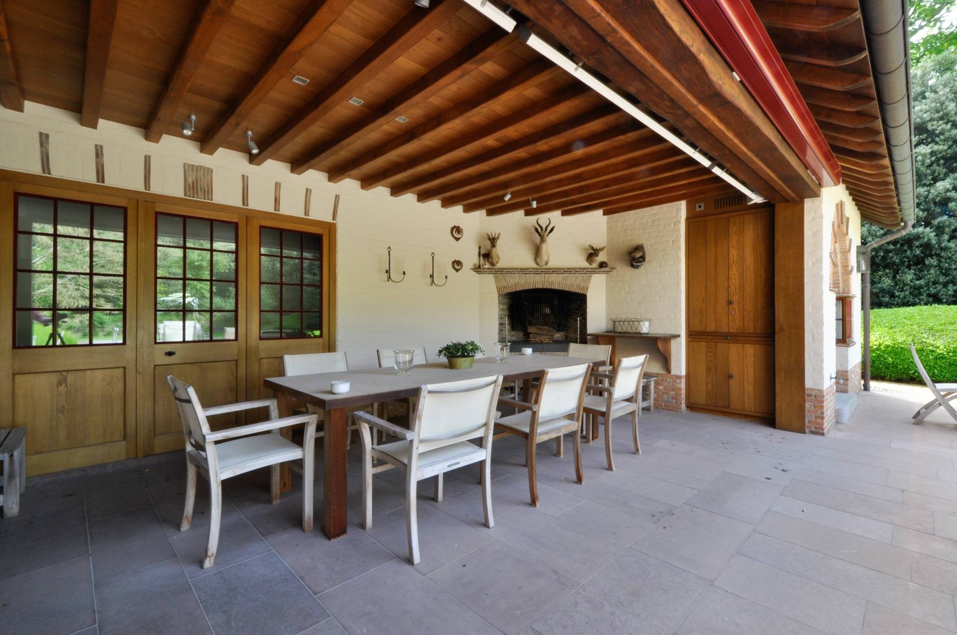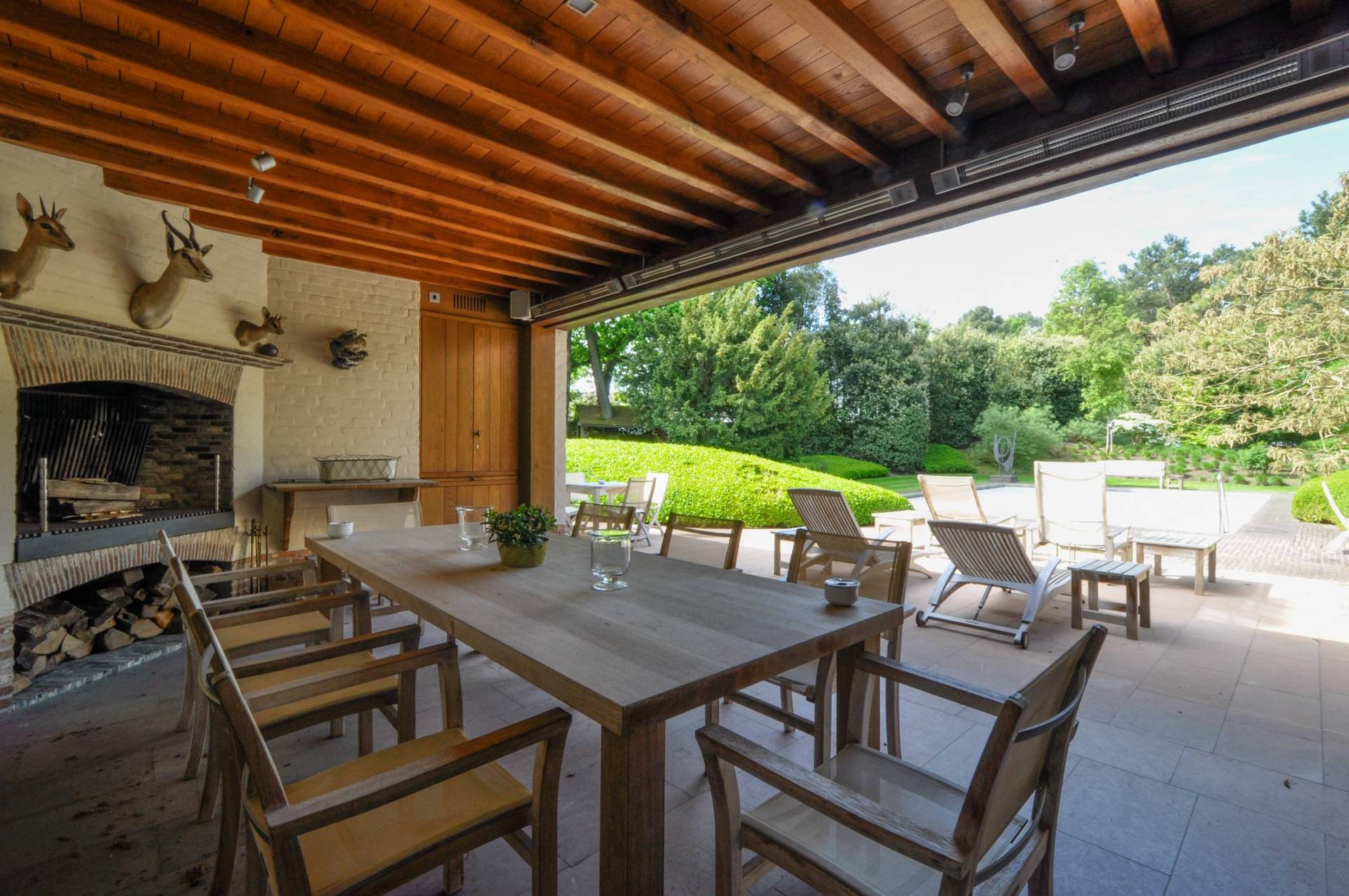 Samenstelling: Royale inkomhall met gastentoilet en vestiaire. Prachtige woonkamer met open haard. Bibliotheek. Eetkamer. Volledig geïnstalleerde keuken, voorzien van alle huishoudelijke toestellen. Bijkeuken. Zonovergoten terras met overdekte eetplaats en open haard.