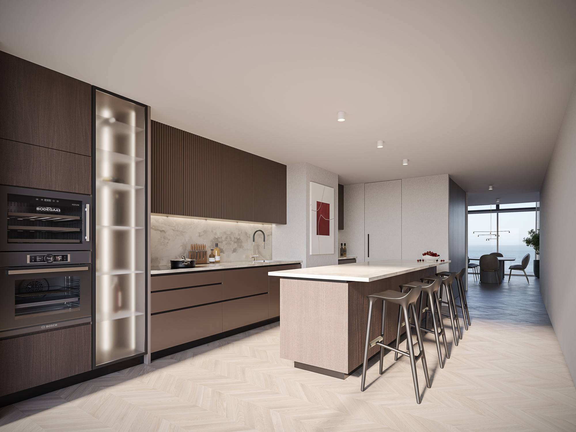 Gezellige eethoek, grenzend aan een open, luxueus ingerichte keuken met kookeiland en geïntegreerde barruimte