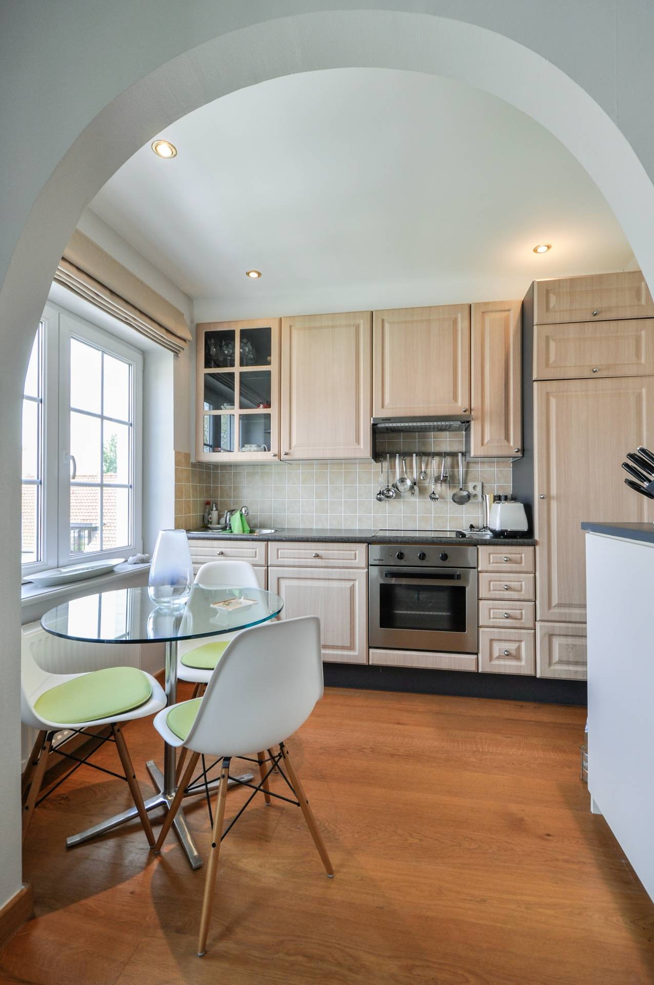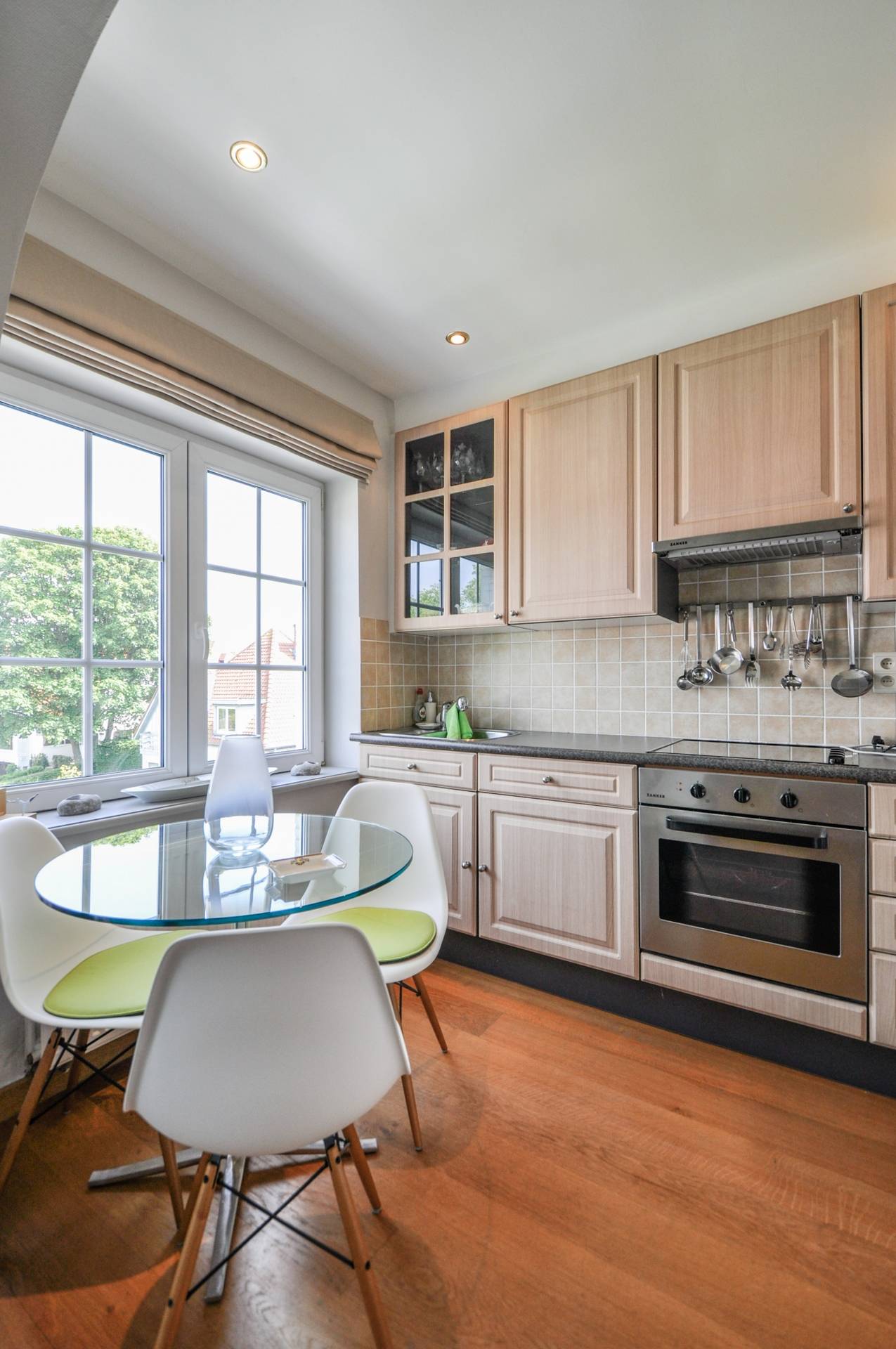 Samenstelling: Gezellige woonkamer die uitgeeft op een balkon/terras, en genietend van een mooi open zicht op het groen en de omliggende villa's. Volledig ingerichte keuken, met eethoek.