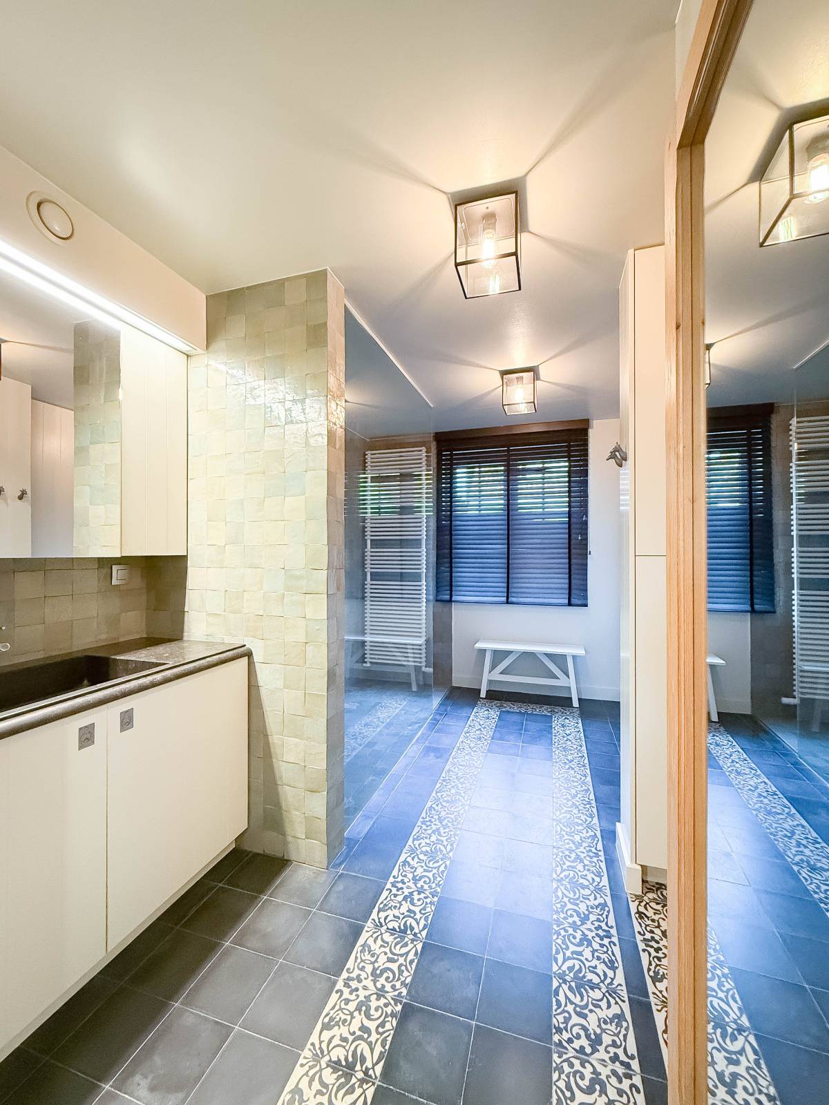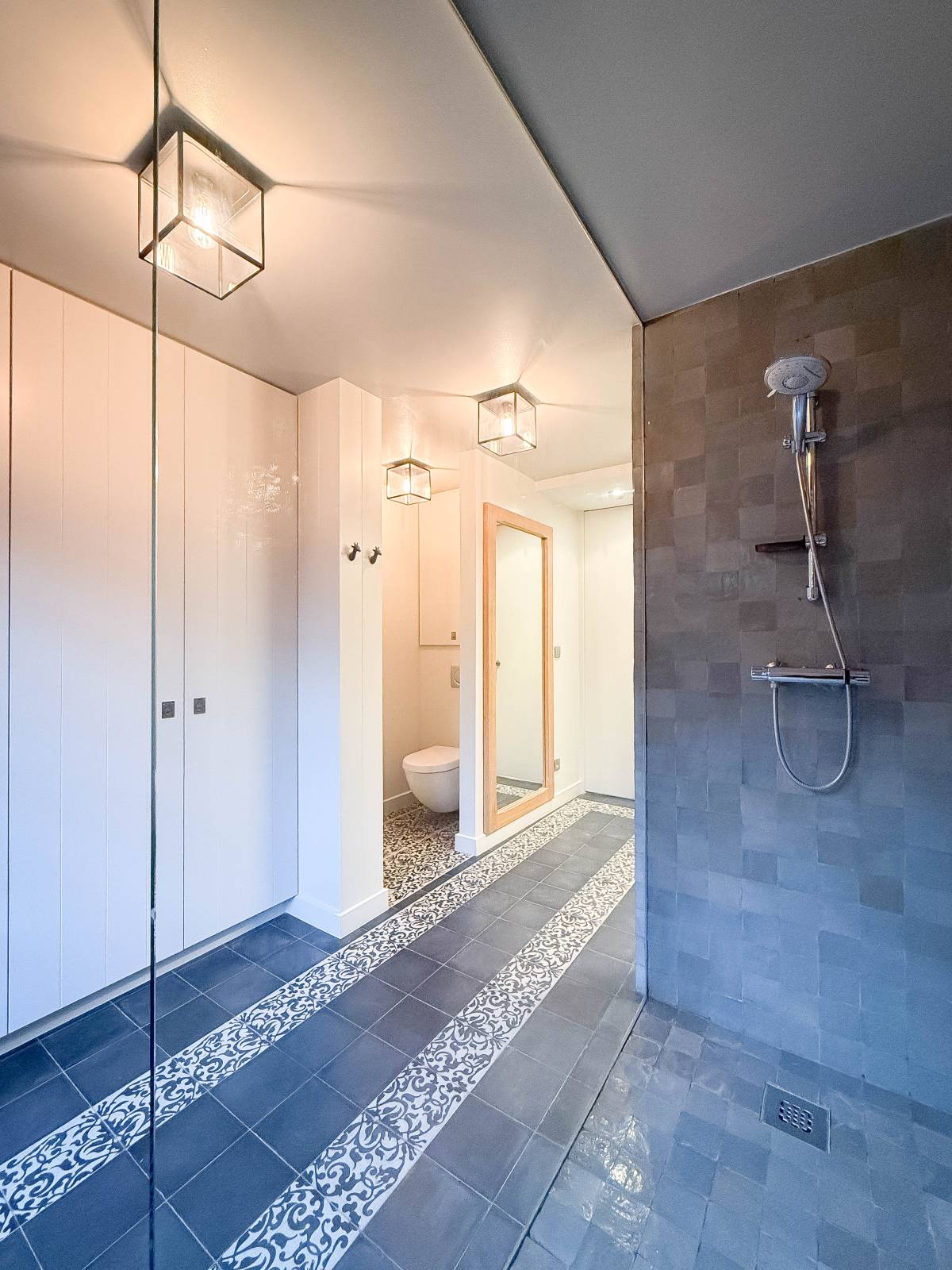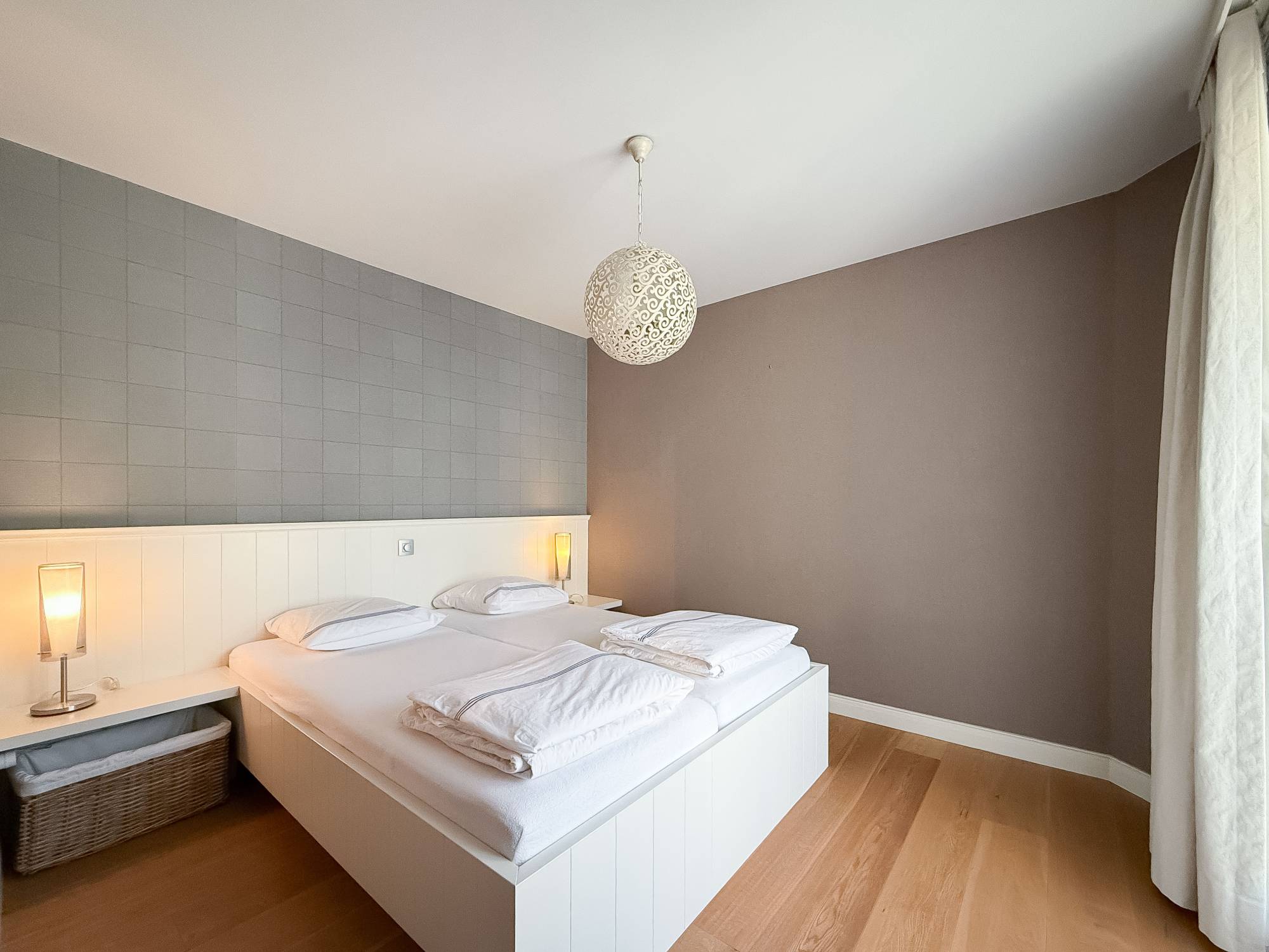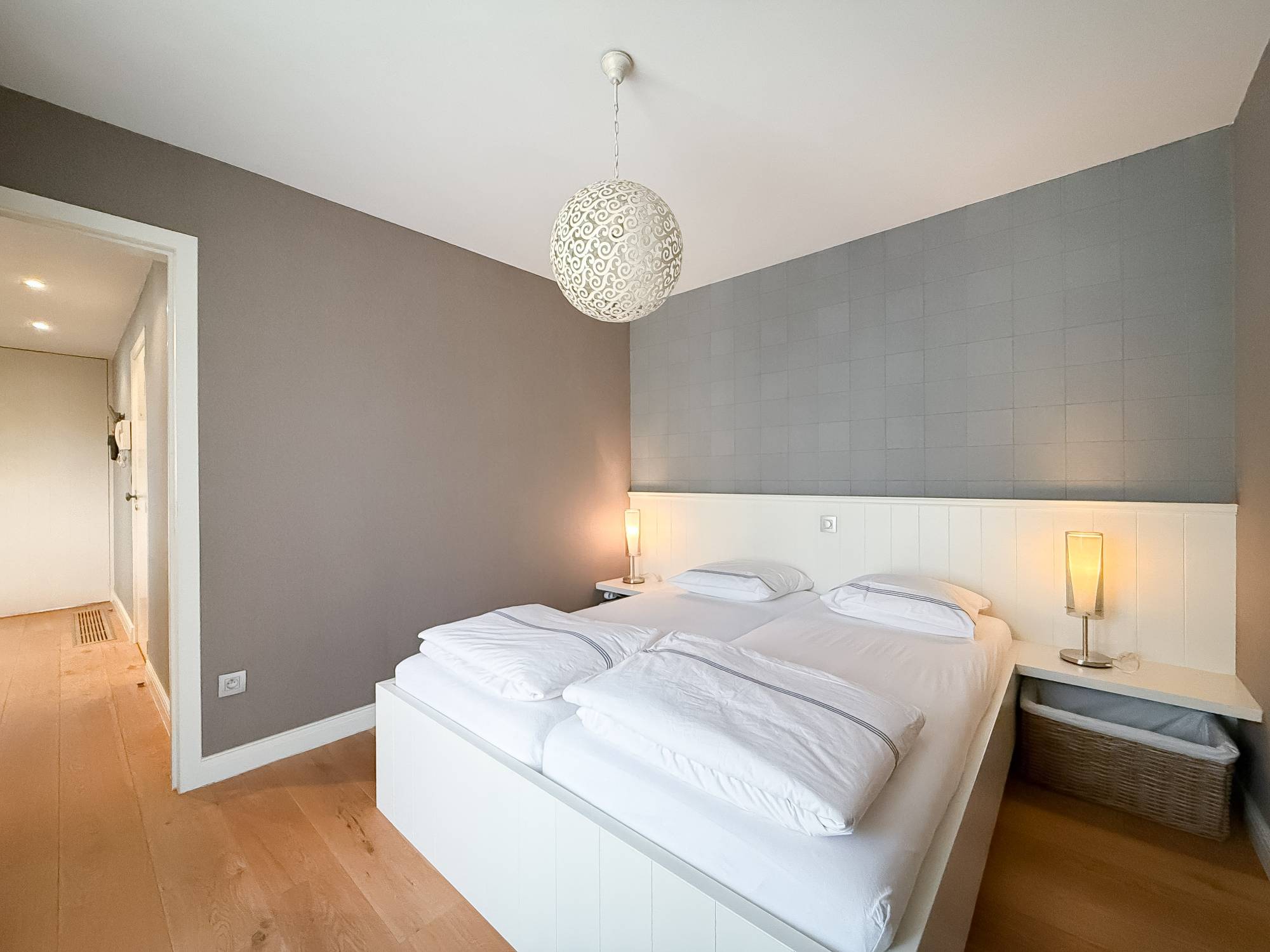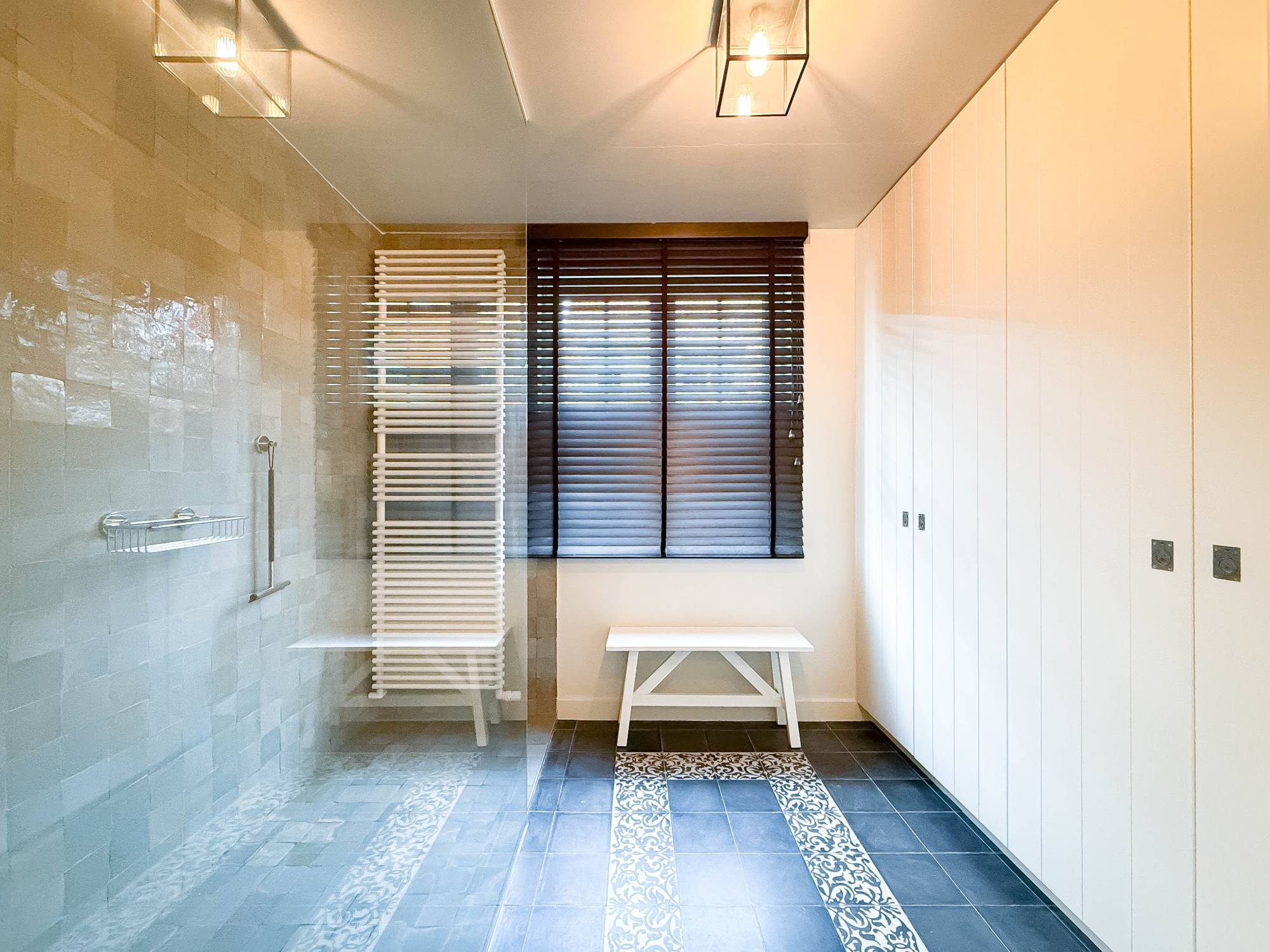 De ruime slaapkamer geeft uit op het tweede terras, terwijl de badkamer voorzien is van een royale inloopdouche, lavabo en toilet. Een volledig ingerichte dressingkast maakt het geheel compleet.