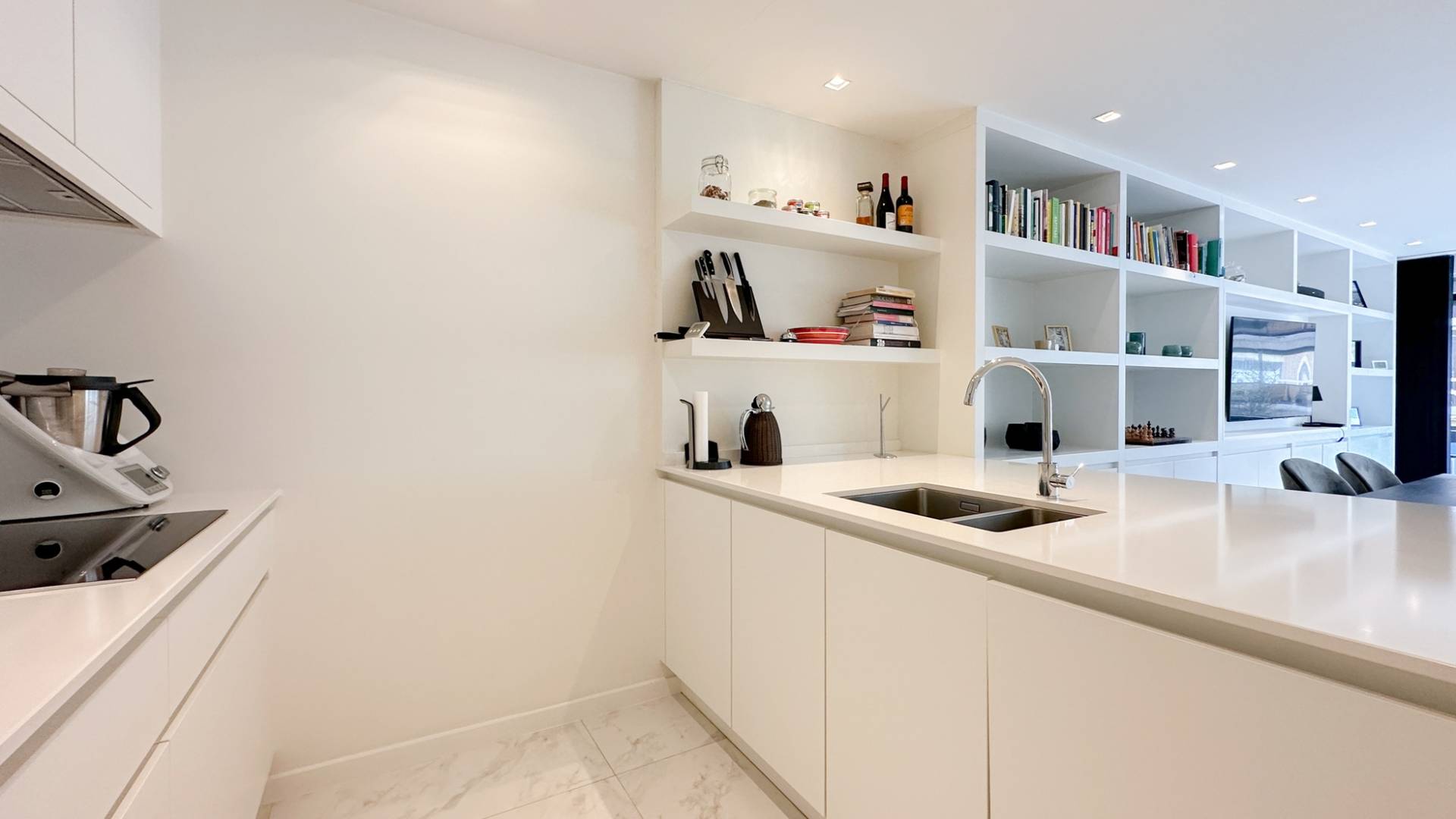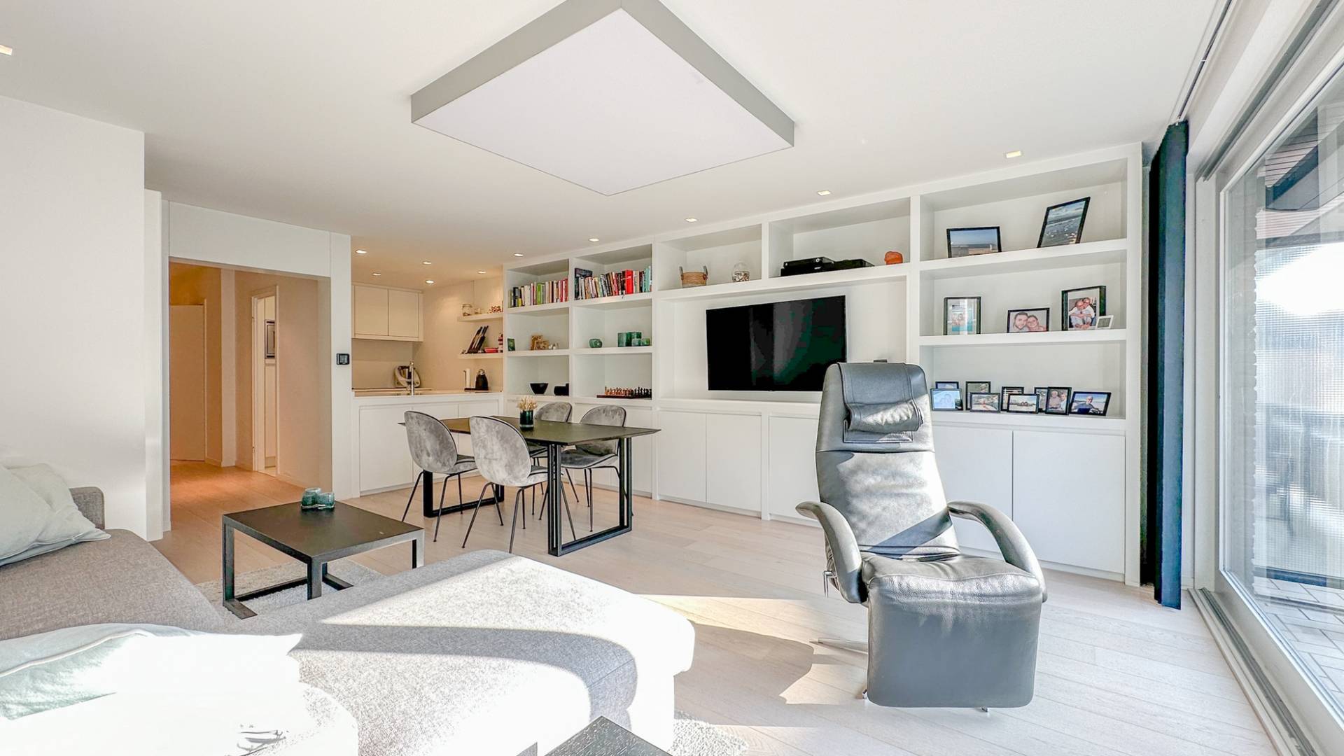 Samenstelling: Inkomhall met gastentoilet en vestiaire. Zonnige woonkamer met tal van ingemaakte kasten. Zonnig terras (met zonneluifel), over de volledige gevelbreedte van het appartement. Eethoek. Half open keuken, voorzien van alle comfort. Aparte berging.