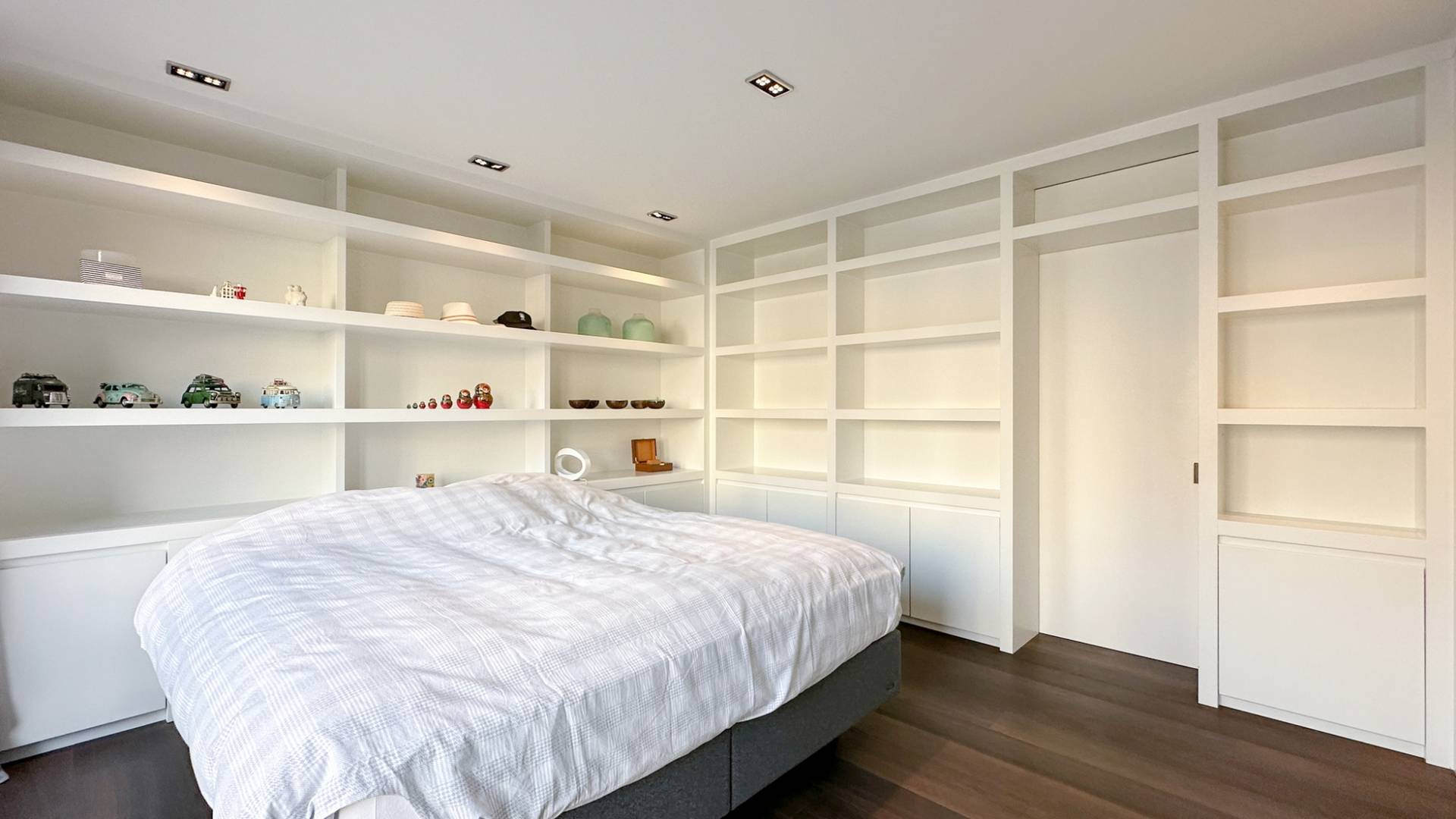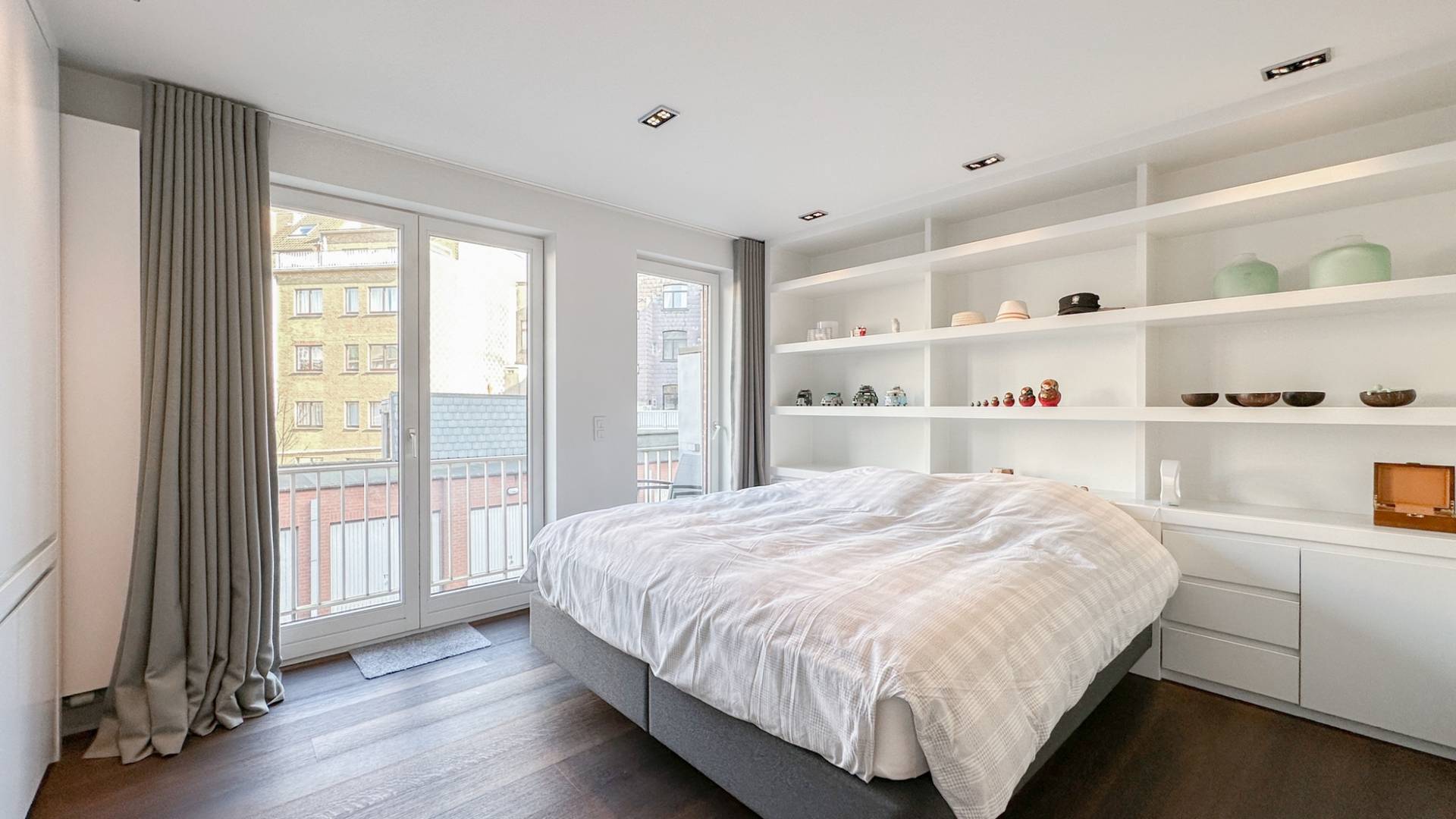 Achteraan bevindt er zich 1 ruime slaapkamer met tal van ingemaakte kasten. Terras aan de achterzijde. Aparte badkamer met ligbad, ruime douche en lavabo.
