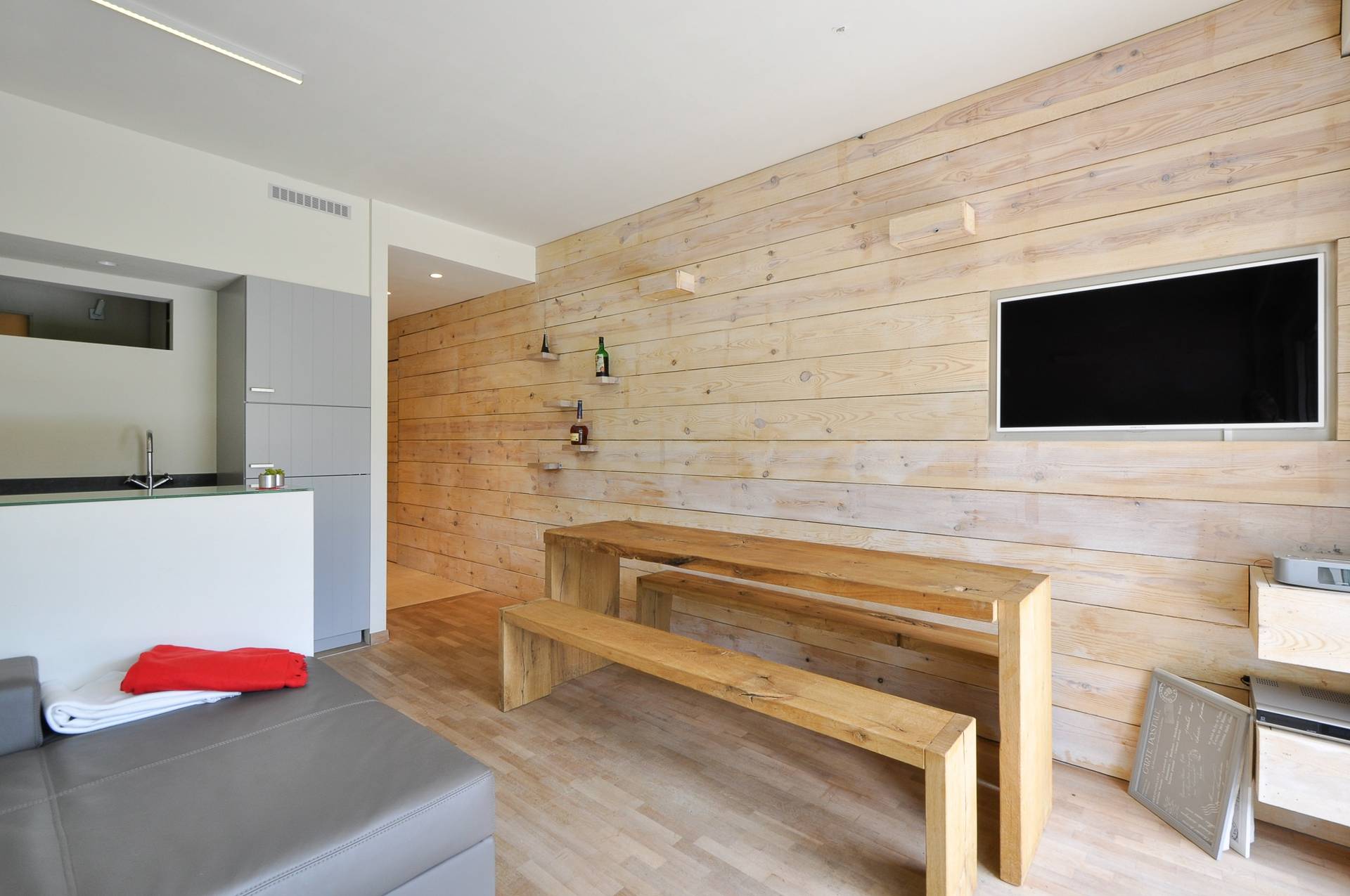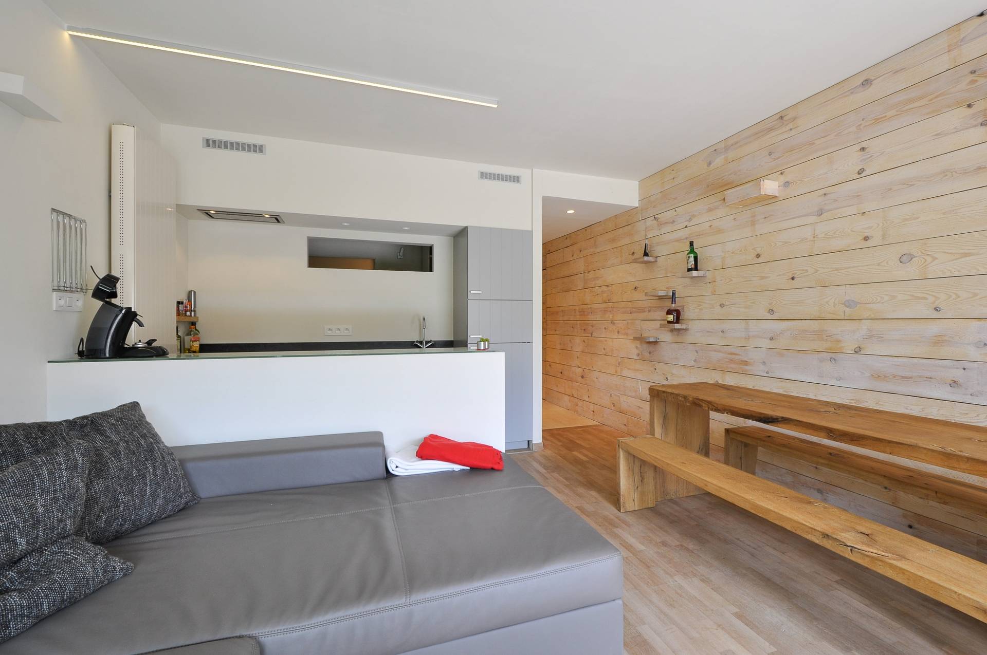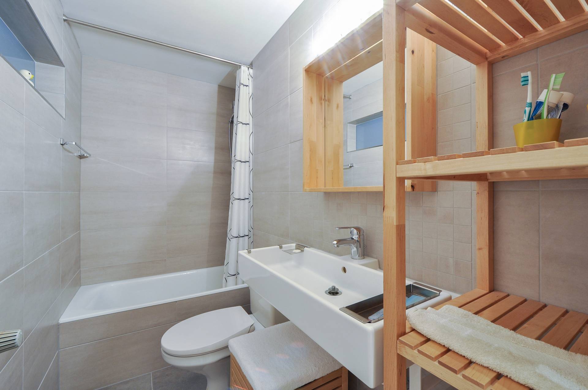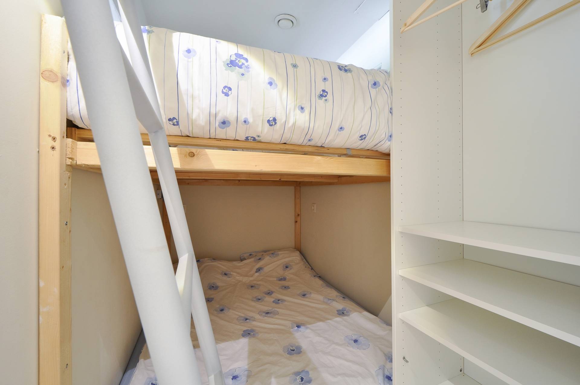 Aparte slaaphoek met 2 dubbele bedden boven elkaar. Aparte badkamer met ligbad, dubbele lavabo en toilet. Privatieve kelder.