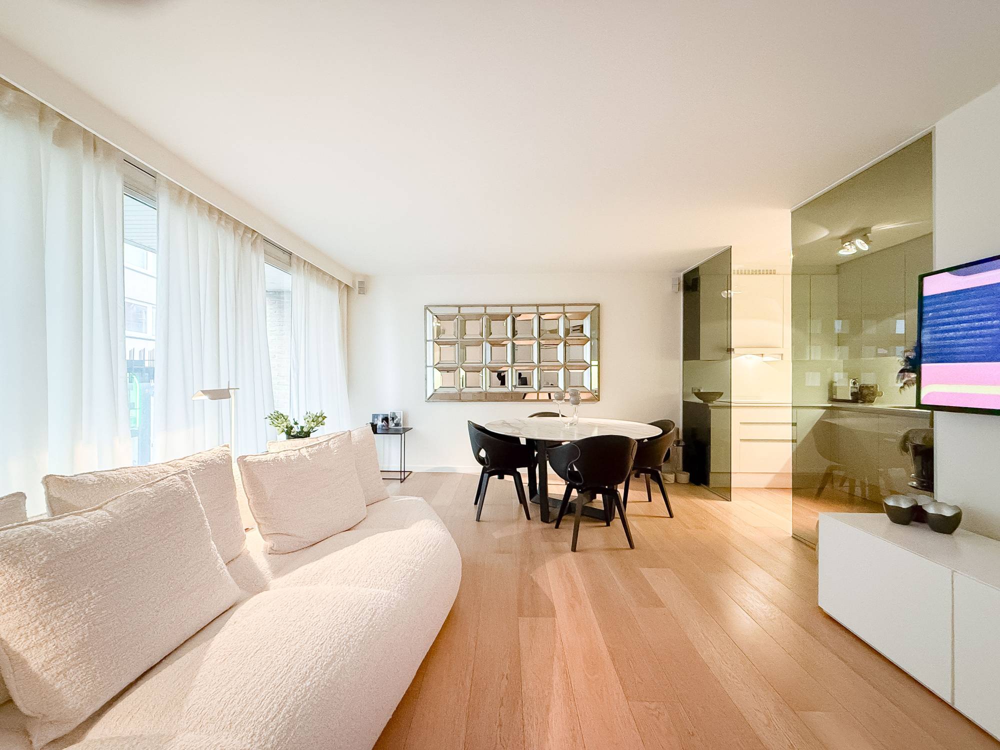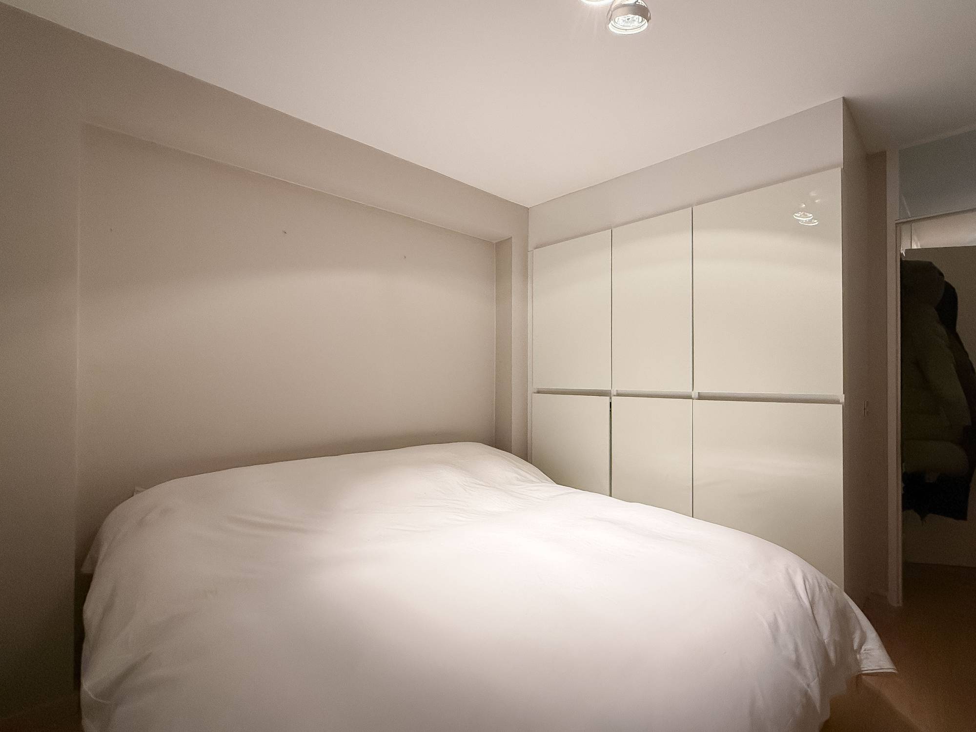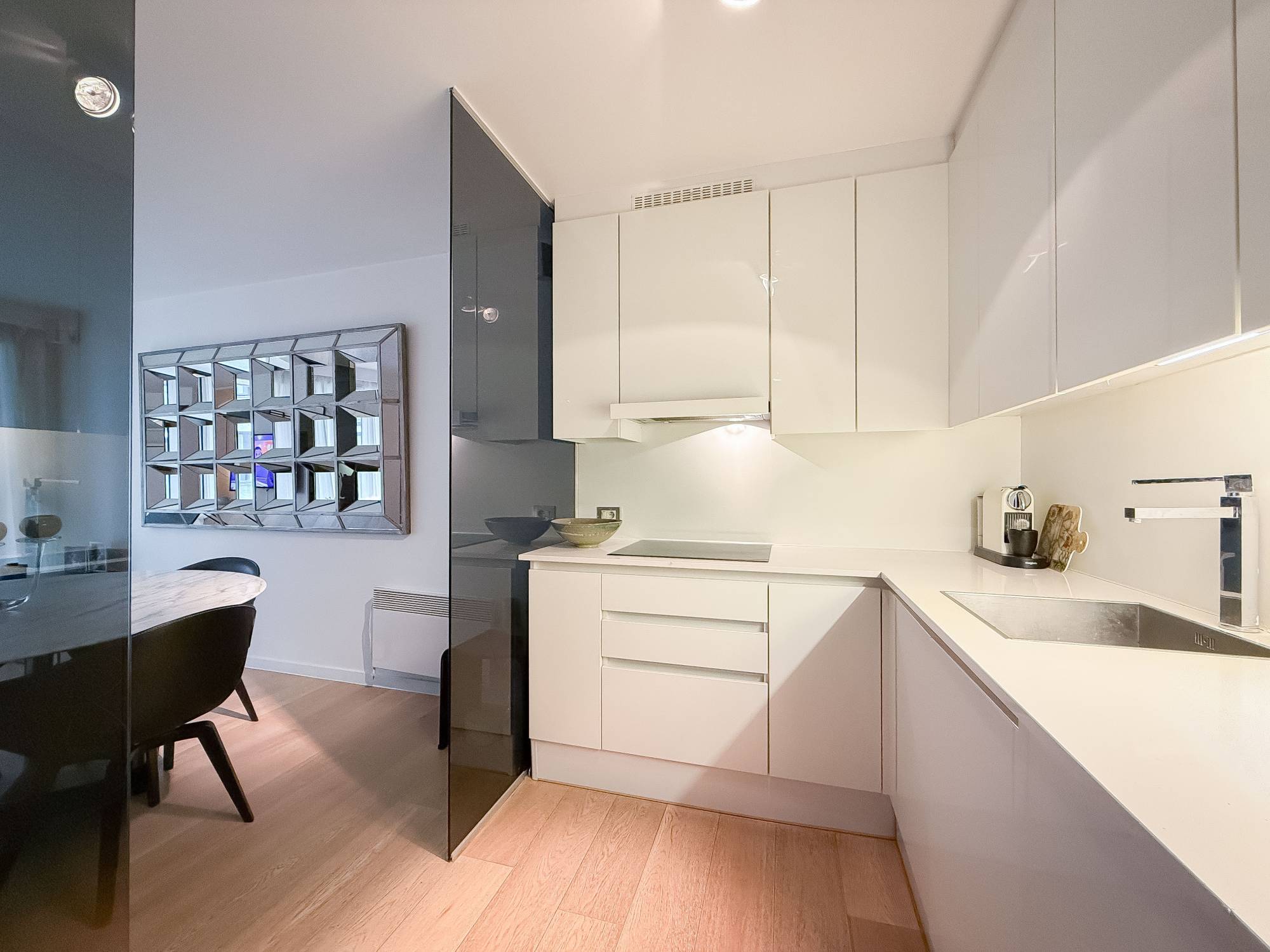 De eethoek is verbonden met de keuken die is uitgerust met alle moderne huishoudtoestellen. Aan de achterzijde van het appartement bevindt zich een volwaardige slaapkamer met ingemaakte kasten. Aansluitend vindt u een ruime douchekamer, compleet met een inloopdouche en een lavabomeubel.