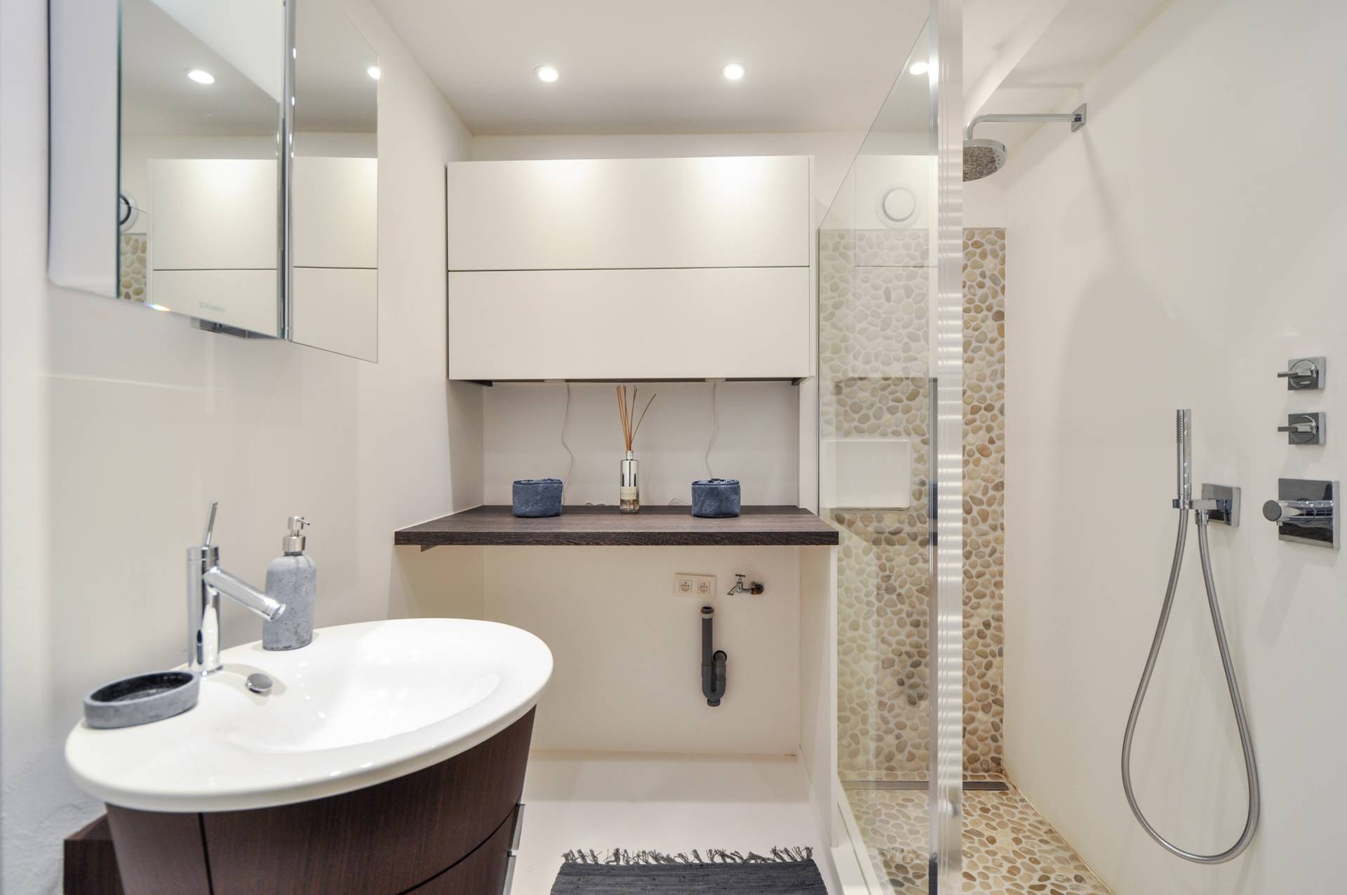 Achteraan bevindt er zich 1 volwaardige, ruime slaapkamer met ingemaakte kasten. Er is een douchekamer met mooie inloopdouche. Ruimte voor wasmachine en droogkast.