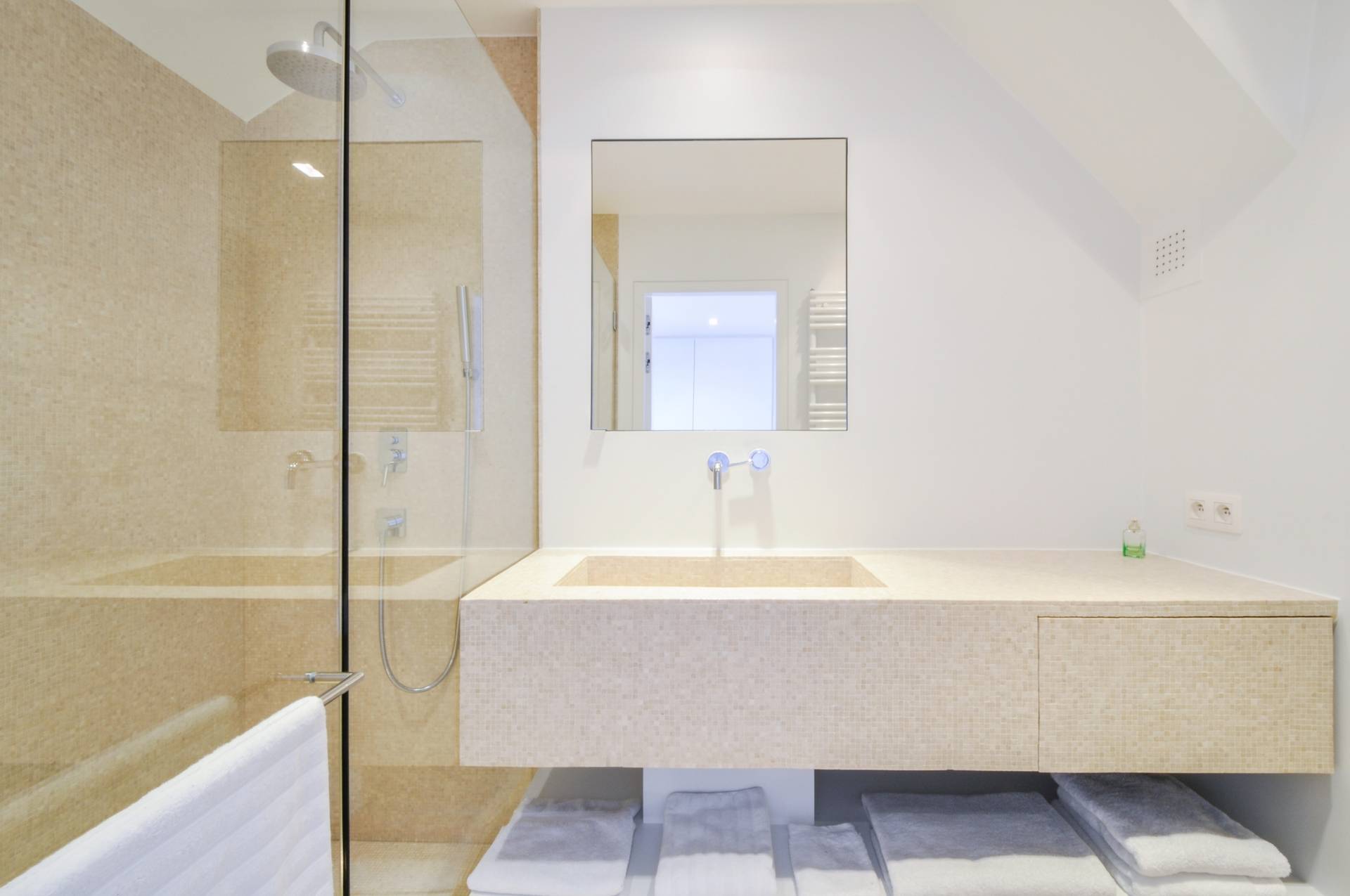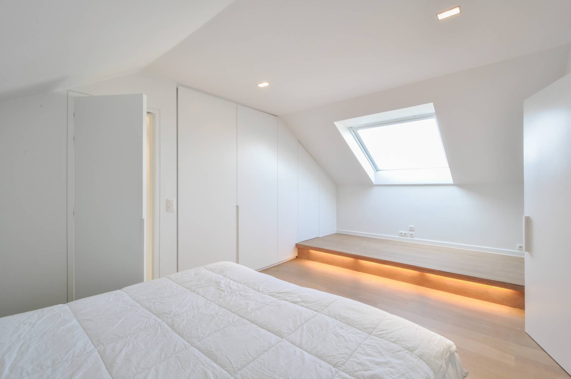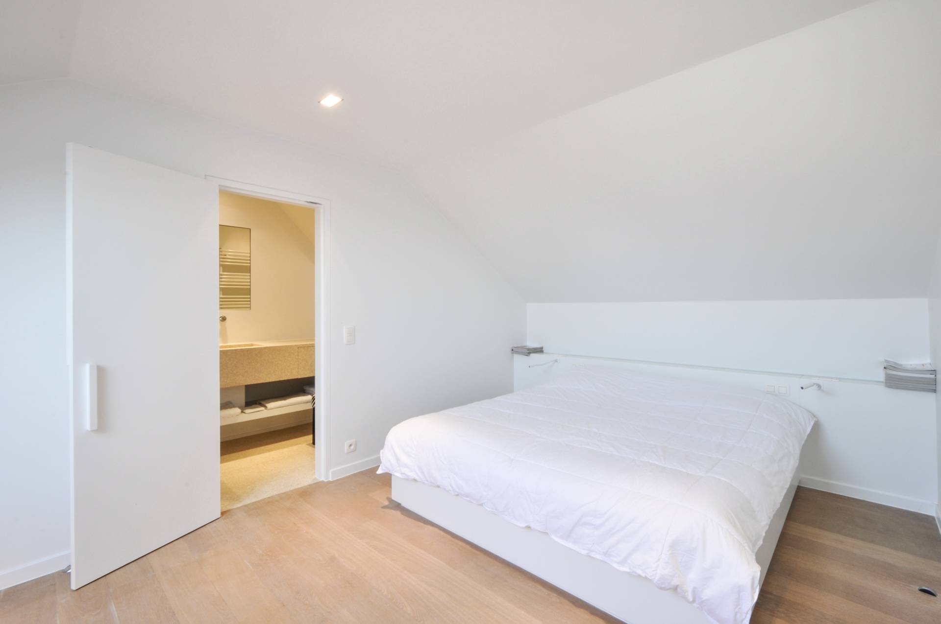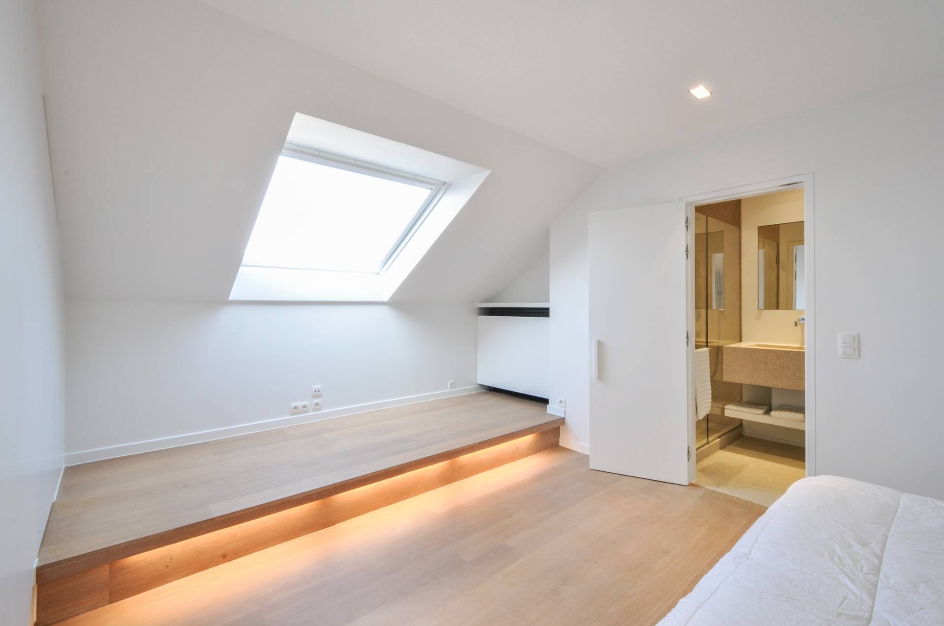 Op de bovenverdieping bevindt er zich 1 hele ruime, luchtige slaapkamer met tal van ingemaakte kasten. Vanuit de slaapkamer heeft men een mooi open zicht over het Zoute. Luxueus en smaakvol ingerichte badkamer bestaande uit ruime douche, lavabo en toilet.