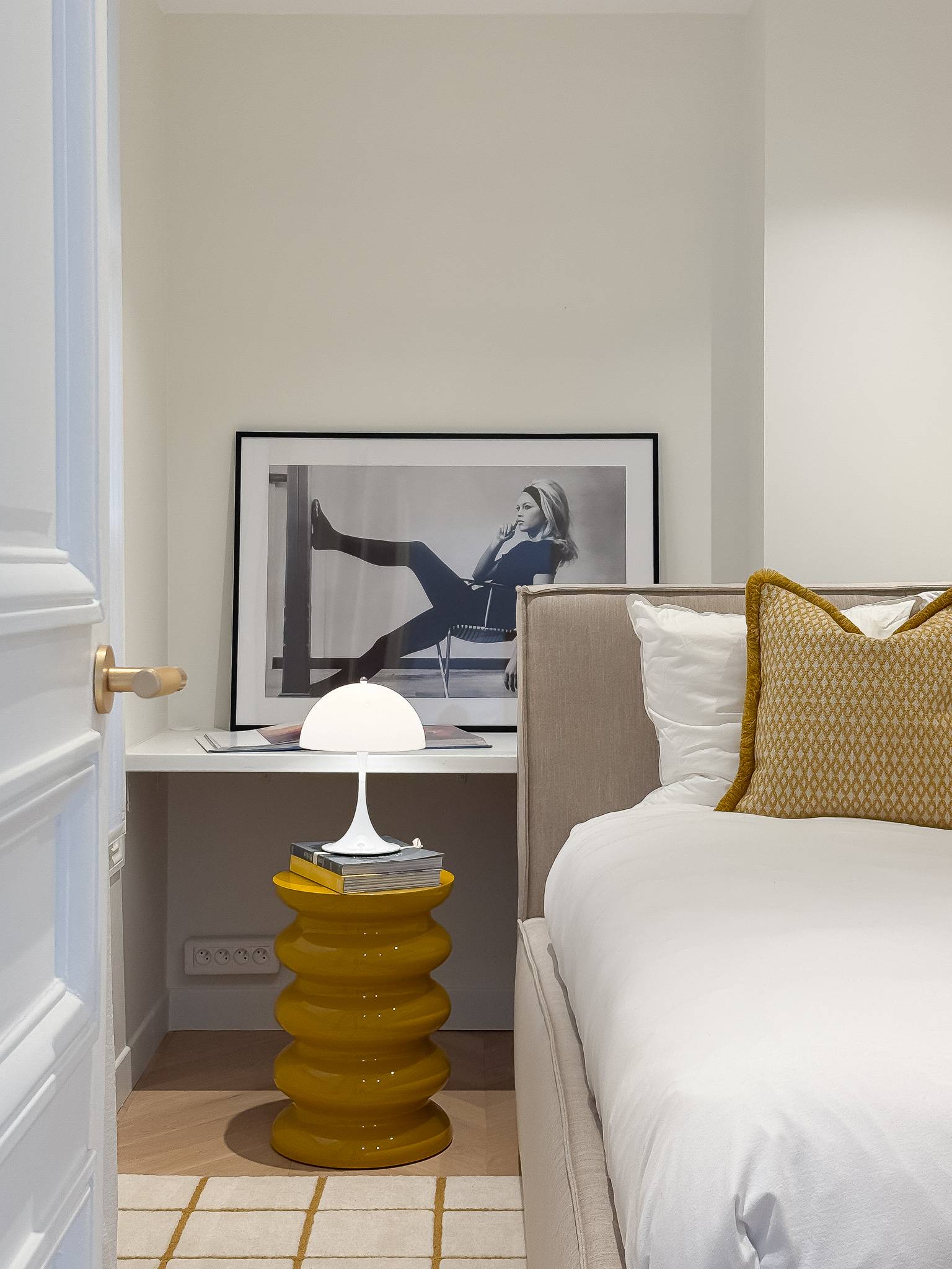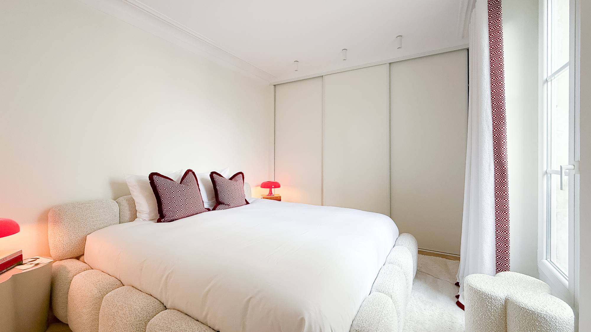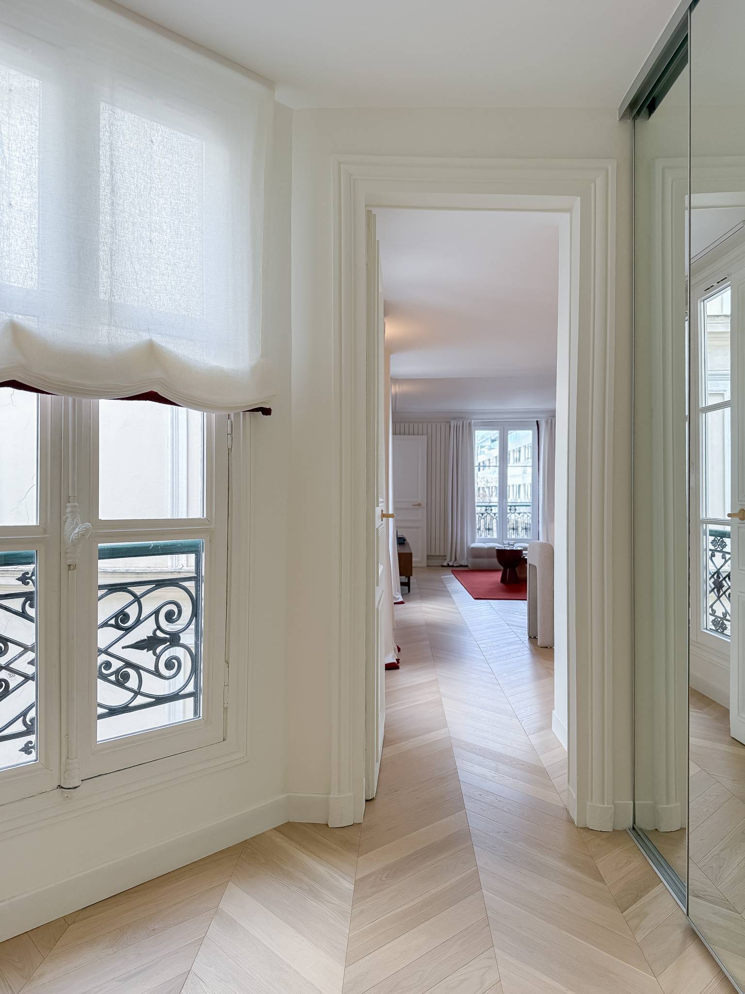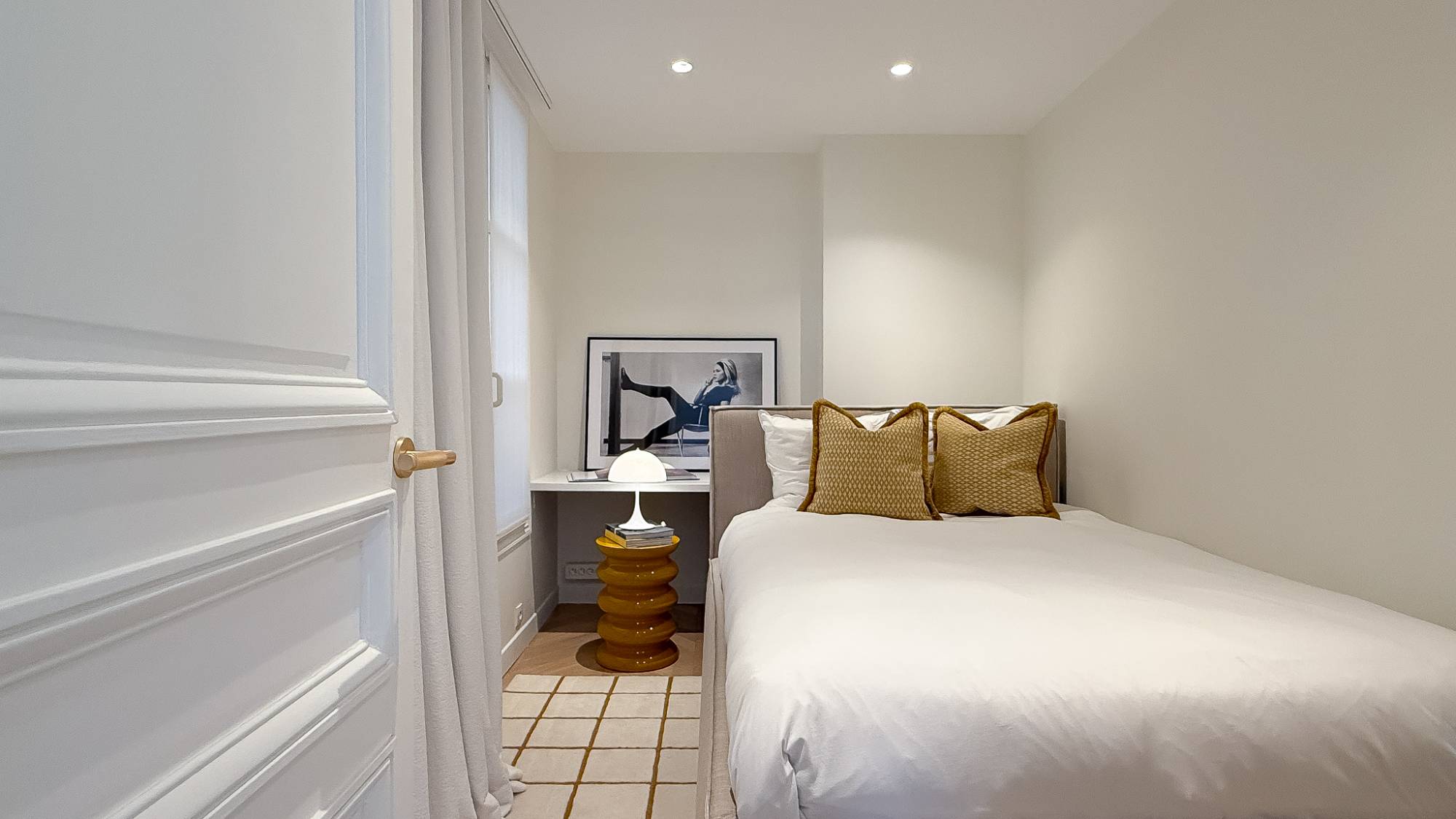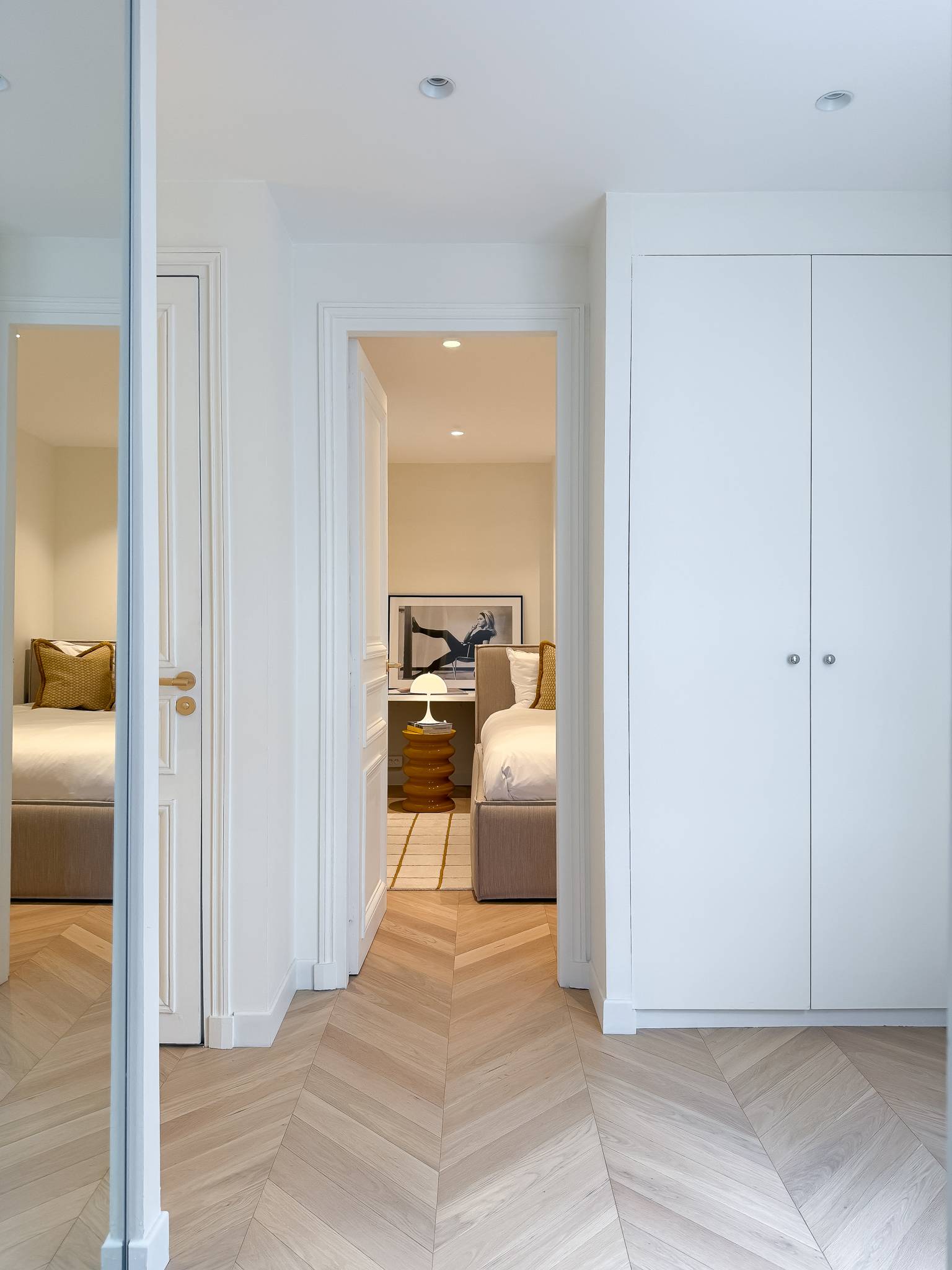 De master bedroom biedt rust en privacy. De tweede slaapkamer is momenteel ingericht als volwaardige slaapruimte, maar kan perfect worden benut als bureelruimte of home office — ideaal voor wie flexibiliteit wenst in het centrum van Parijs.
