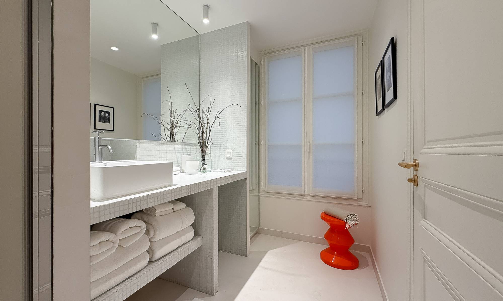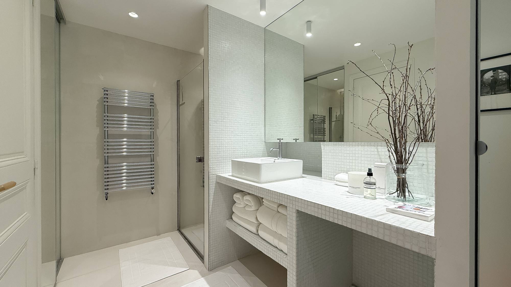 Verder beschikt het appartement over een stijlvolle douchekamer en een afzonderlijk gastentoilet.