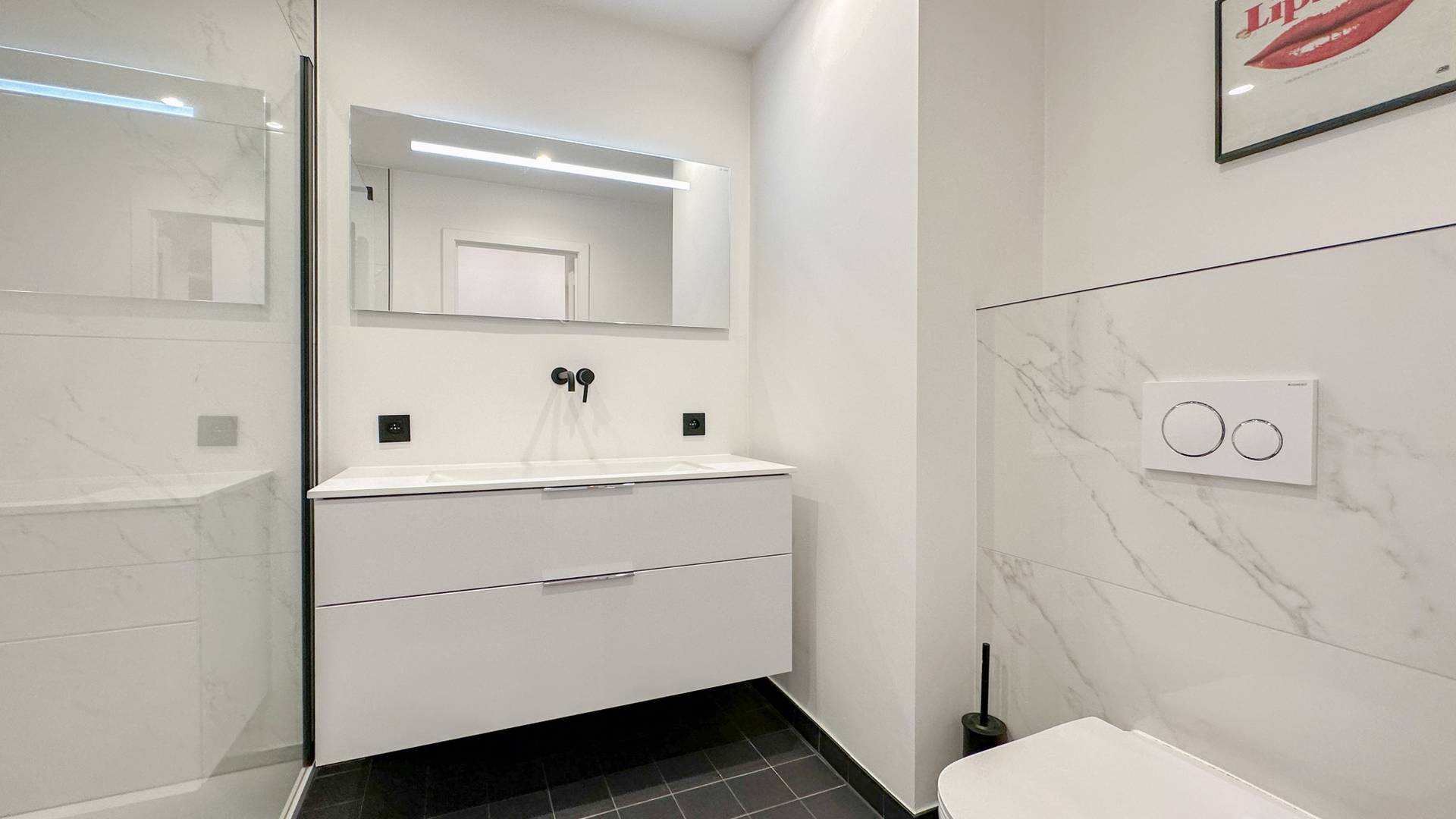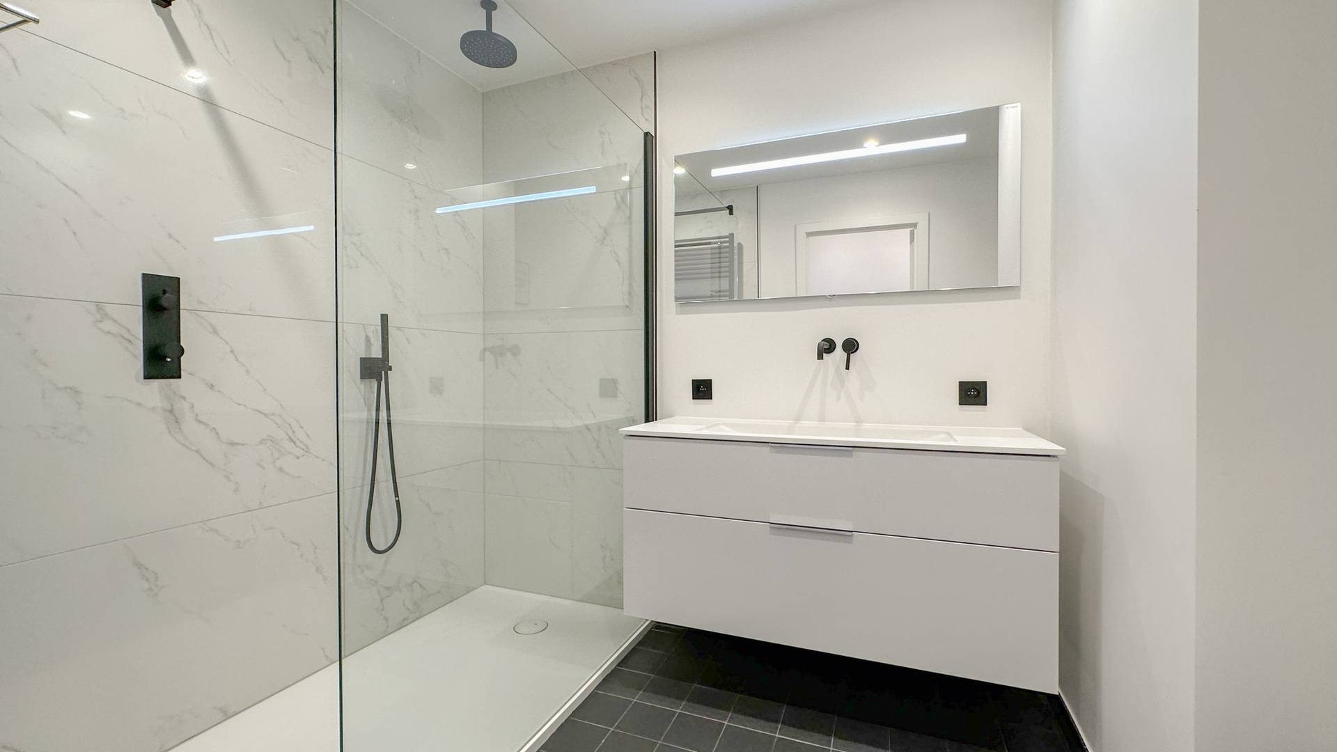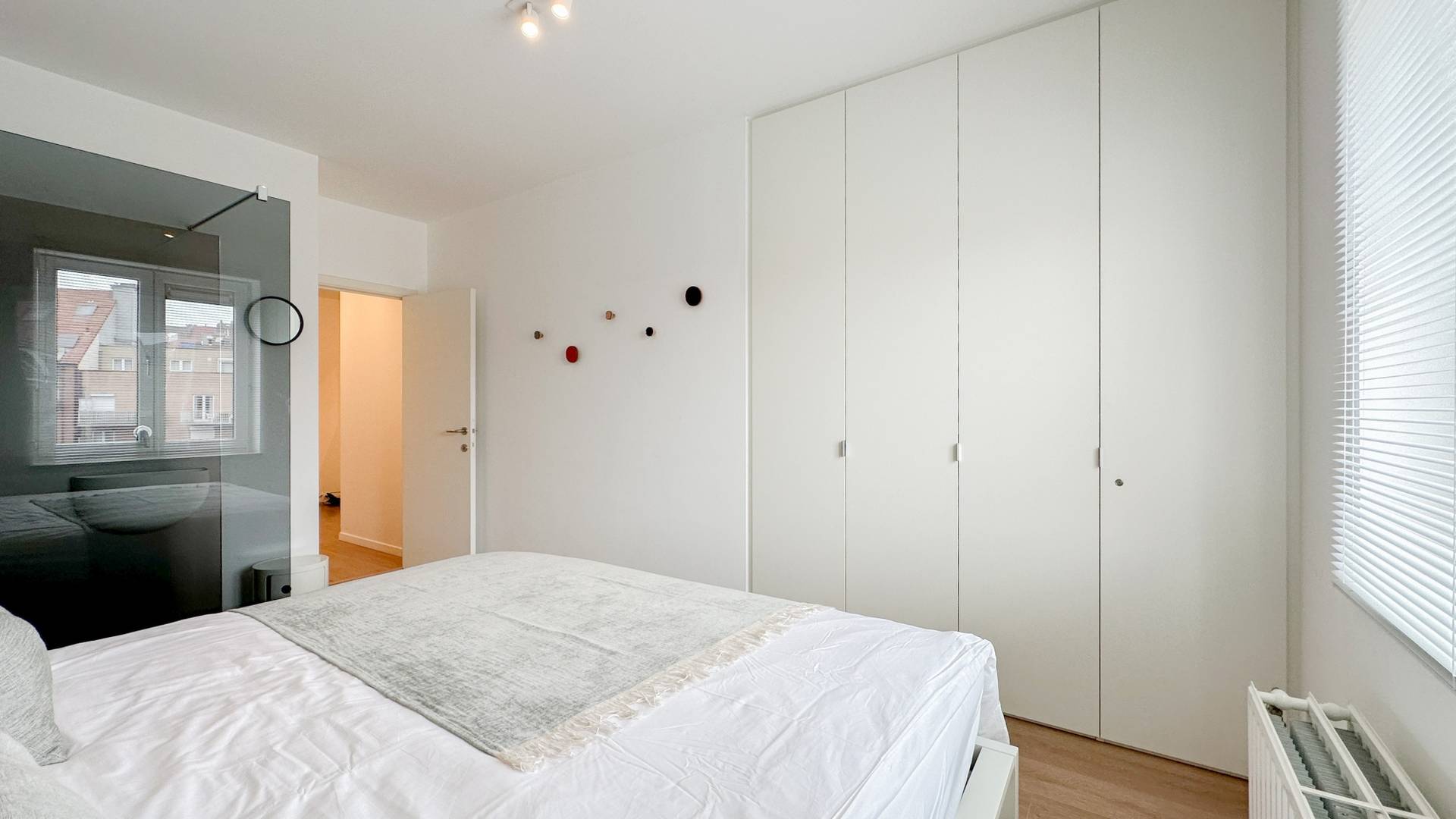 Er zijn 2 volwaardige slaapkamers. De hoofdslaapkamer beschikt over een inloopdouche, lavabo en ingemaakte kasten. Er is een badkamer met inloopdouche, dubbele lavabo en toilet.