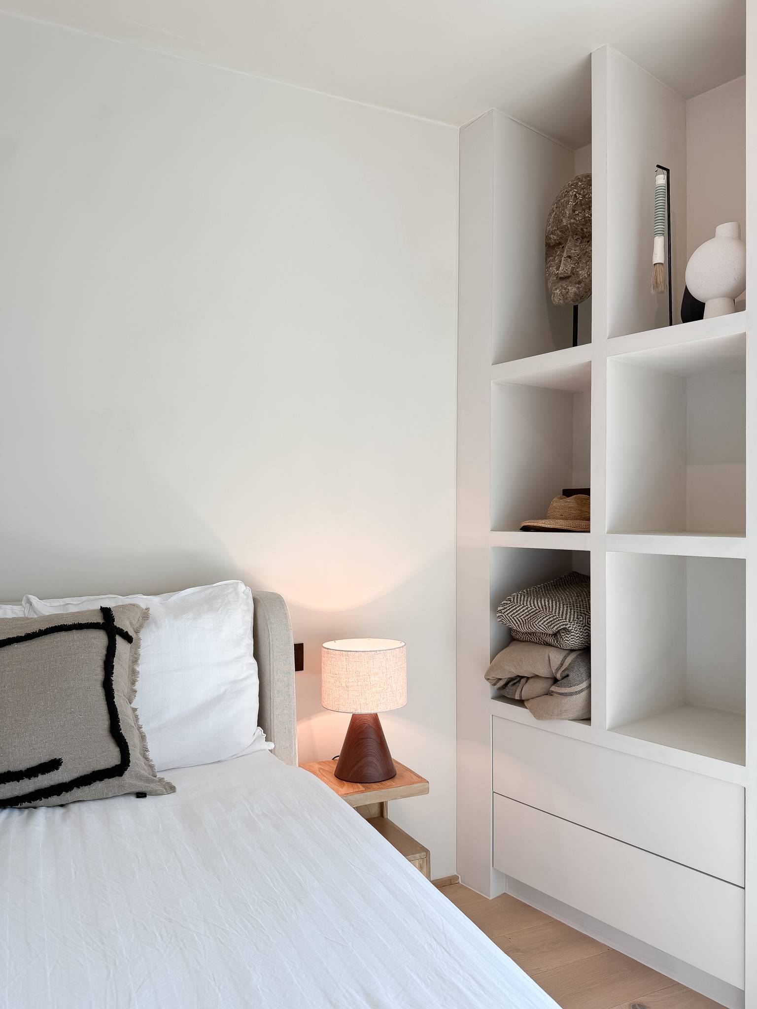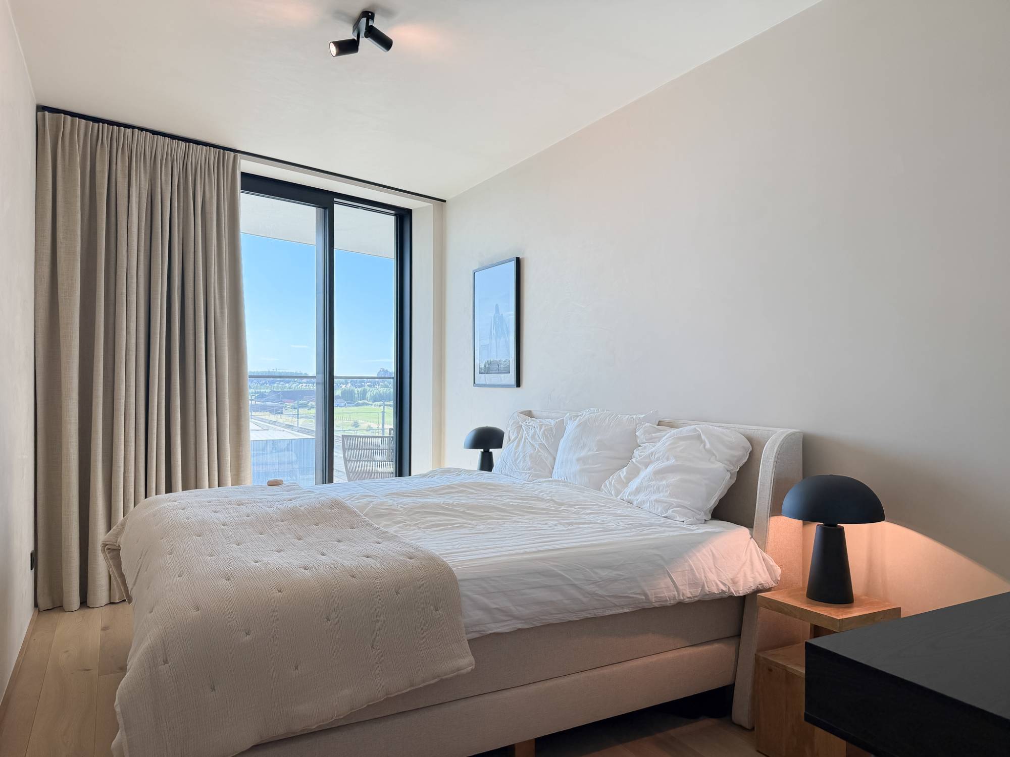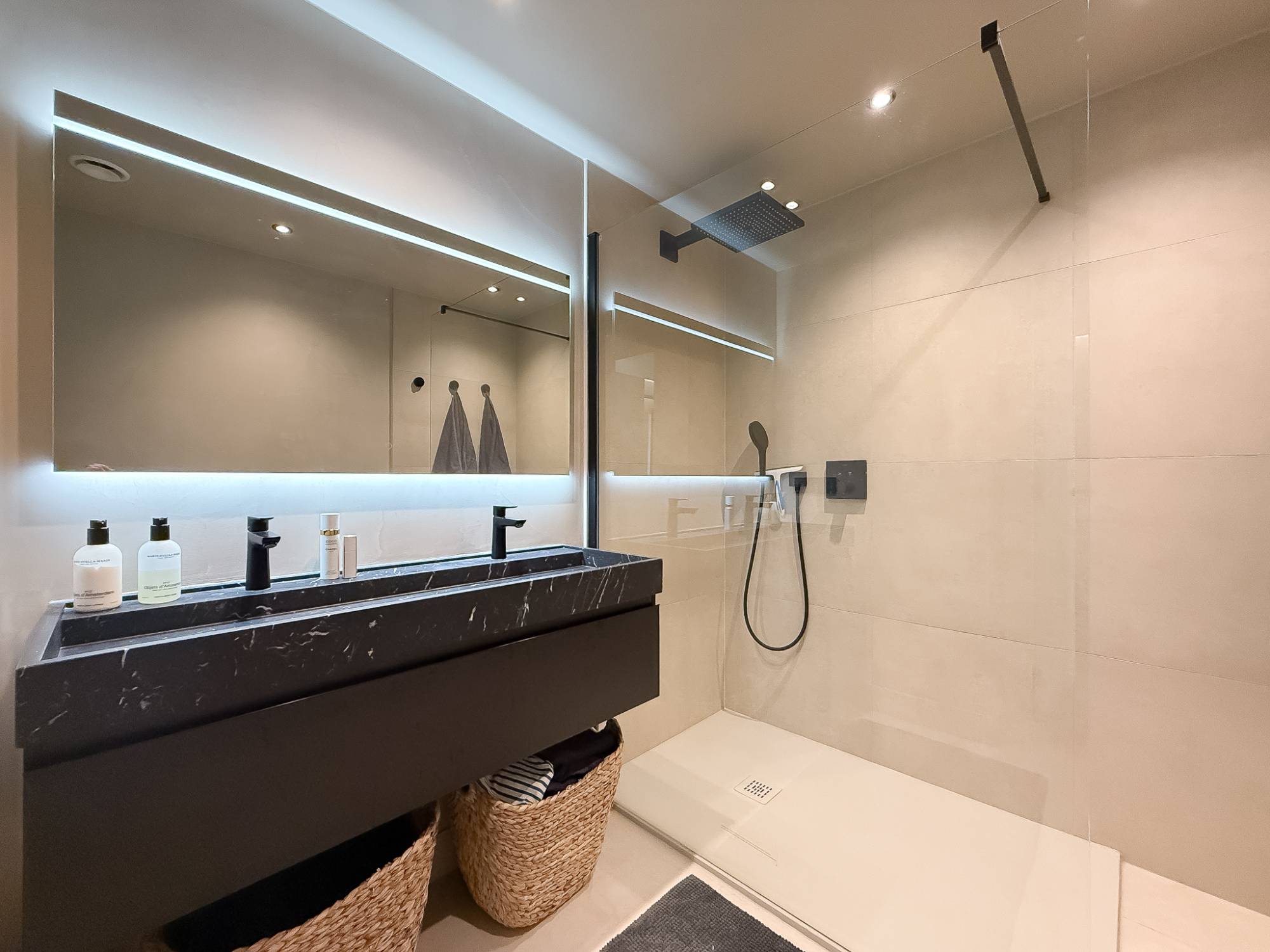 Het appartement beschikt over 2 volwaardige slaapkamers met ingemaakte kasten, beide met toegang tot het doorlopende terras. De stijlvolle douchekamer werd functioneel ingericht en afgewerkt met oog voor detail.