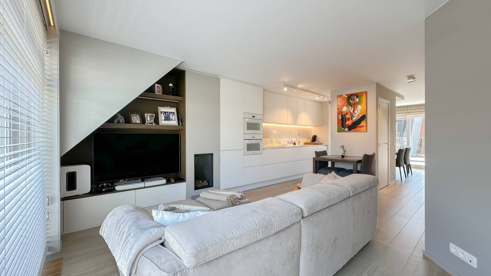 Indeling: De lift geeft rechtstreeks toegang tot het appartement. Inkom met vestiaire en gastentoilet. Woonkamer met gashaard en toegang tot het eerste terras. Open keuken voorzien van Miele-toestellen. Lichtrijke eetkamer met ingemaakte kasten, bureauhoek en toegang tot het zuidgericht terras. Deze eetkamer was oorspronkelijk een slaapkamer en kan gemakkelijk terug afgesloten worden. Aparte douchekamer.