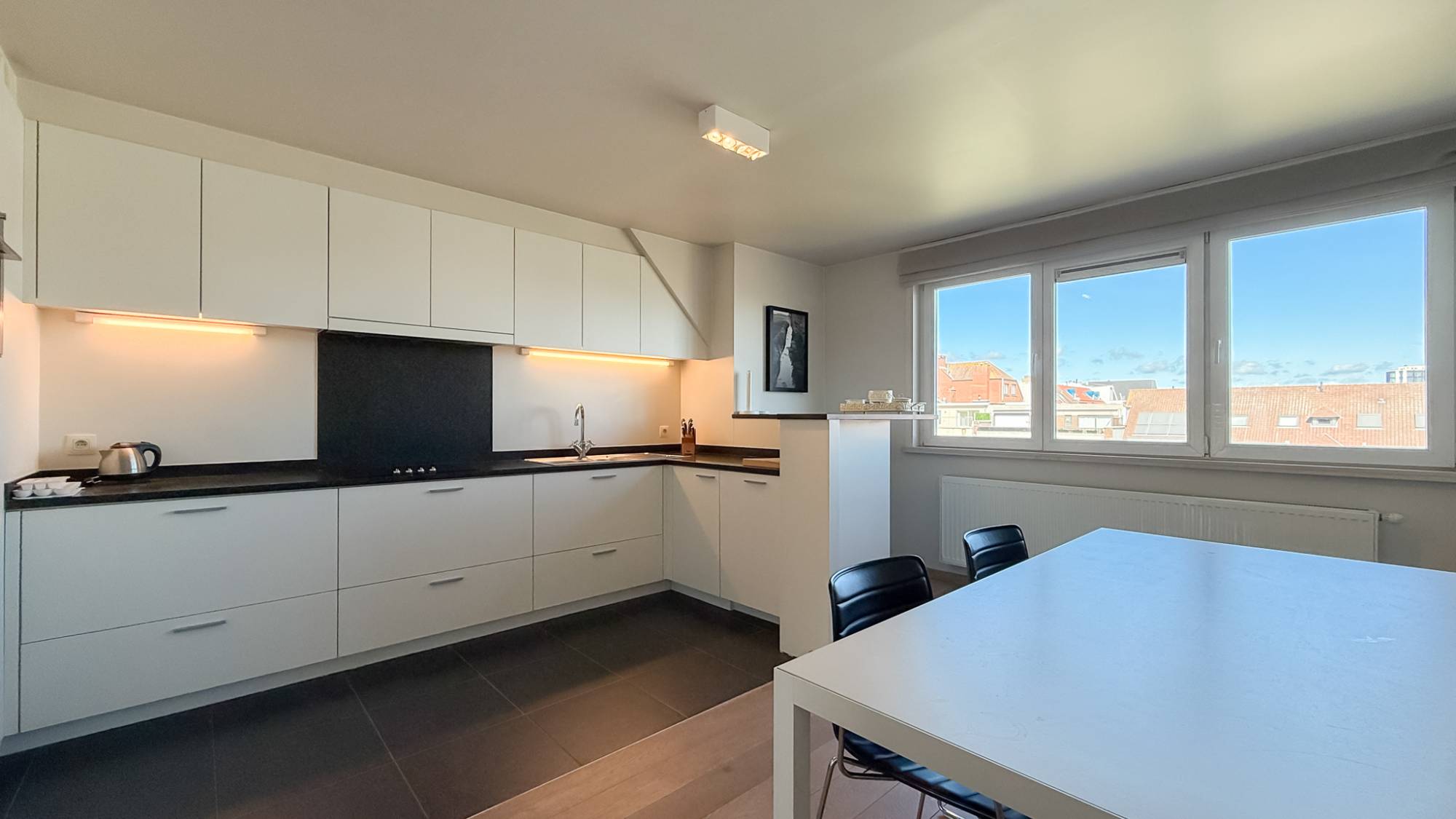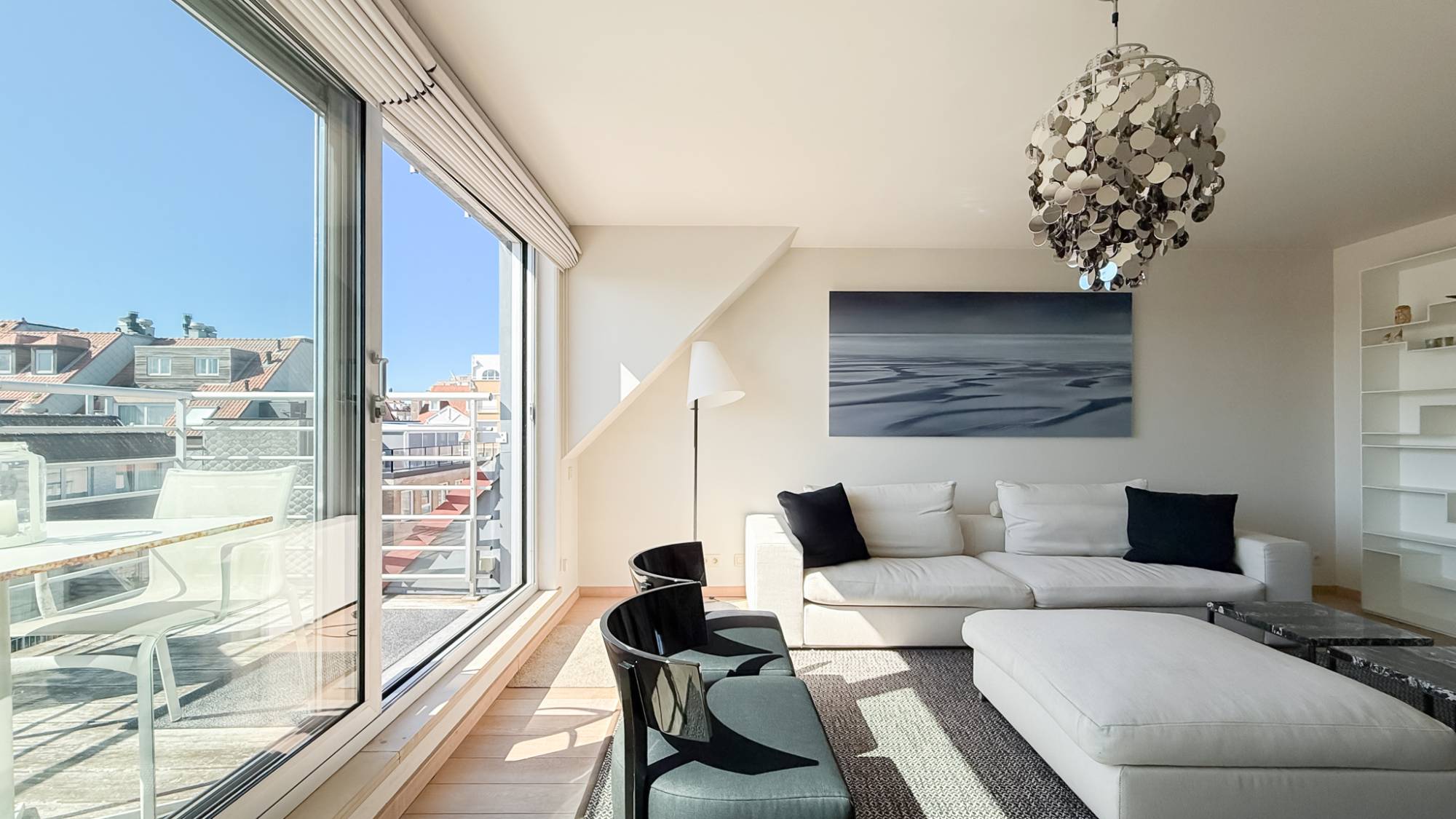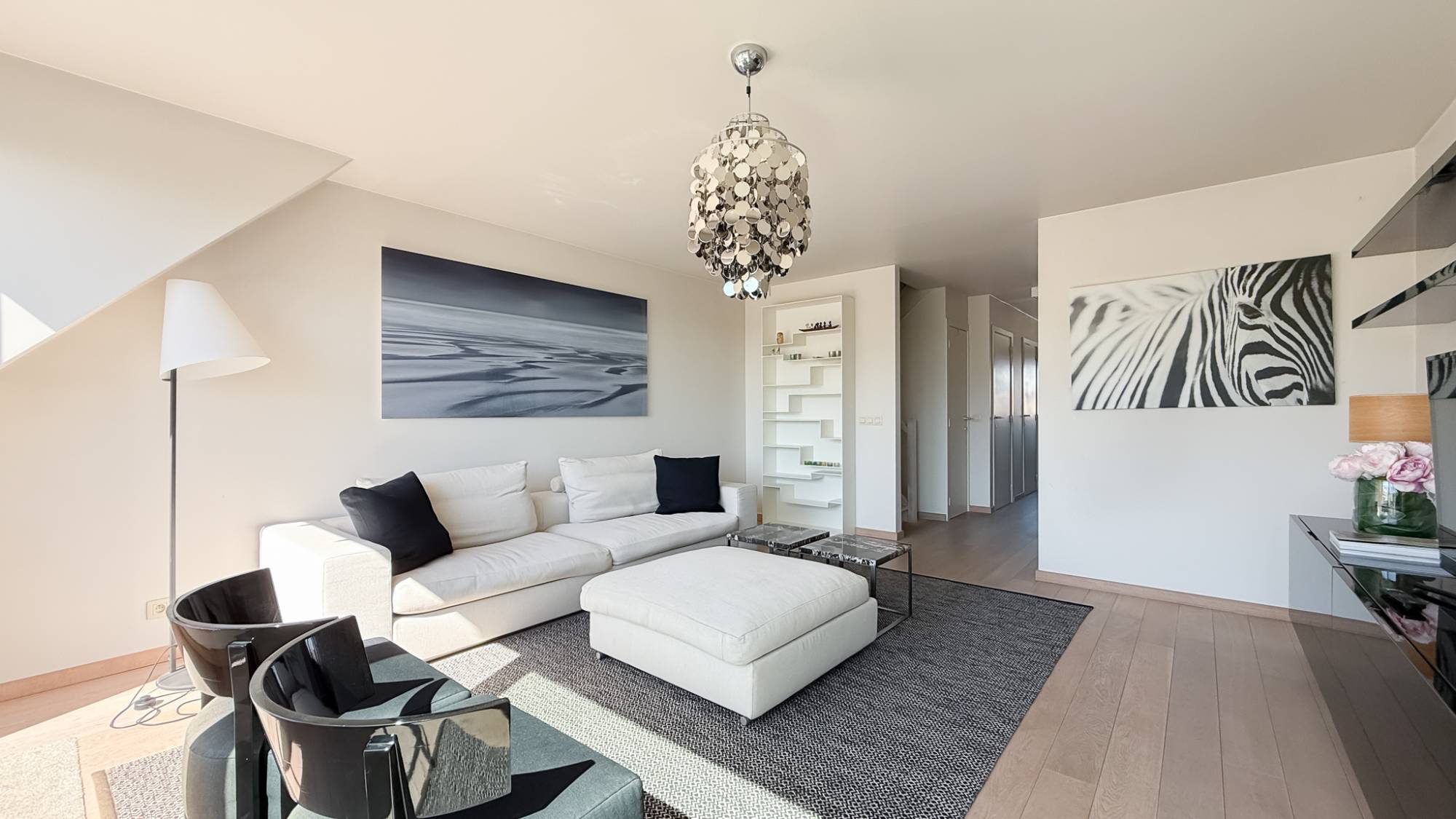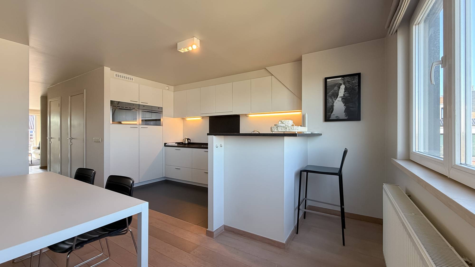 De inkomhal met vestiaire, bergruimte en gastentoilet leidt naar de lichtrijke leefruimte die uitgeeft op een aangenaam terras. Aan de andere zijde van het appartement bevindt zich de ruime keuken, voorzien van alle comfort en met een uniek panorama over het park.