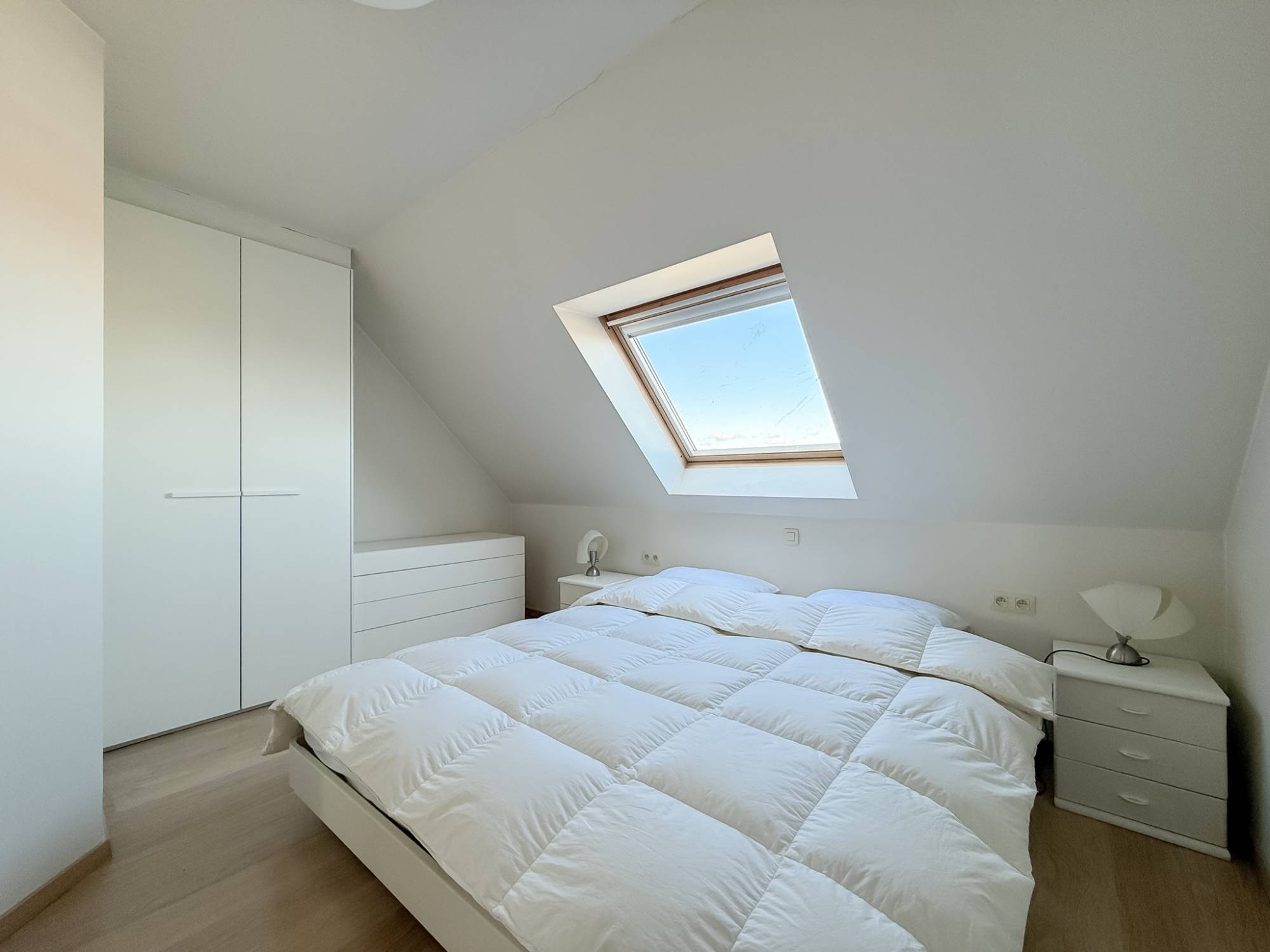De verdieping telt 2 volwaardige slaapkamers, een badkamer en een aparte douchekamer.