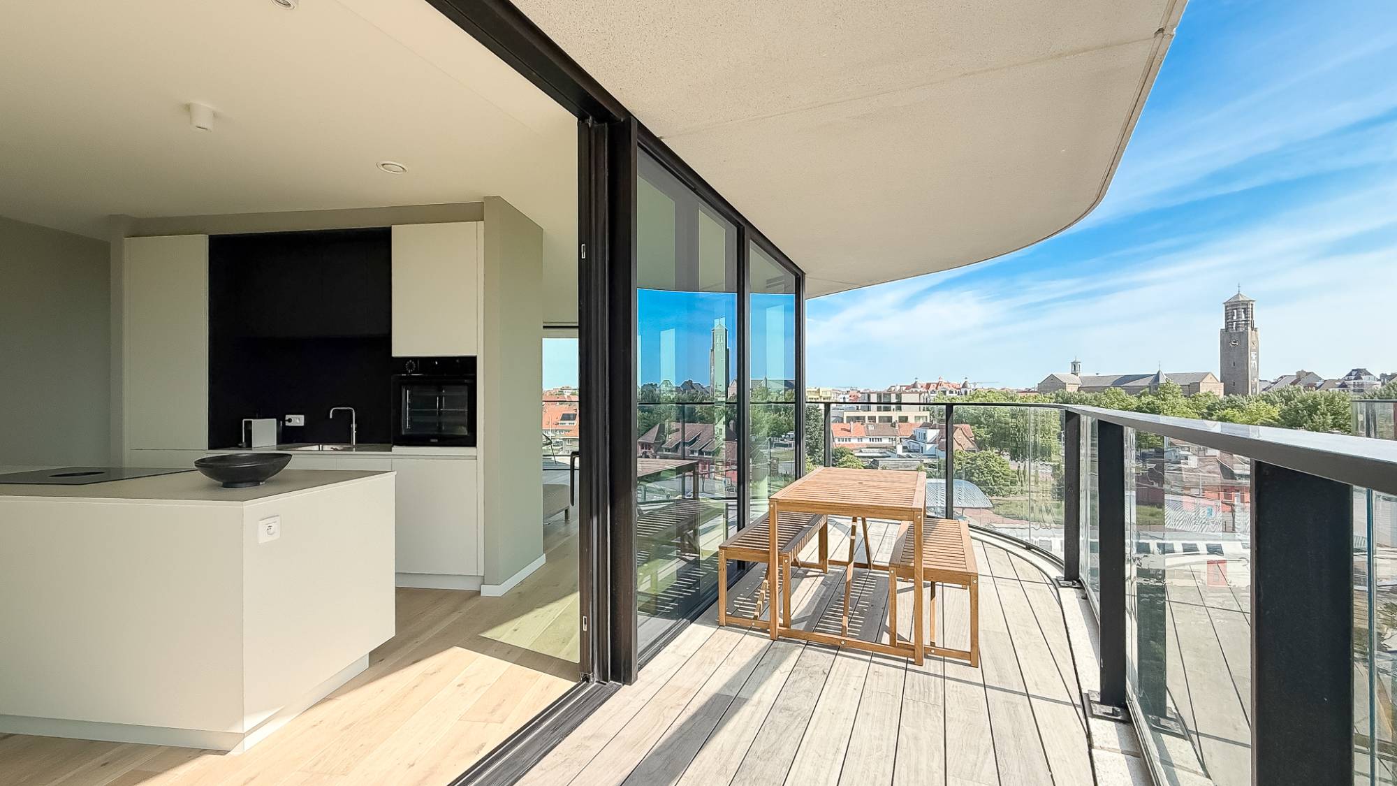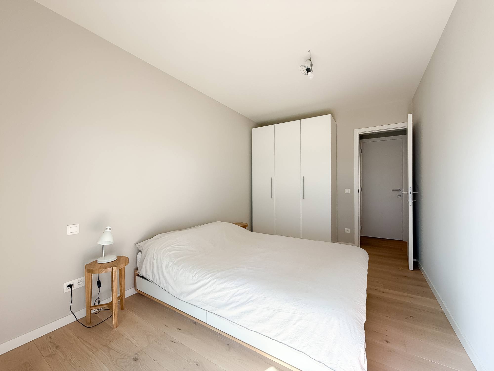 Het appartement, gelegen op de vierde verdieping, geniet van een uitzonderlijke lichtinval dankzij de grote raampartijen en de doorlopende terrassen die elke ruimte omringen. De inkomhal met gastentoilet leidt naar de ruime en lichtrijke woonkamer. De open keuken met centraal keukeneiland vormt het hart van de woning en sluit naadloos aan op de eetruimte. Berging. Beide slaapkamers geven uit op het terras en bieden een gevoel van rust en ruimte. De luxueus afgewerkte badkamer is voorzien van een ligbad, een inloopdouche en een dubbele wastafel.