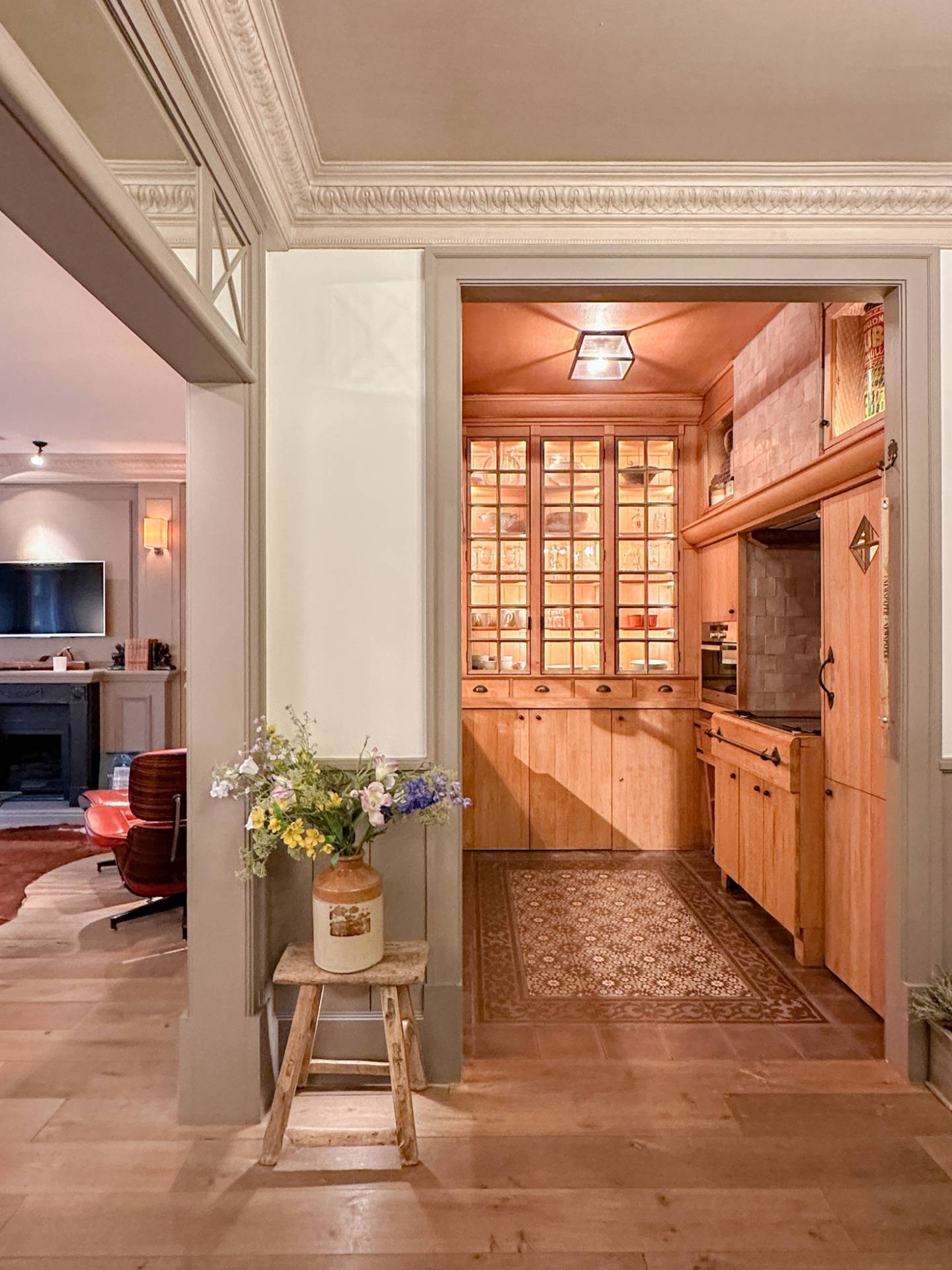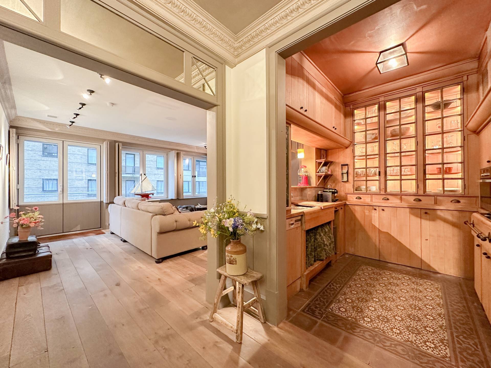 Samenstelling: Inkomhal met vestiaire. Woonkamer met open haard en lambrisering, uitgevend op een gezellig, zonnig terrasje. Praktisch ingerichte keuken, voorzien van Miele huishoudtoestellen. Aansluitend bevindt zich de eethoek.