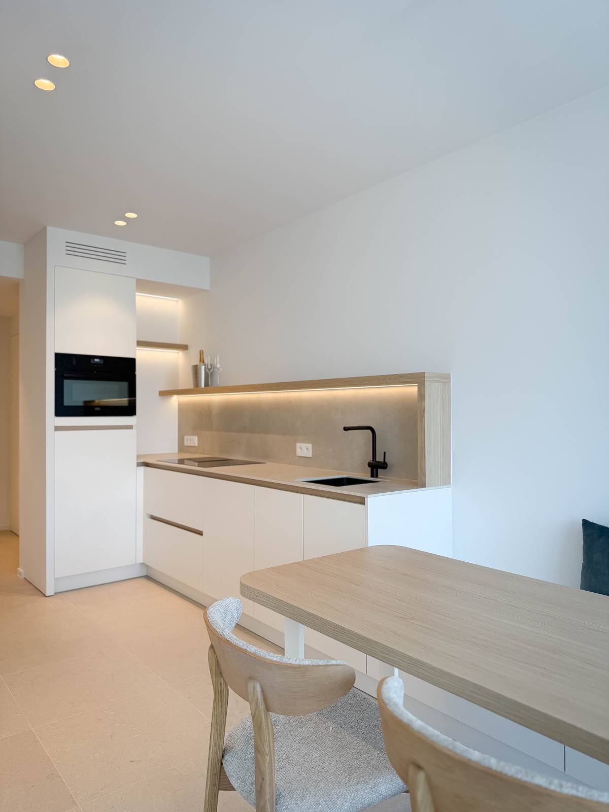 Indeling: Elegante inkomhal met gastentoilet en praktische berging. De lichtrijke leefruimte is een toonbeeld van klasse: een sfeervolle woonkamer, volledig bemeubeld met maatwerk van topkwaliteit, sluit naadloos aan op een luxueus afgewerkte open keuken, ontworpen tot in de kleinste details. Bijzonder aangenaam terras over de volledige gevelbreedte.