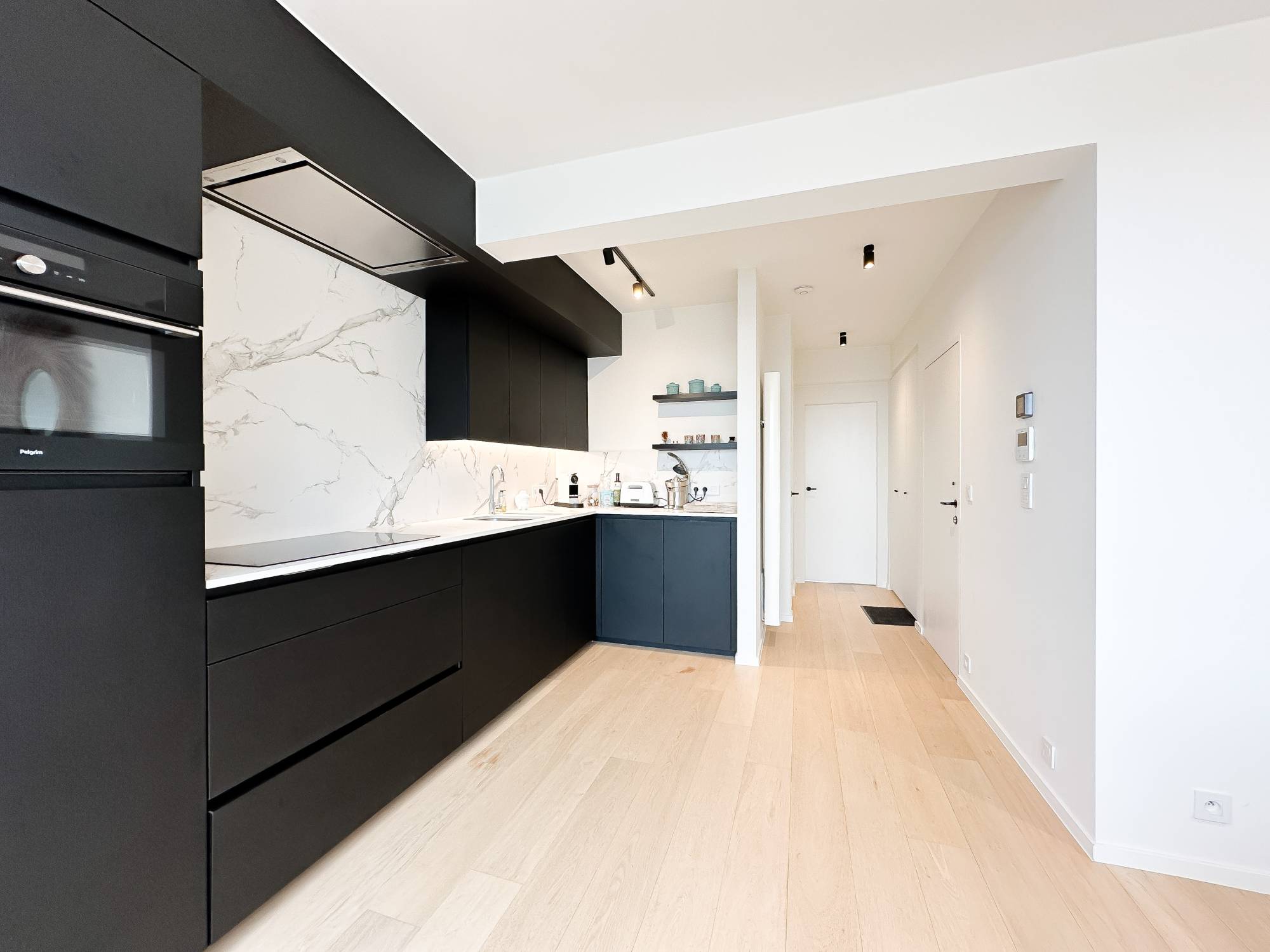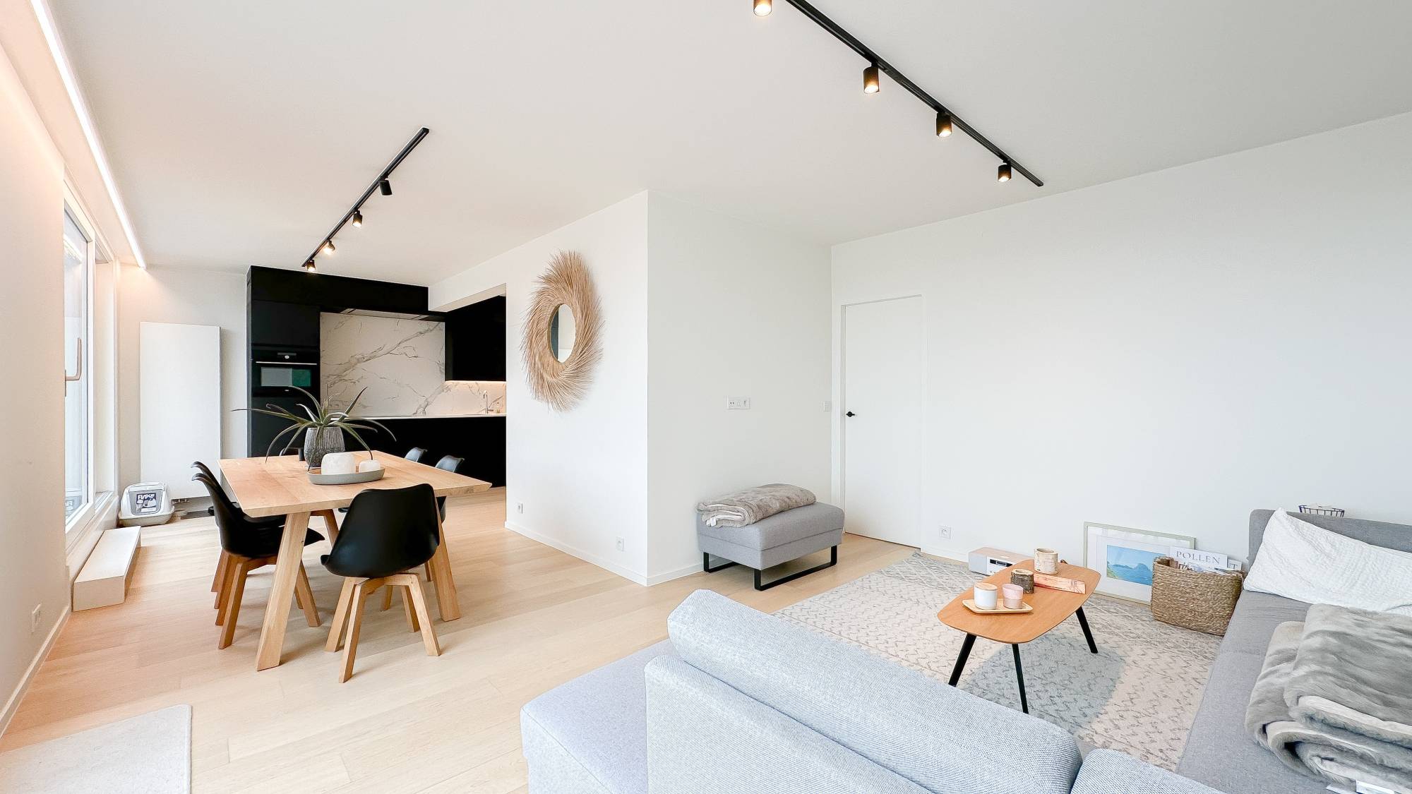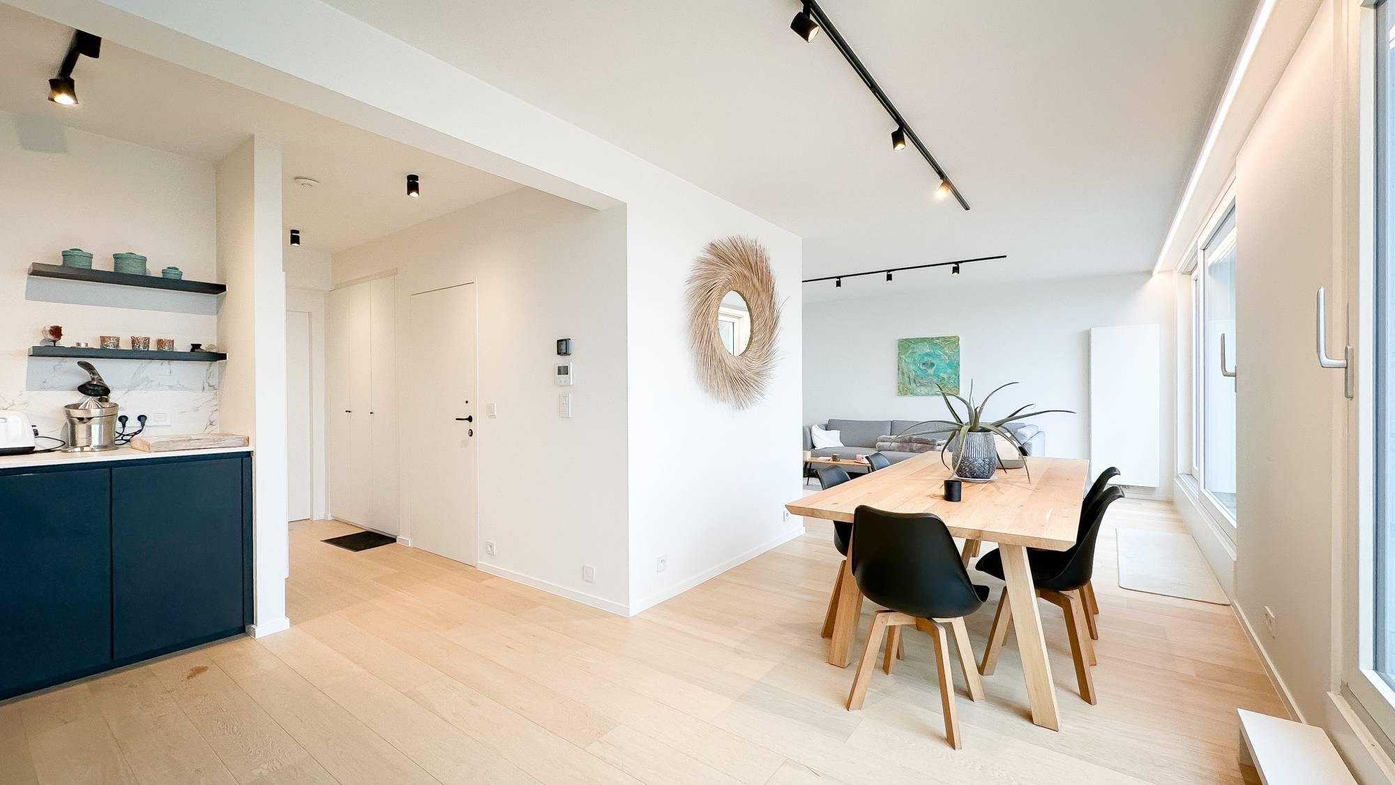 Indeling: Lichtrijke woonkamer die uitkomt op het terras, bereikbaar via 2 grote schuiframen. Volledig uitgeruste keuken met alle moderne comfort. Gezellige eethoek. Er zijn 2 volwaardige slaapkamers, voorzien van ingebouwde kasten, en elke kamer heeft een eigen ensuite douchekamer. Beide slaapkamers openen naar een ruim terras aan de achterzijde. Het appartement is hoogwaardig afgewerkt met vernieuwde ramen, indirecte verlichting, en de Mortex-techniek in de doucheruimtes.