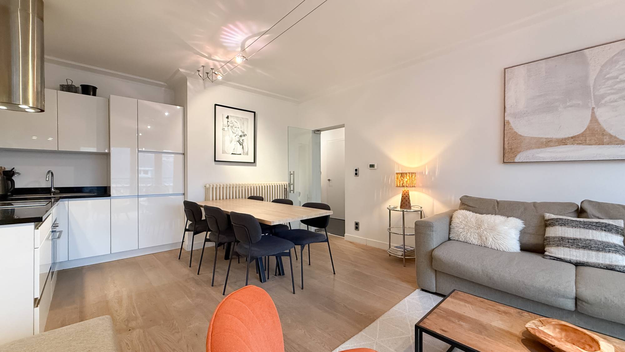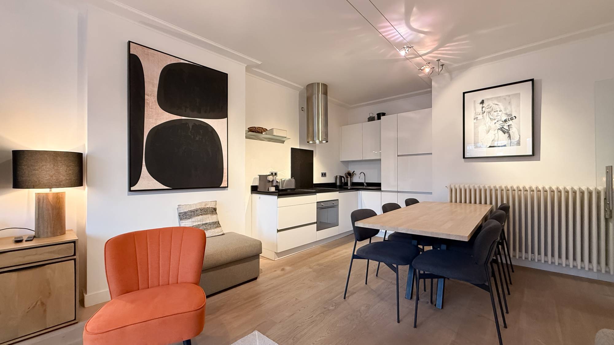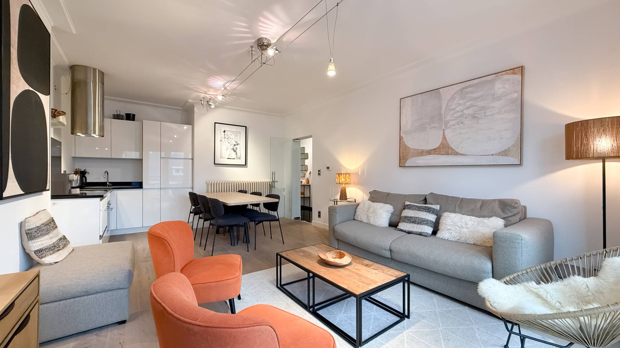 Inkomhal met gastentoilet en praktische vestiaire. De zonnige woonkamer, die uitgeeft op een aangenaam terras met vrij uitzicht, vormt het hart van het appartement. De aansluitende eethoek creëert een warme en gezellige leefruimte.