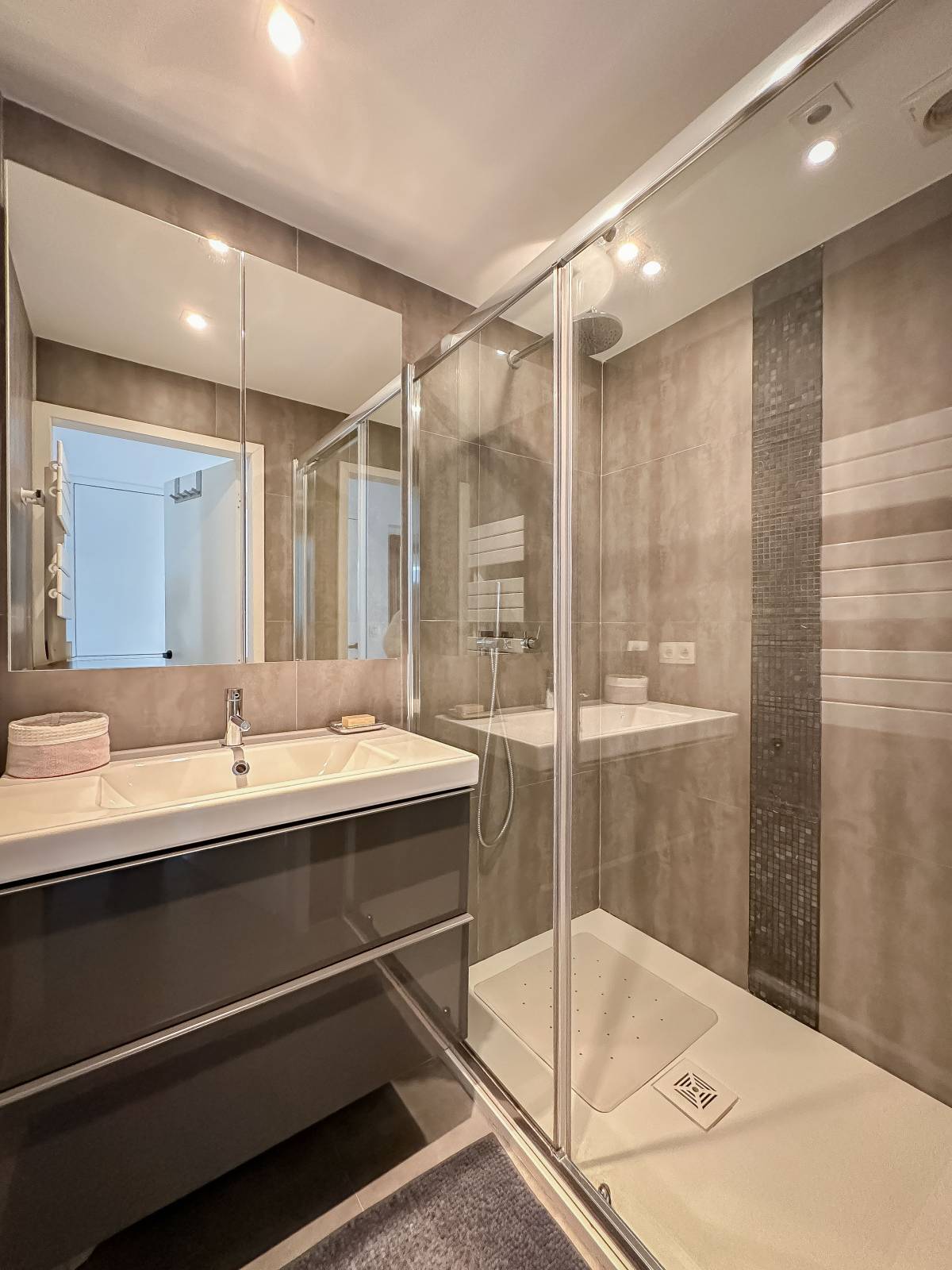 Het appartement beschikt over twee volwaardige slaapkamers, beide met voldoende opbergruimte en grote ramen die zorgen voor een aangename lichtinval. Beide kamers geven uit op een terras aan de achterzijde. De moderne douchekamer is voorzien van alle comfort en een stijlvolle afwerking.