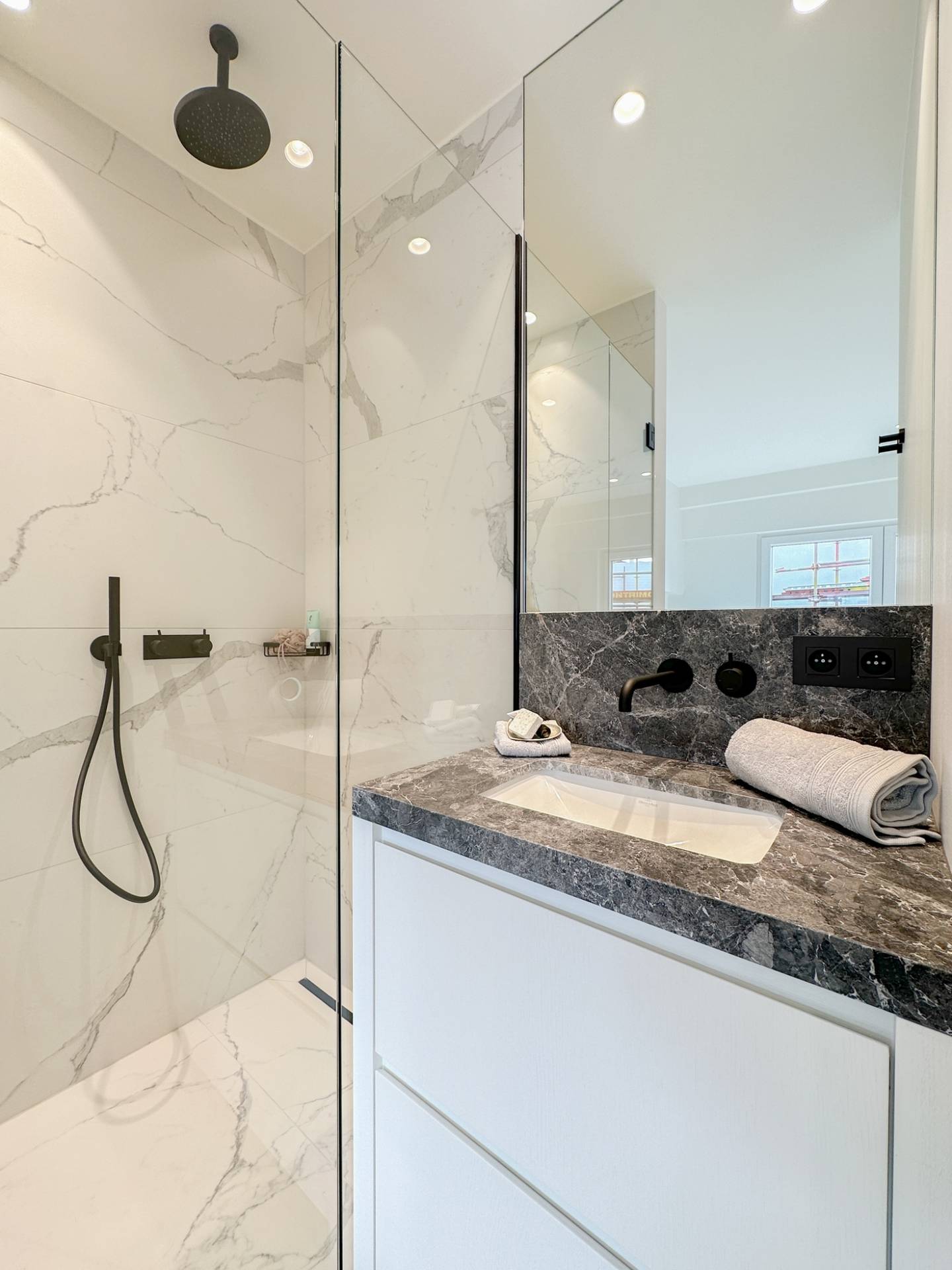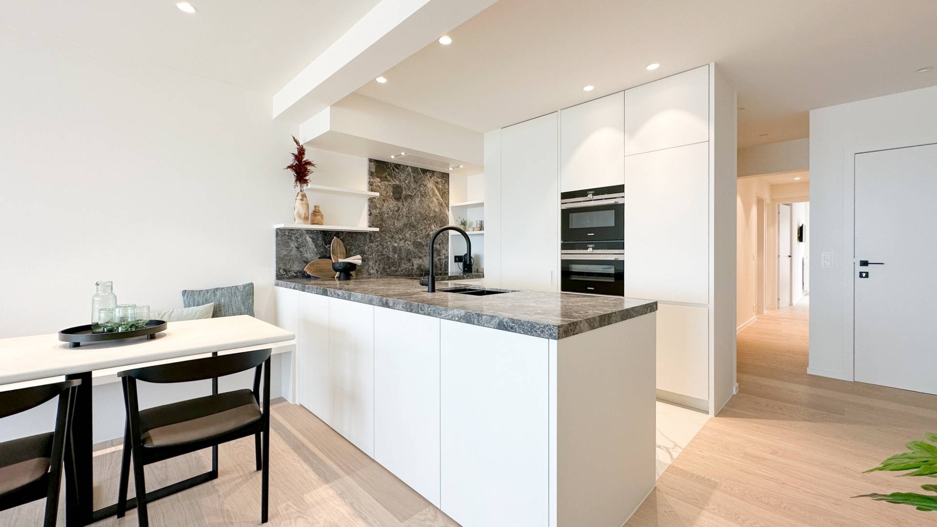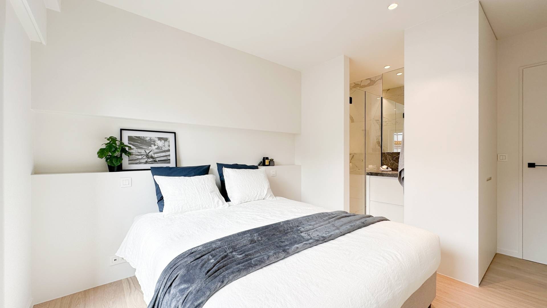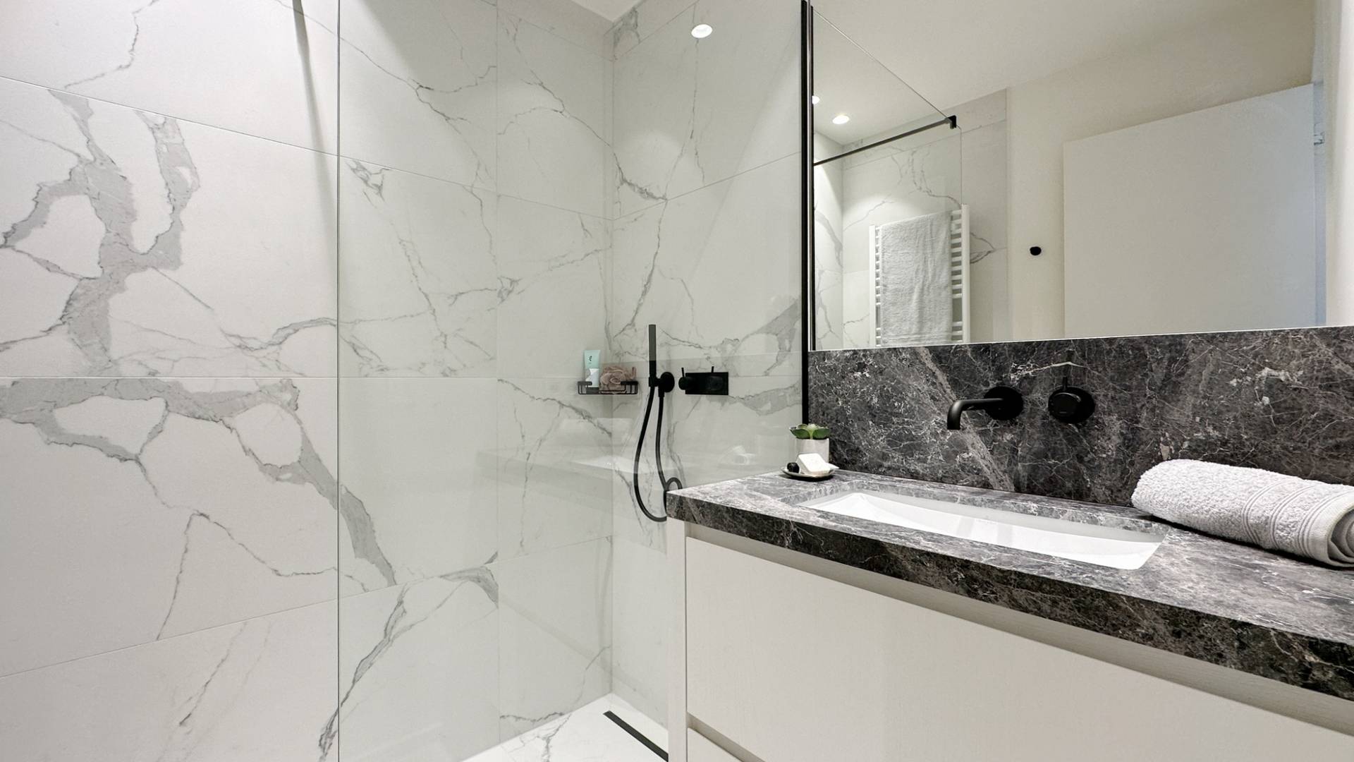 Achteraan bevindt zich de master bedroom met ensuite douchekamer en ingemaakte kleerkast. Alsook een kleinere slaapkamer en een tweede douchekamer.